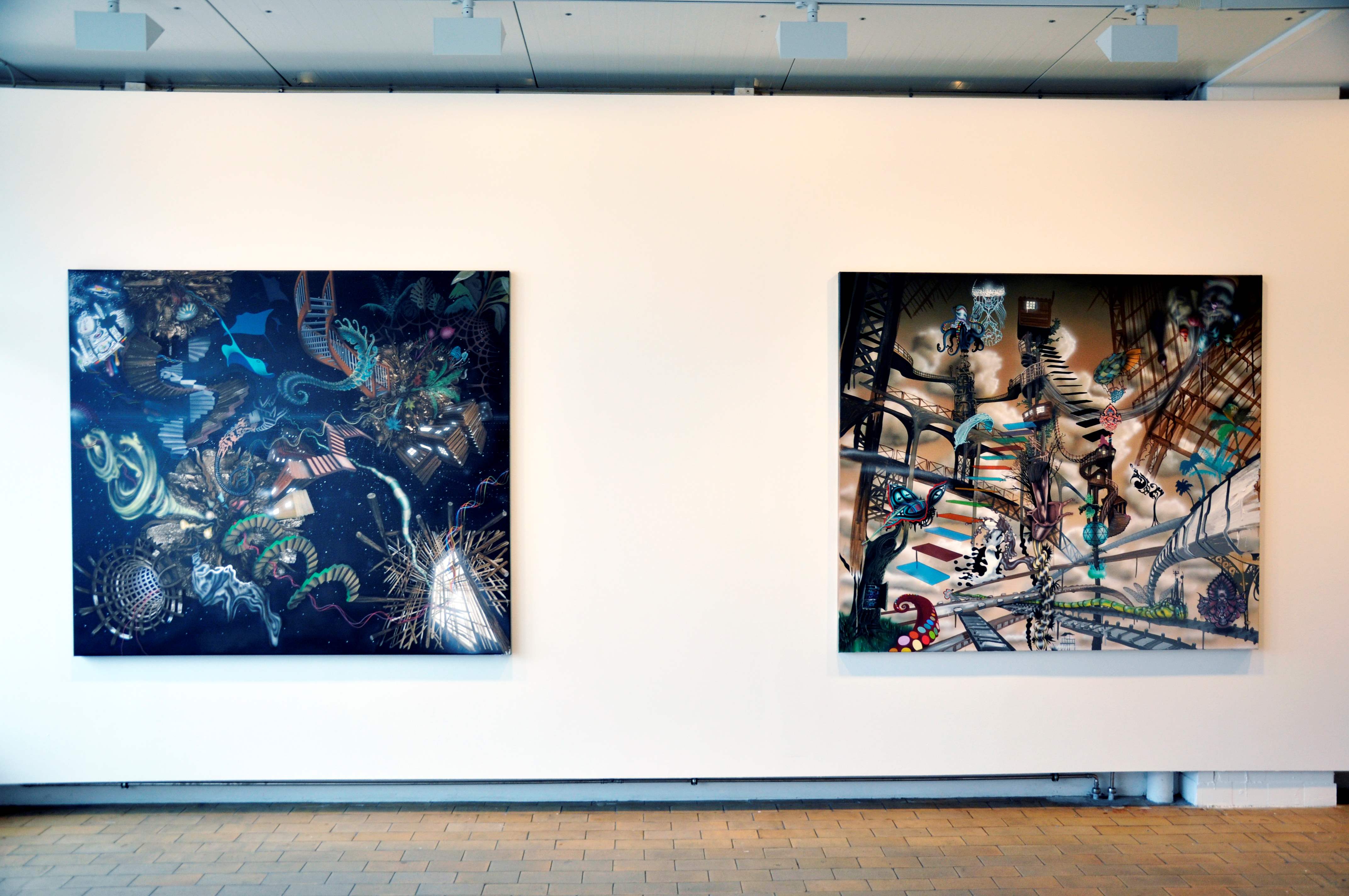 Jonas Pihl´s work revolves around certain paradoxical themes, such as: The Analogue and the digital, Nature and machine, Random and determinism, Chaos and cosmos and the point where the two collide and amalgamates into ”Chaosmos”. The paradox creates a tension between the two opposites, and paradoxically there is often a disturbing undertone in the otherwise lively imagery. The insecurity connected to the lack of spatial orientation in the paintings challenges the viewer’s perception.