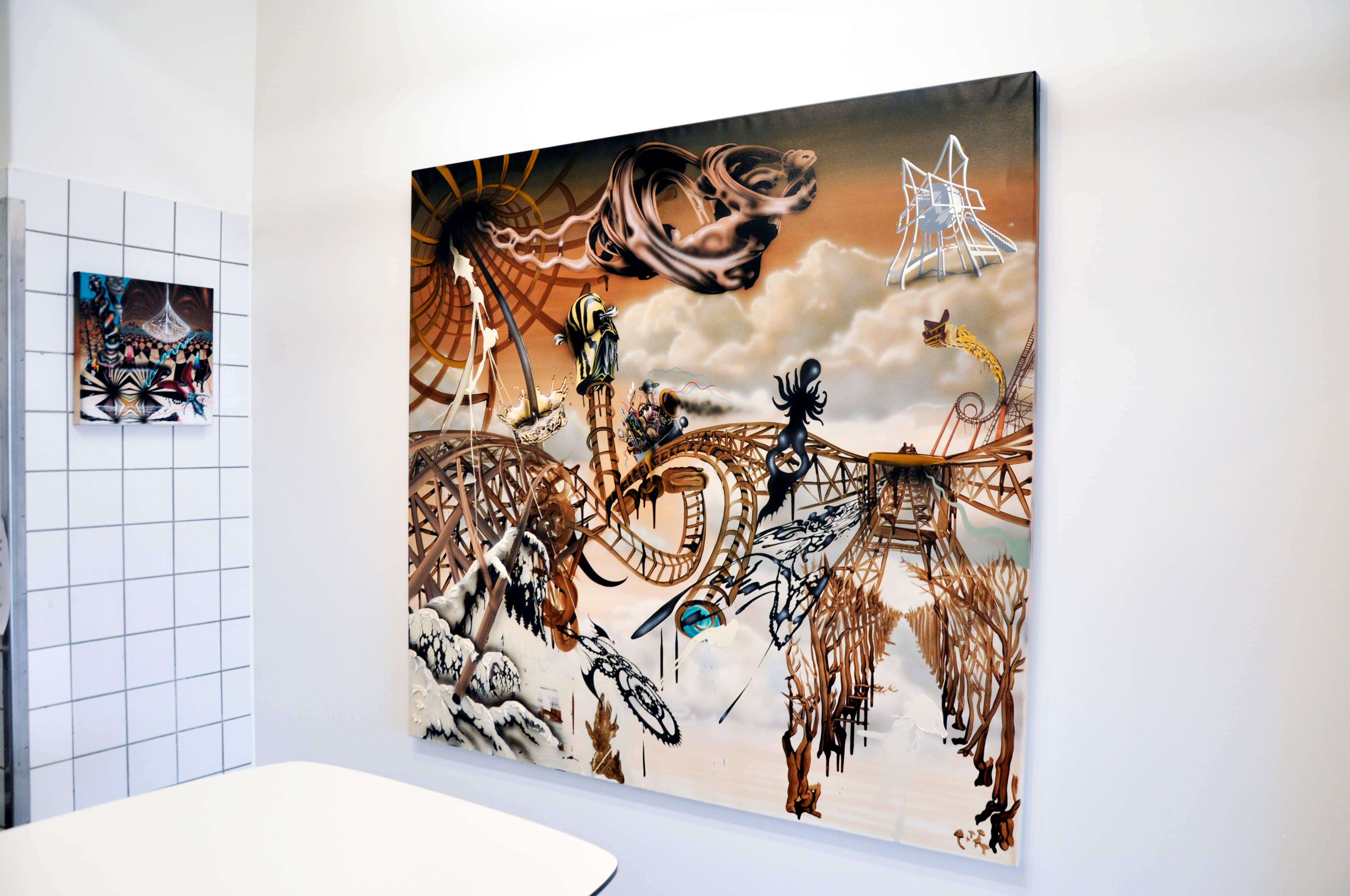 The deterministic aspect comes in when the turbulence of the paint is controlled or tightened up further in the proces. Some elements are erased, others enhanced, and when looking at the final result, it is hard to comprehend the chronology of the proces as background turns into foreground and vice versa. The splash jets of paint are often being mimicked and painted up meticulously which offers a meta layer and forms a paradox in the time aspect of the proces of painting. The trompe l´oeil splash is time consuming in the making opposed to the quick gesture of the splash of paint being thrown on a canvas. Immanent in that notion is the very essence of what a picture is: A snapshot of a single moment. A still image. A frozen explosion.