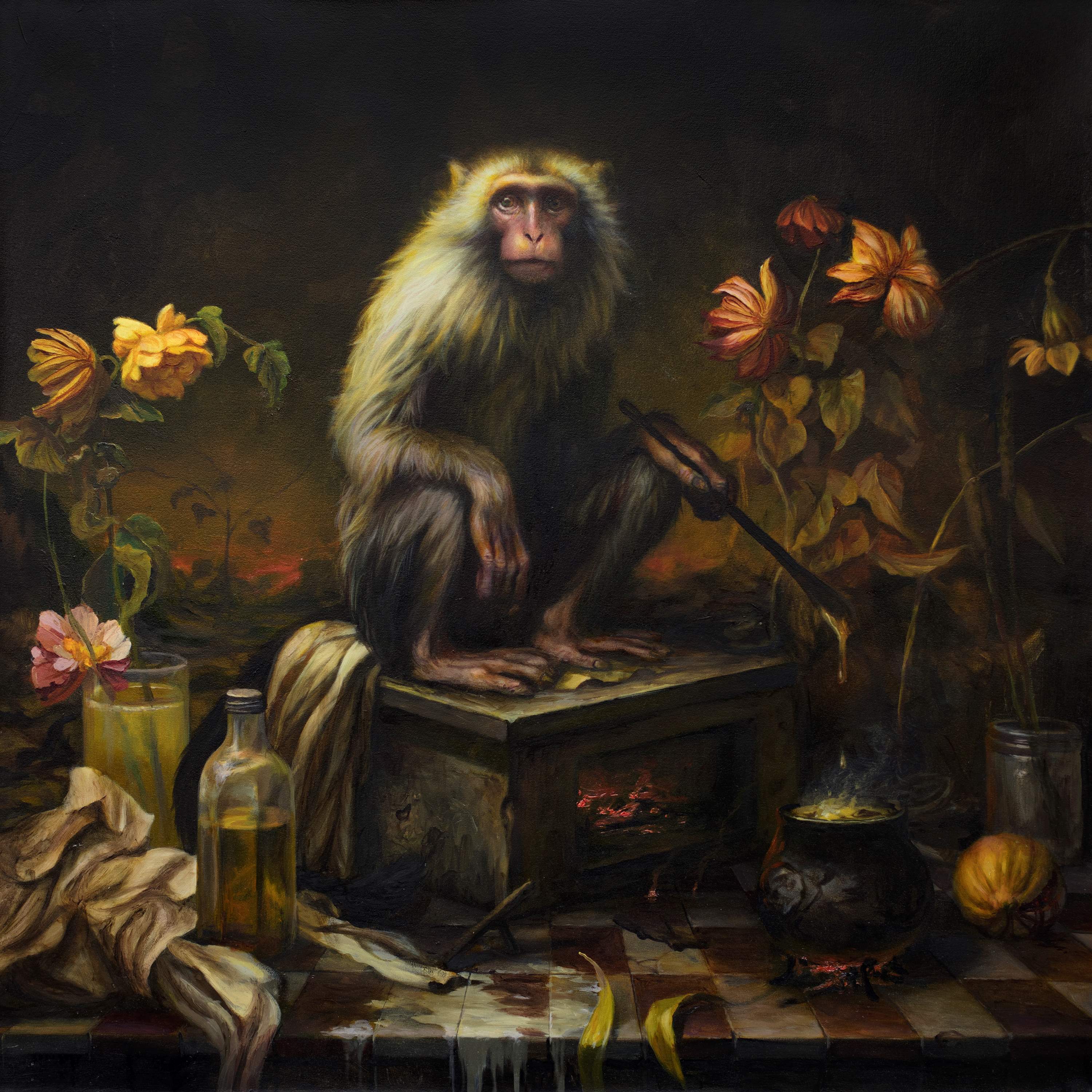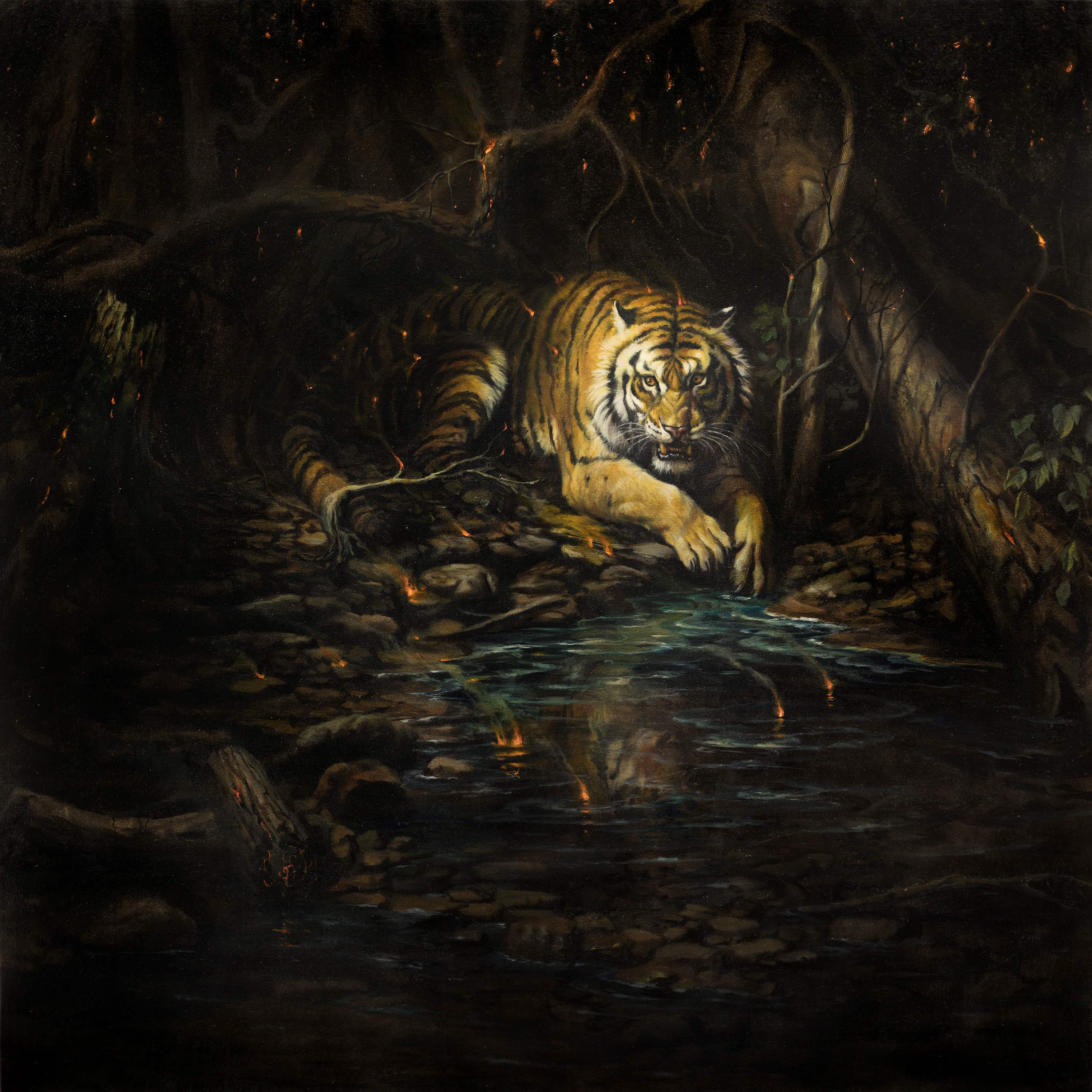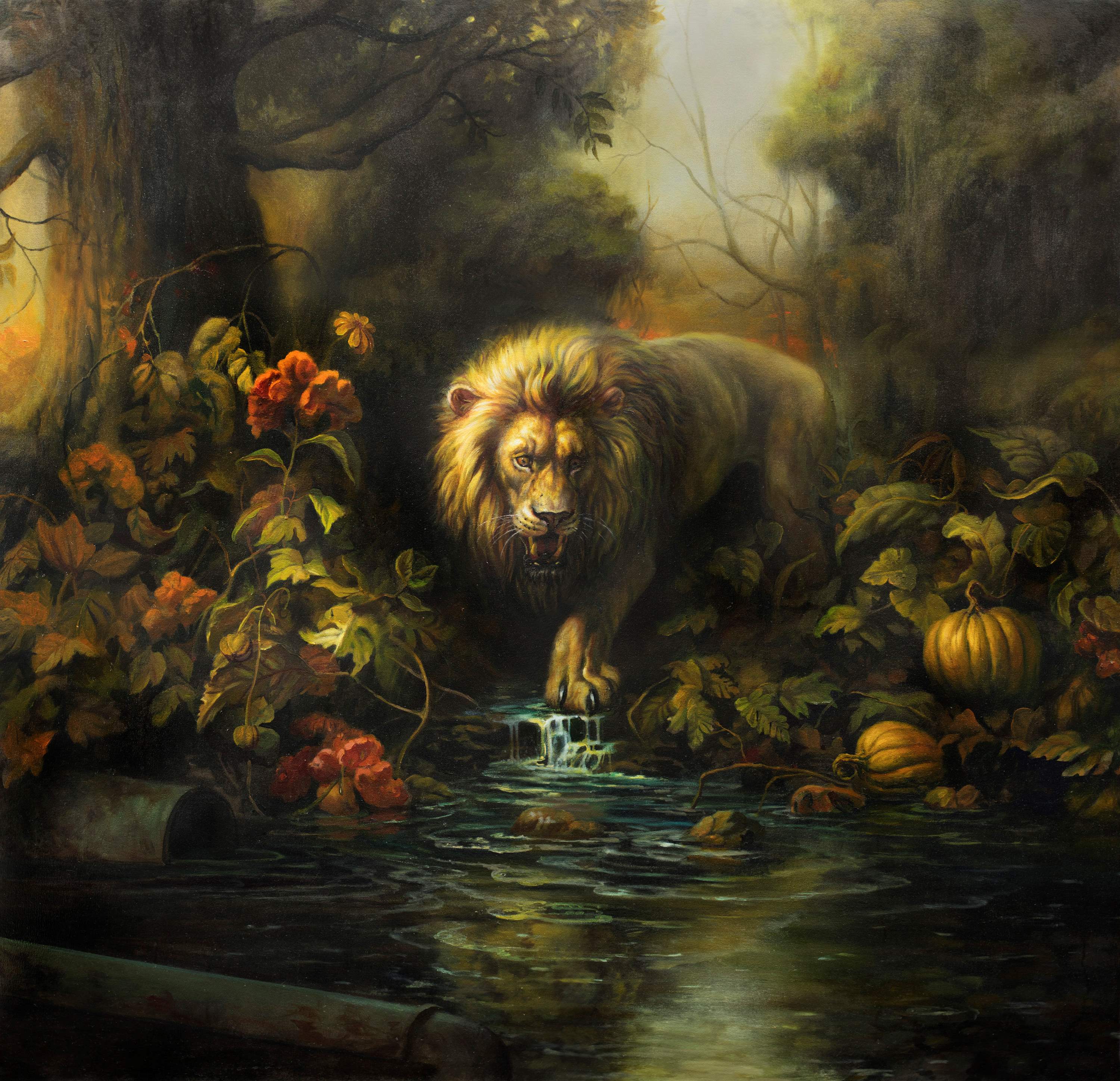 An example of Wittfooth’s use of allegory and symbolism to create visual stories can be seen in the painting Reflecting Pool, where a wild lion searches for its reflection in a dark pool of water, while subtle pipes hint at the lion’s survival in a polluted world. The sky is foggy and red-glowing. In another work, Shelter, Wittfooth shows us a nature-based mysticism, with a tiger seeking shelter under a tree near a pond. There’s an electric tension in the air, and we are left wondering whether what we see are embers about to ignite or a symbolic comment on the tiger's inner nature. In The Alchemist, a monkey takes on the artist’s role in society, reflecting Wittfooth’s own approach to casting a wide lens on our collective condition through his art. Since 2014, Wittfooth has been working to portray animals as shamanic figures, totems, or sacred icons, and we see a continued deepening of this theme in his new series of works.