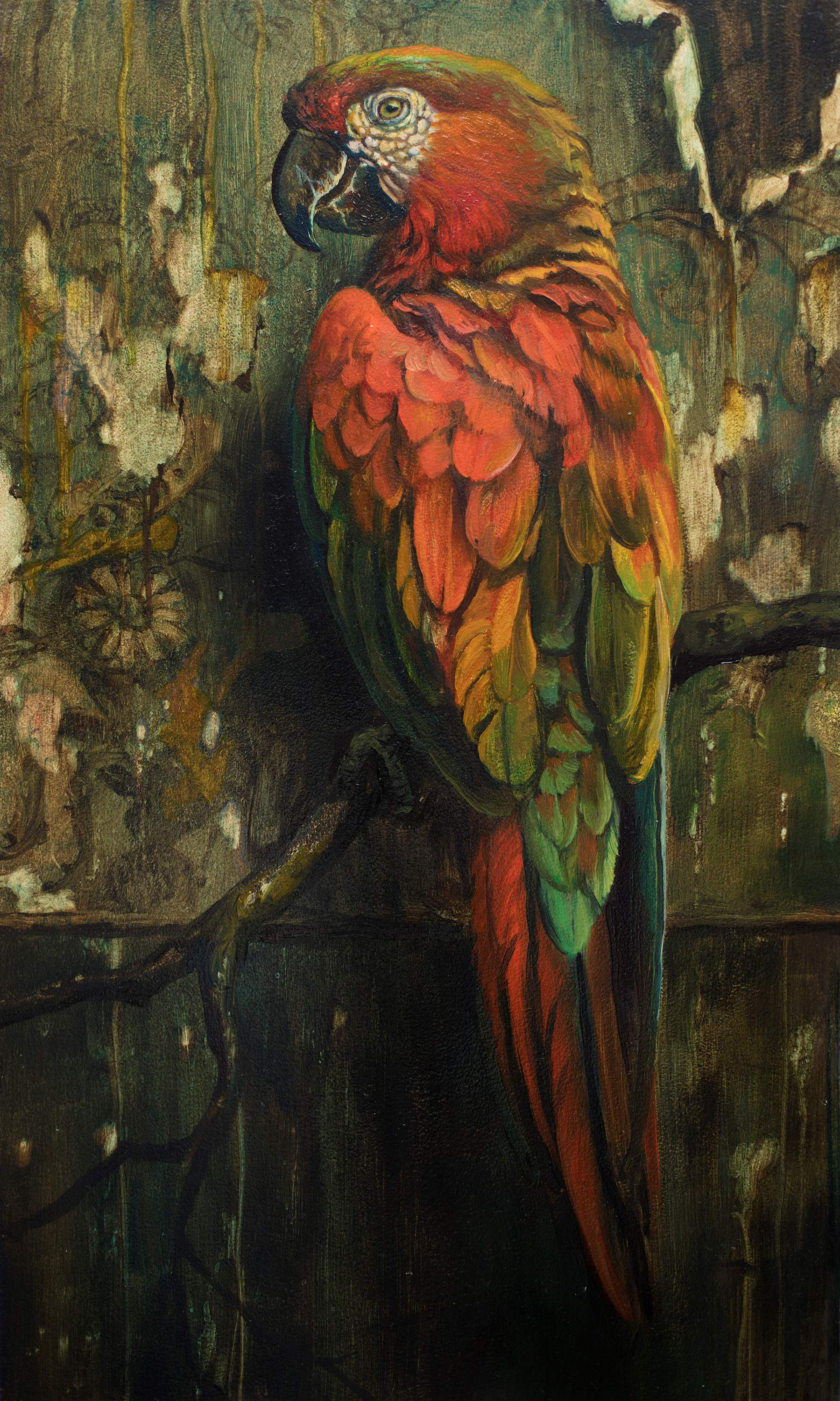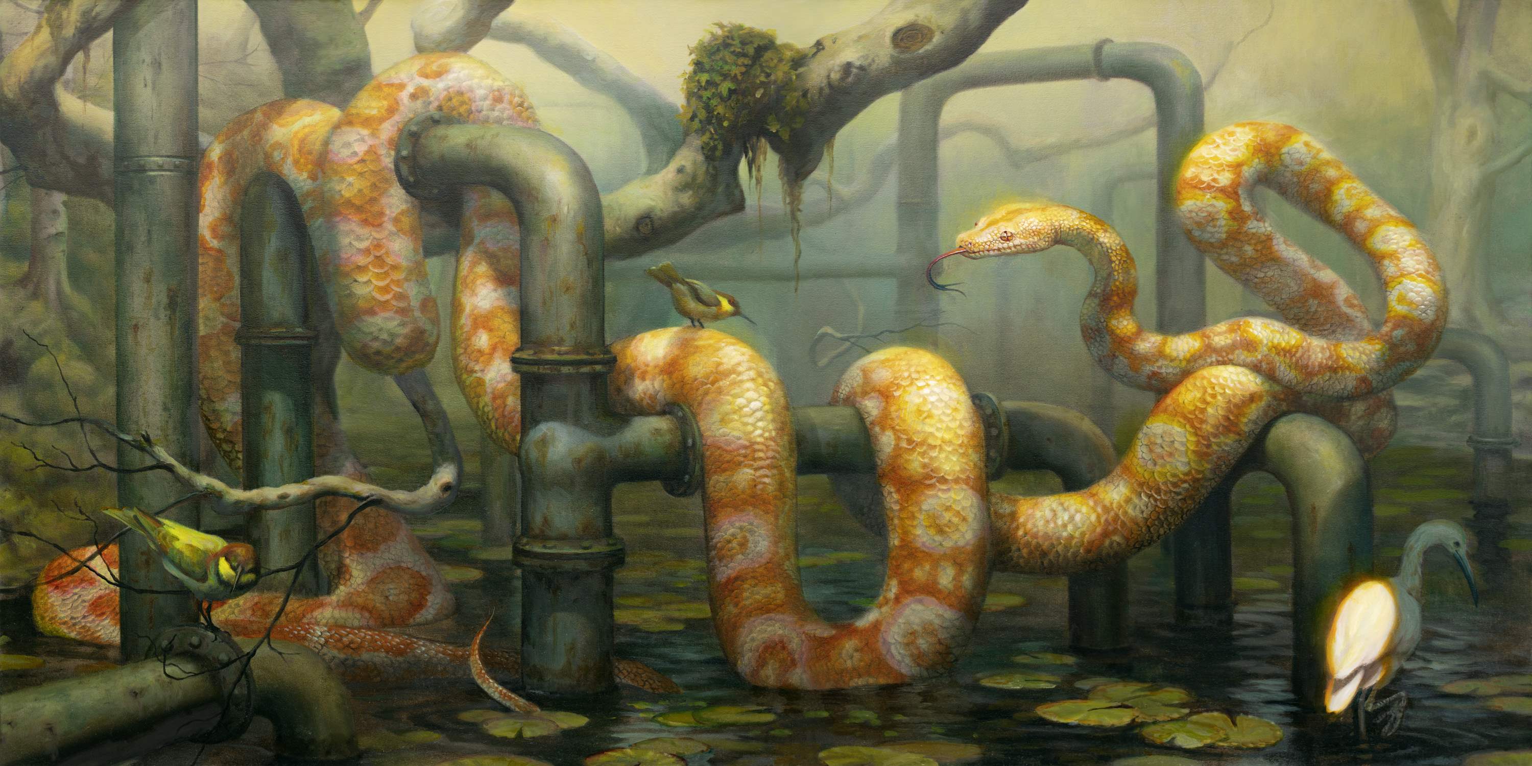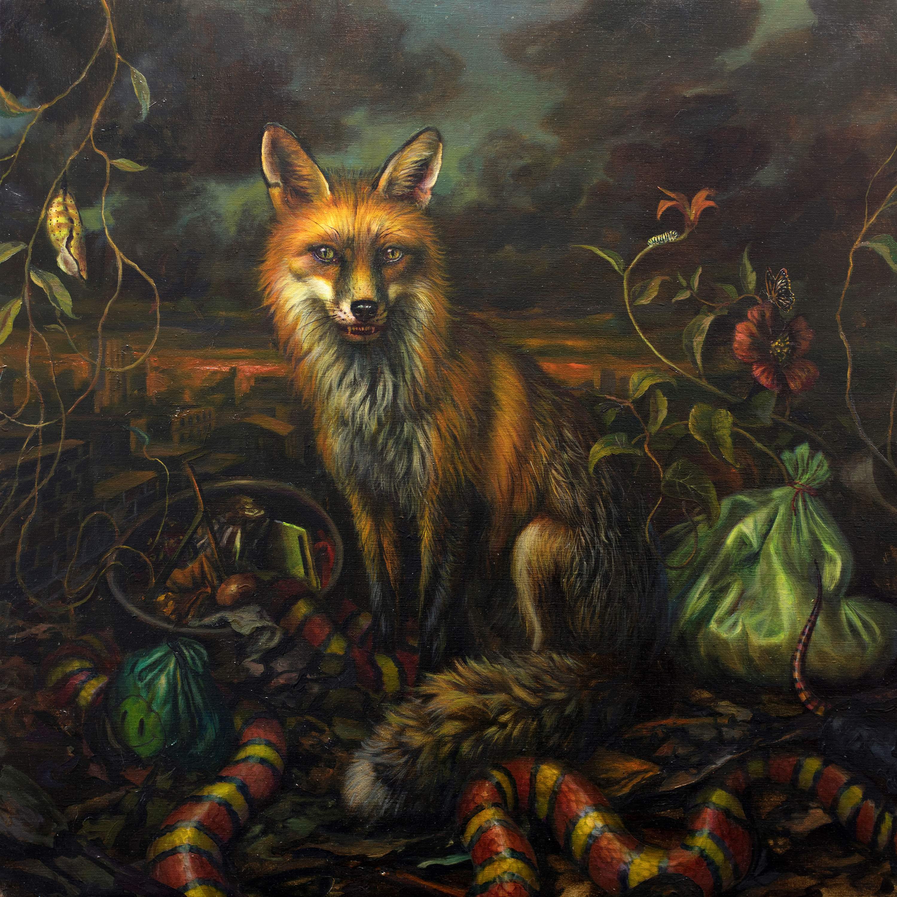 An example of Wittfooth’s use of allegory and symbolism to create visual stories can be seen in the painting Reflecting Pool, where a wild lion searches for its reflection in a dark pool of water, while subtle pipes hint at the lion’s survival in a polluted world. The sky is foggy and red-glowing. In another work, Shelter, Wittfooth shows us a nature-based mysticism, with a tiger seeking shelter under a tree near a pond. There’s an electric tension in the air, and we are left wondering whether what we see are embers about to ignite or a symbolic comment on the tiger's inner nature. In The Alchemist, a monkey takes on the artist’s role in society, reflecting Wittfooth’s own approach to casting a wide lens on our collective condition through his art. Since 2014, Wittfooth has been working to portray animals as shamanic figures, totems, or sacred icons, and we see a continued deepening of this theme in his new series of works.