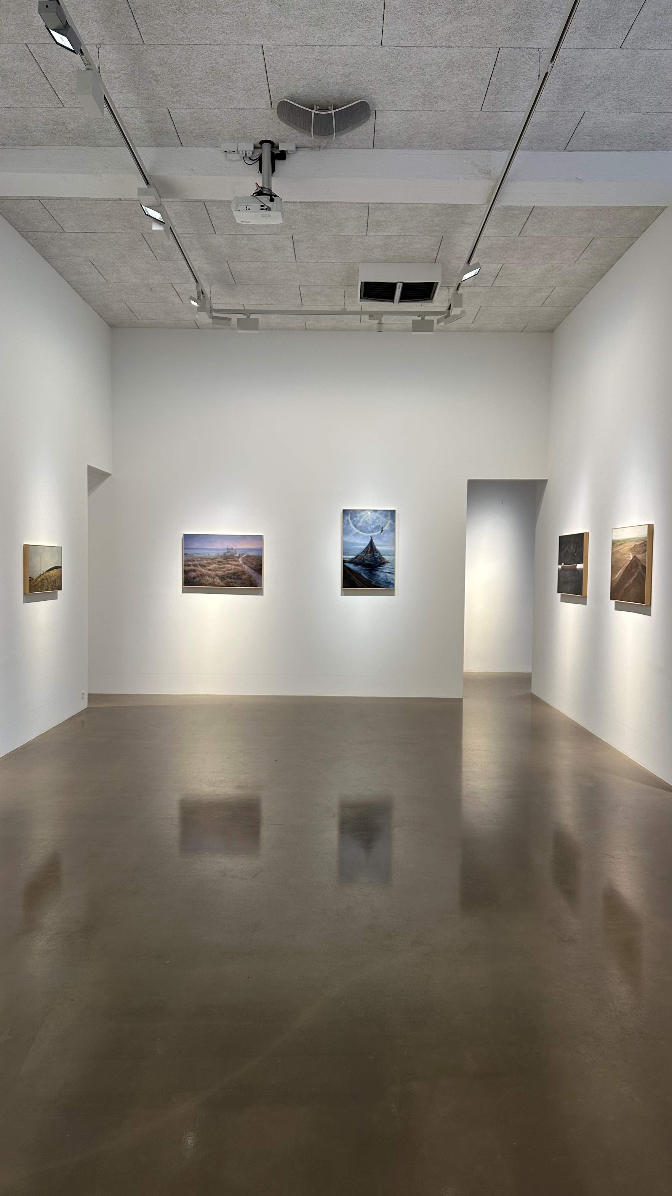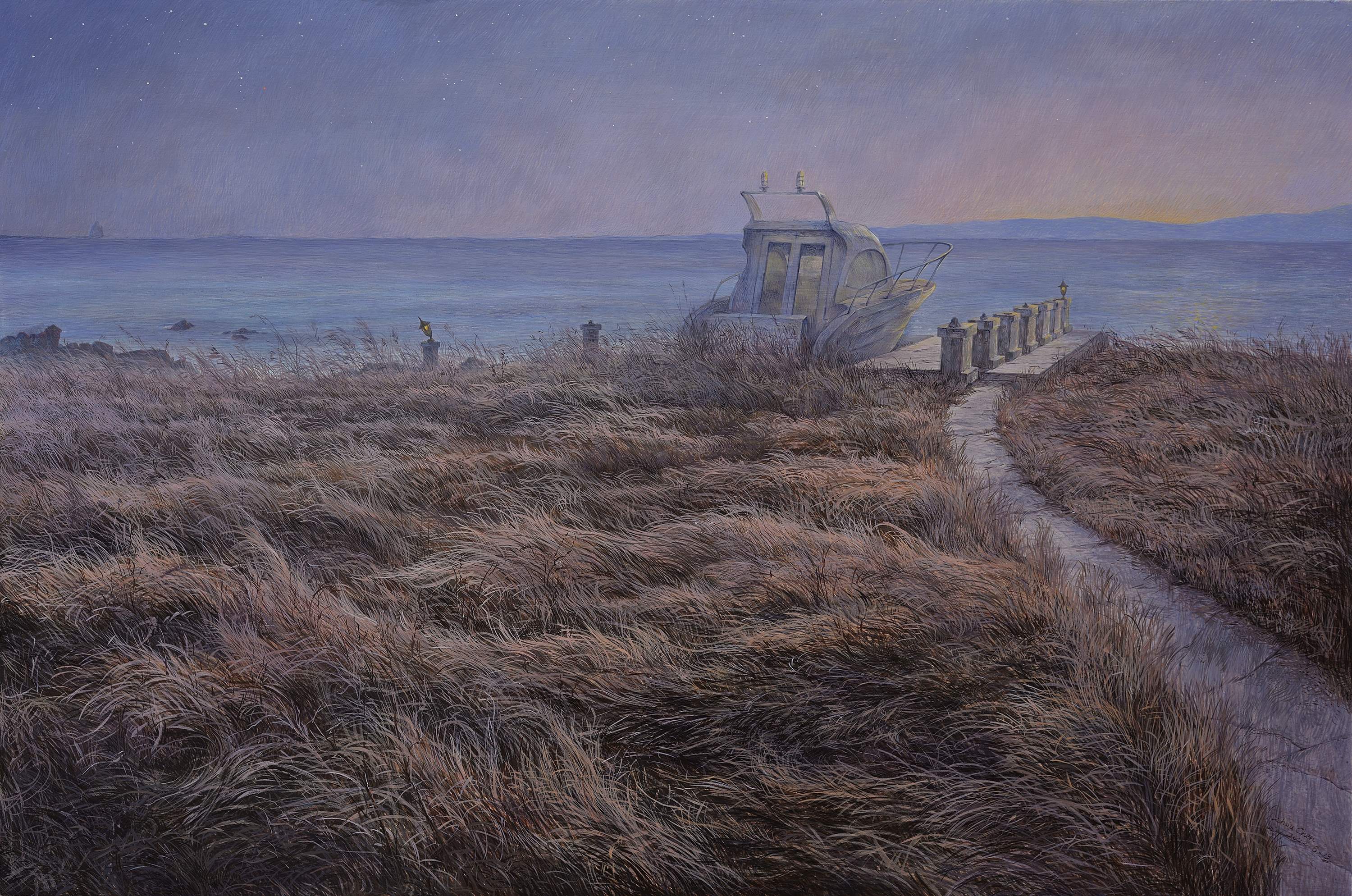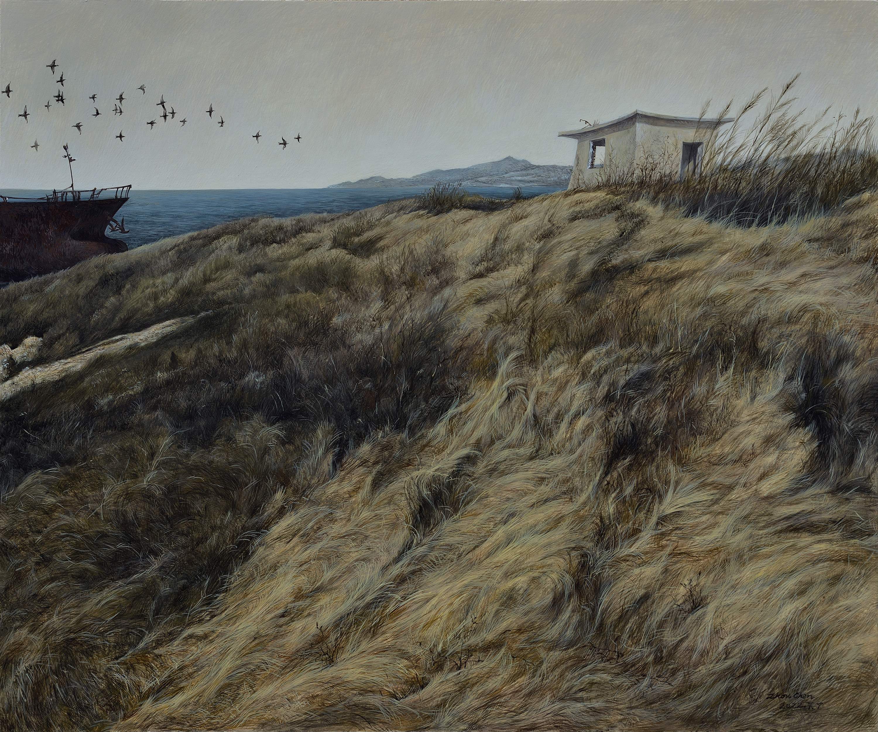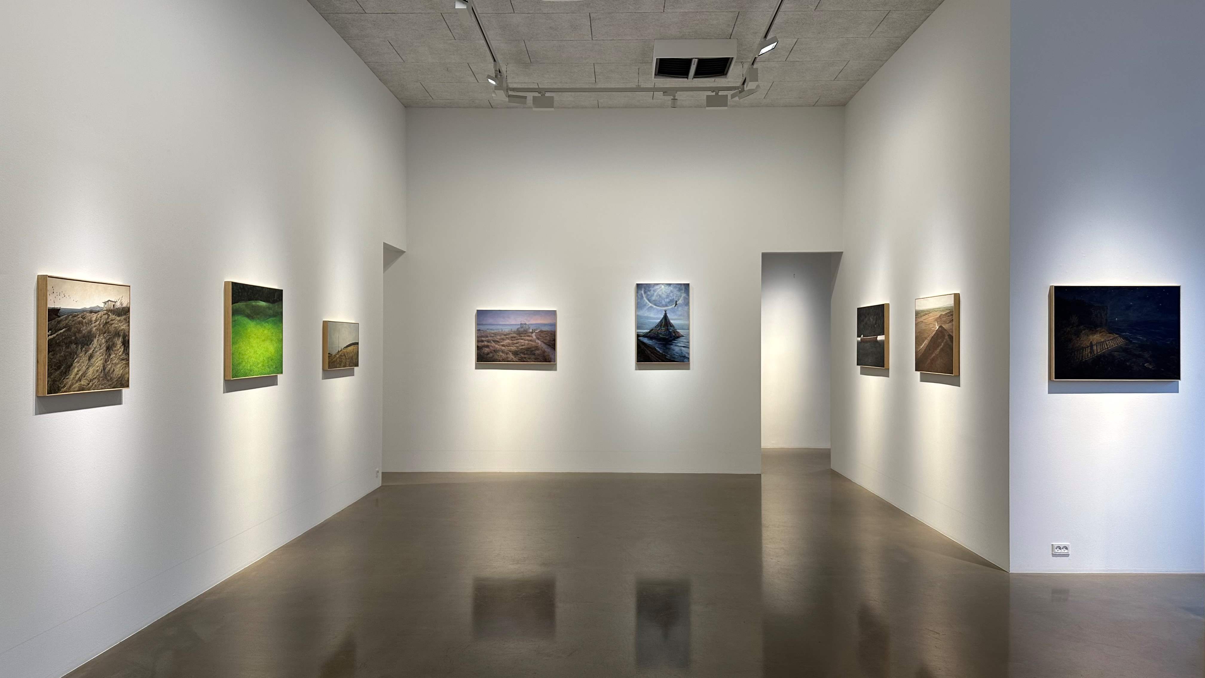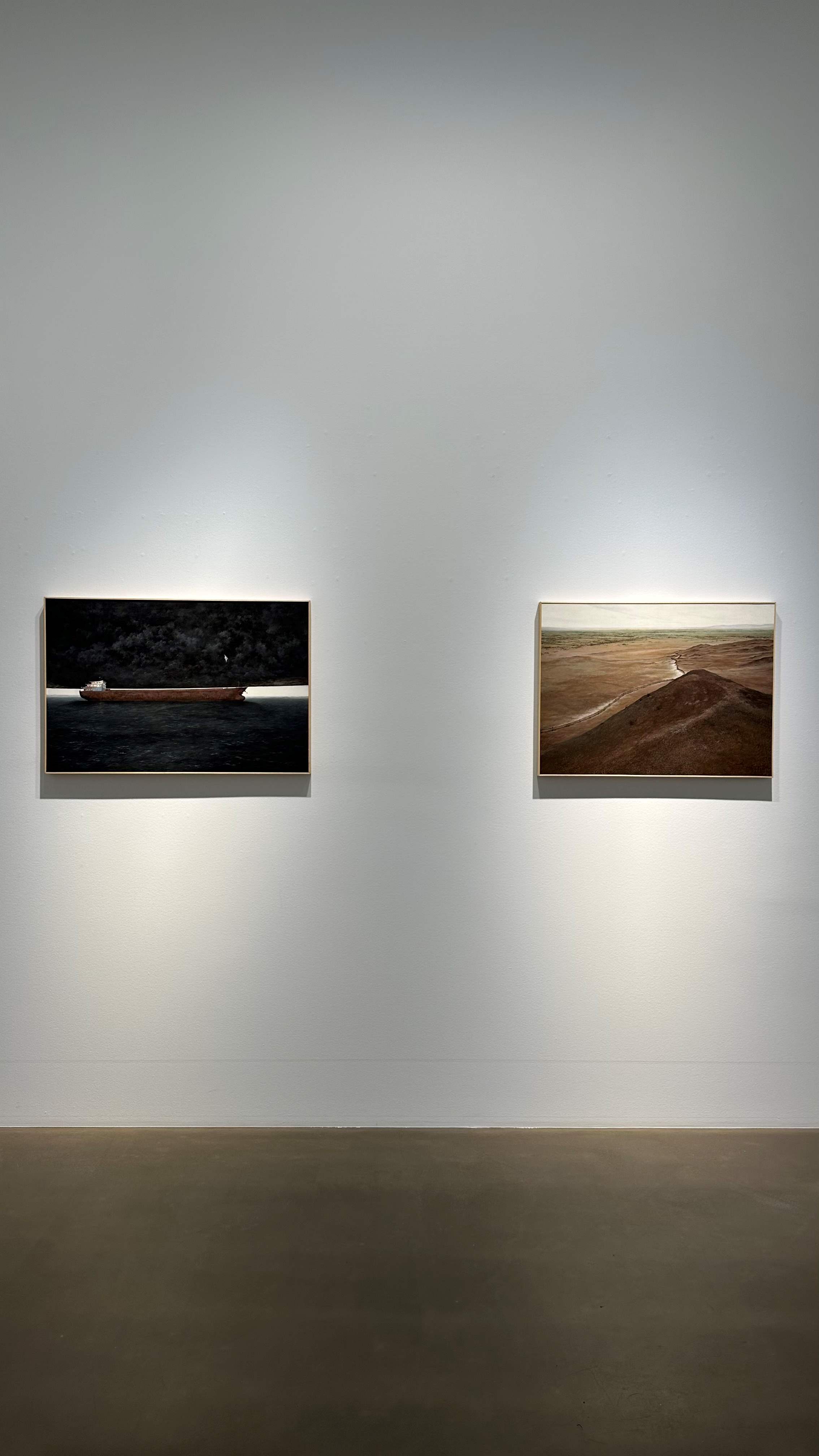 The works of the exhibition borrow their motifs from the western parts of China and from Zhou Chen’s own hometown in the country’s northeastern area. Western China possesses a rich history and a culture with deep roots, both of which are contained within a vast and magnificent natural landscape that is mostly untouched and empty of people. Opposite, Zhou Chen’s hometown is a new and quaint coastal town in northeastern China where the unpredictability of the sea and long and narrow shorelines dictate the character of the landscape. The diverse landscapes of the areas play a significant and meditative role for Zhou Chen. When he spends time in these places, he often experiences a powerful, calming, and healing energy radiated by nature that occurs when he observes and allows himself to linger in the same place over an extended period. For example, Zhou Chen will spend countless hours at the mountain by the sea near his hometown, from sunrise to sunset. This exercise offers complete immersion in nature’s secluded landscapes, revealing the subtle sensatory shifts that take place.