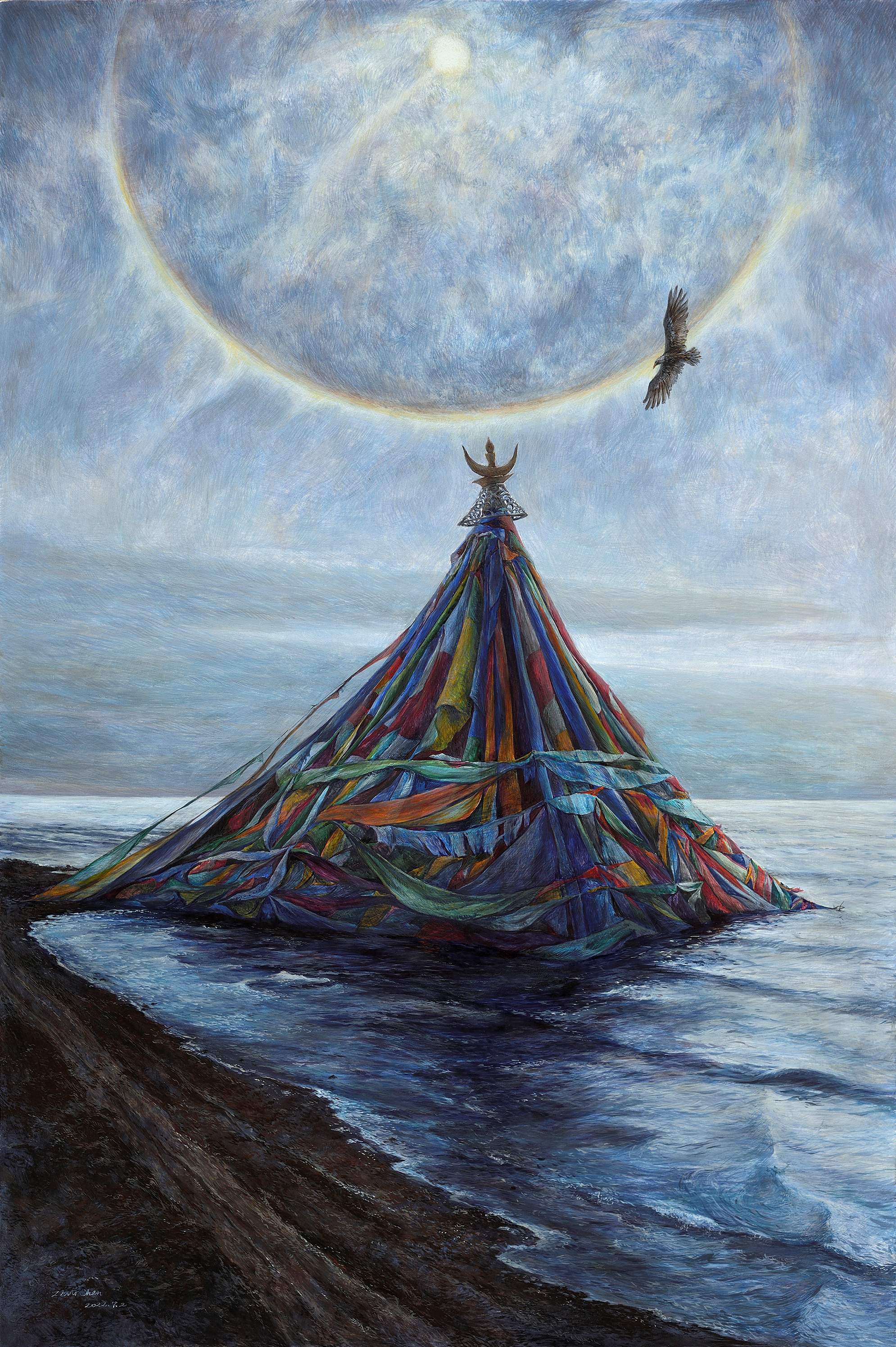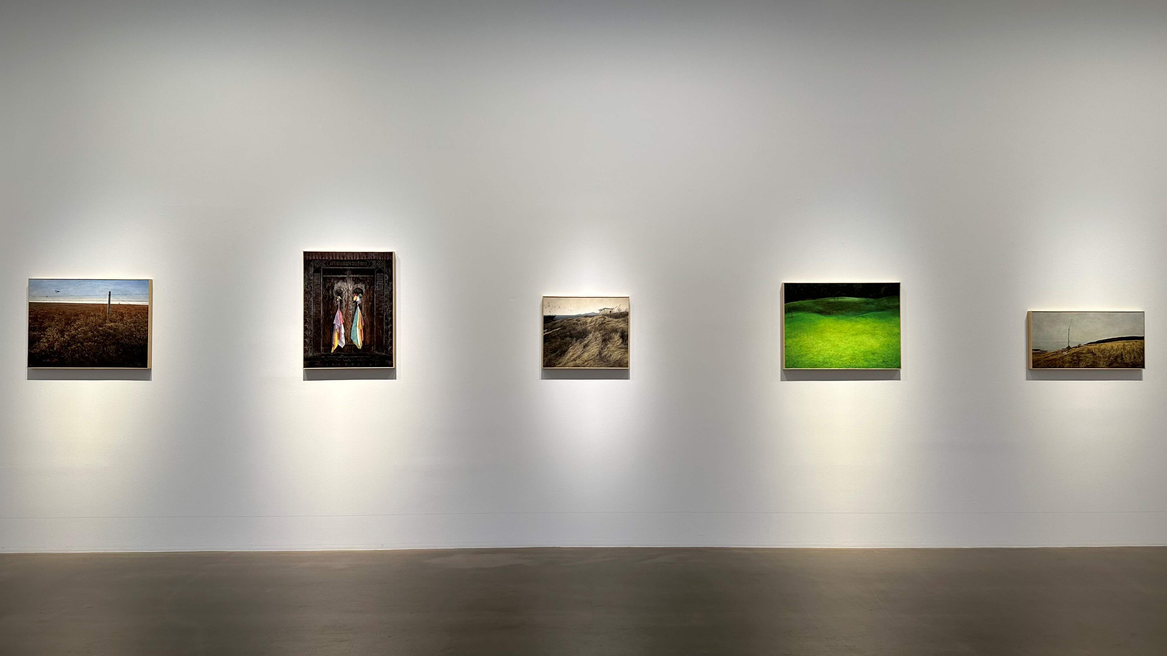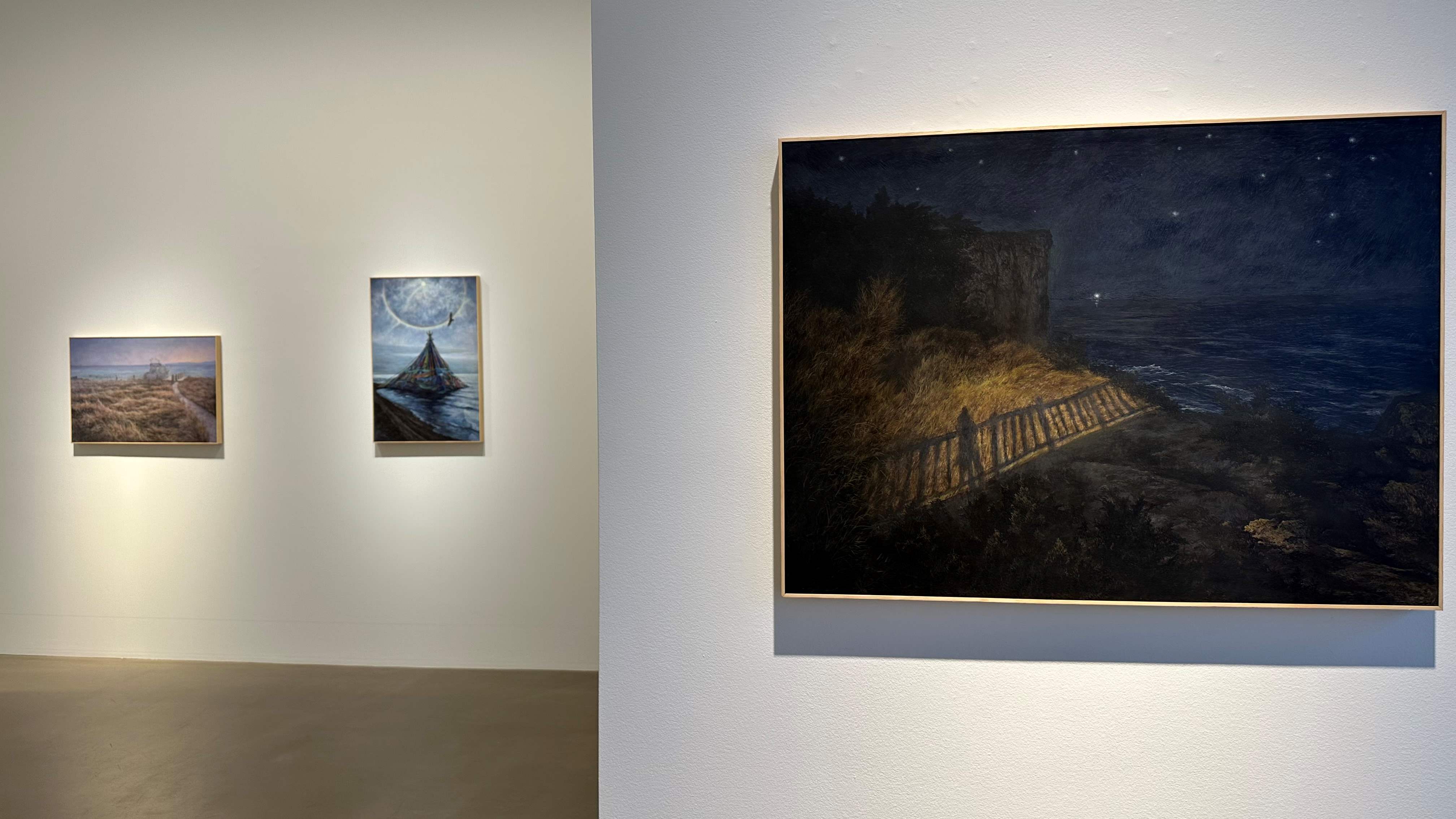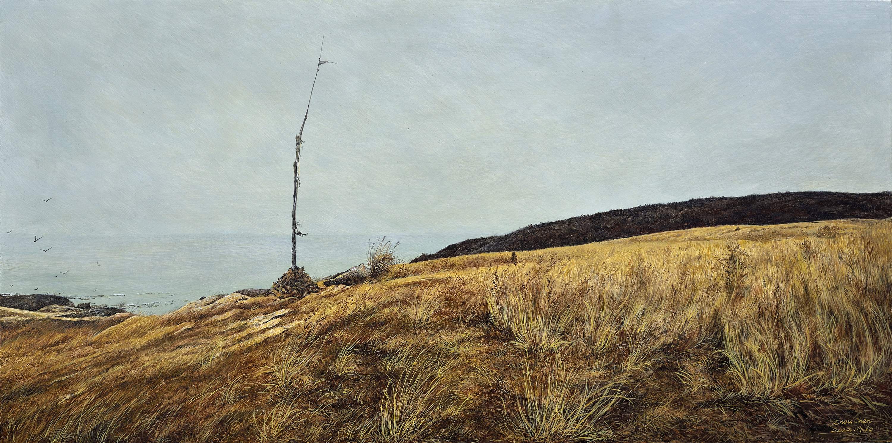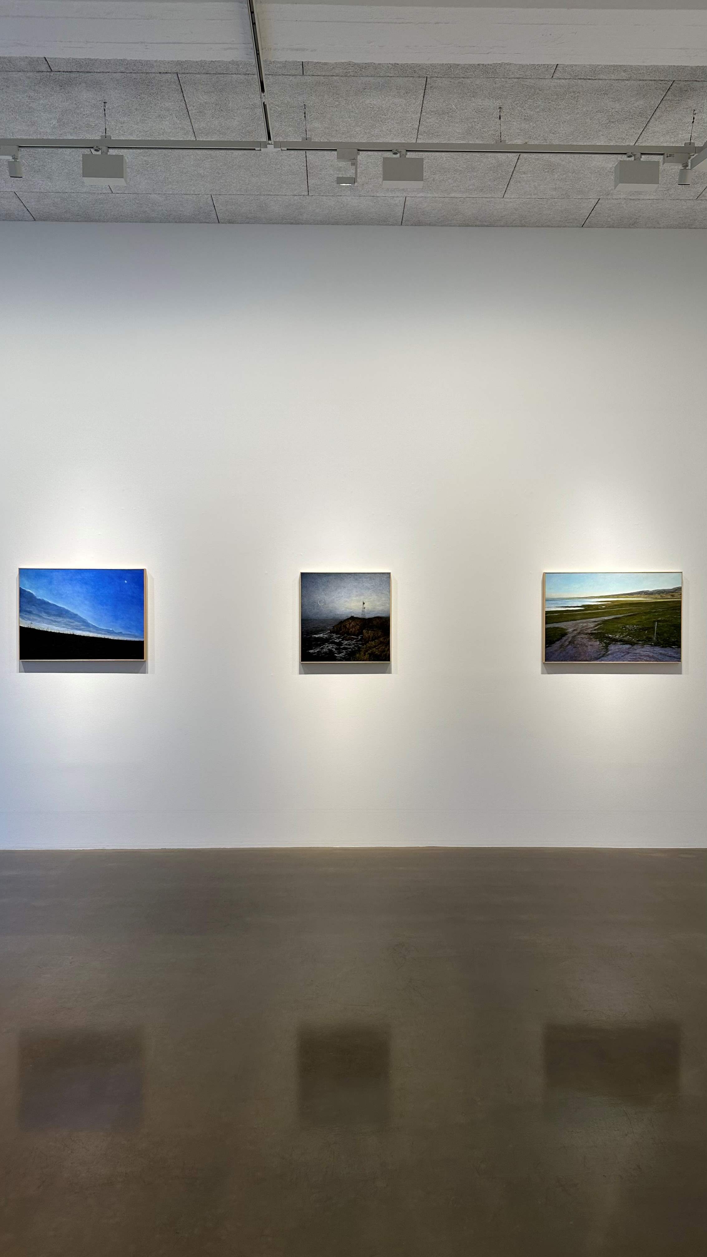 The works of the exhibition borrow their motifs from the western parts of China and from Zhou Chen’s own hometown in the country’s northeastern area. Western China possesses a rich history and a culture with deep roots, both of which are contained within a vast and magnificent natural landscape that is mostly untouched and empty of people. Opposite, Zhou Chen’s hometown is a new and quaint coastal town in northeastern China where the unpredictability of the sea and long and narrow shorelines dictate the character of the landscape. The diverse landscapes of the areas play a significant and meditative role for Zhou Chen. When he spends time in these places, he often experiences a powerful, calming, and healing energy radiated by nature that occurs when he observes and allows himself to linger in the same place over an extended period. For example, Zhou Chen will spend countless hours at the mountain by the sea near his hometown, from sunrise to sunset. This exercise offers complete immersion in nature’s secluded landscapes, revealing the subtle sensatory shifts that take place.