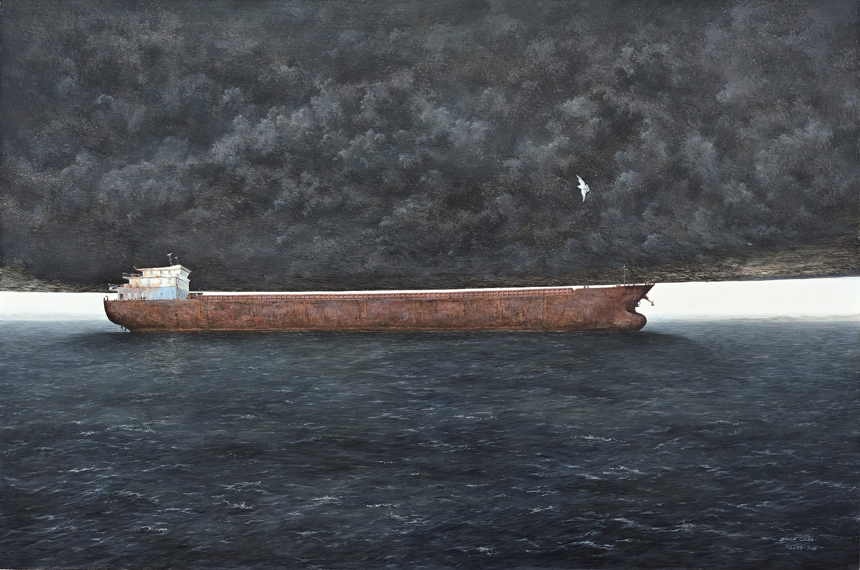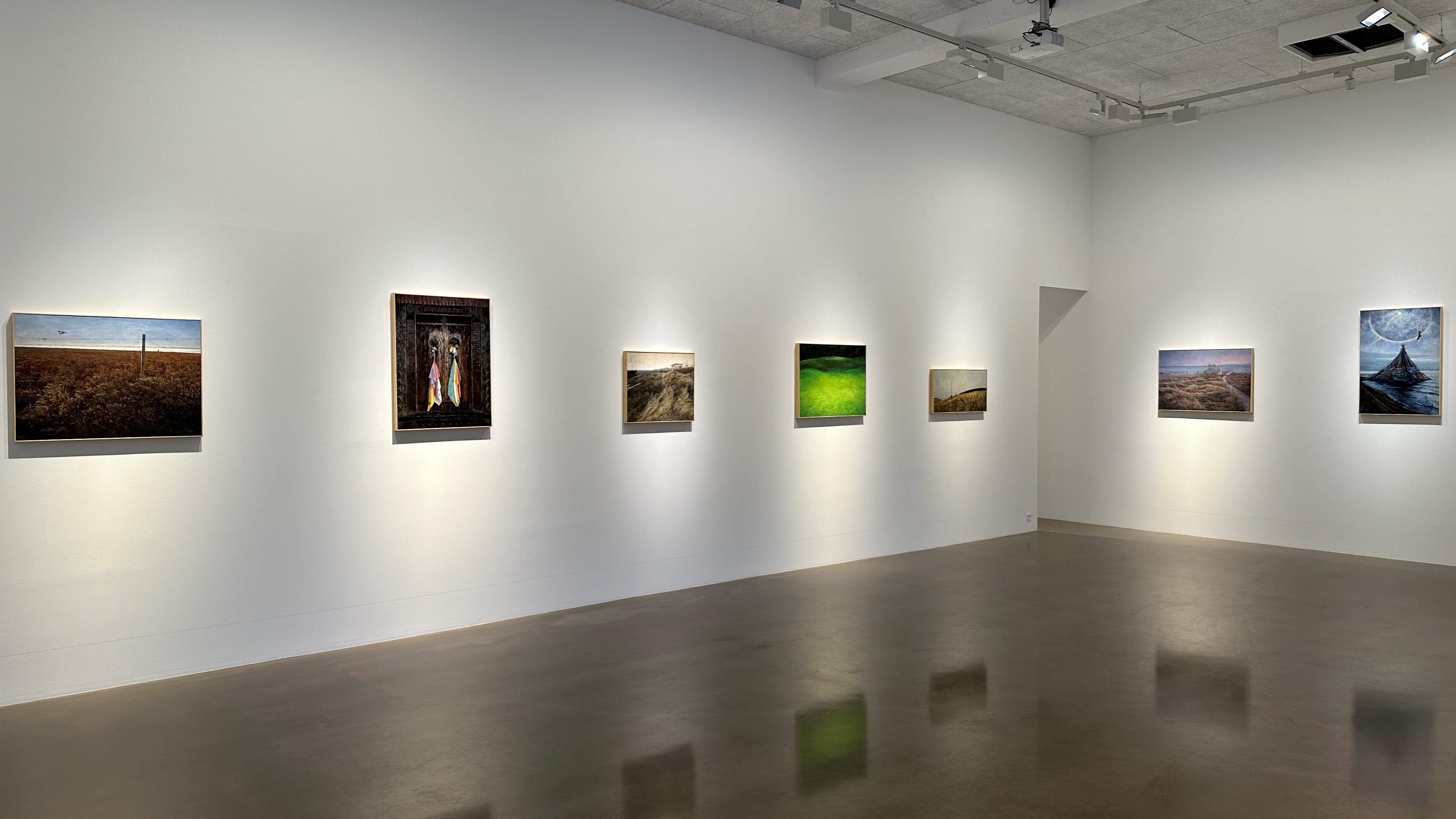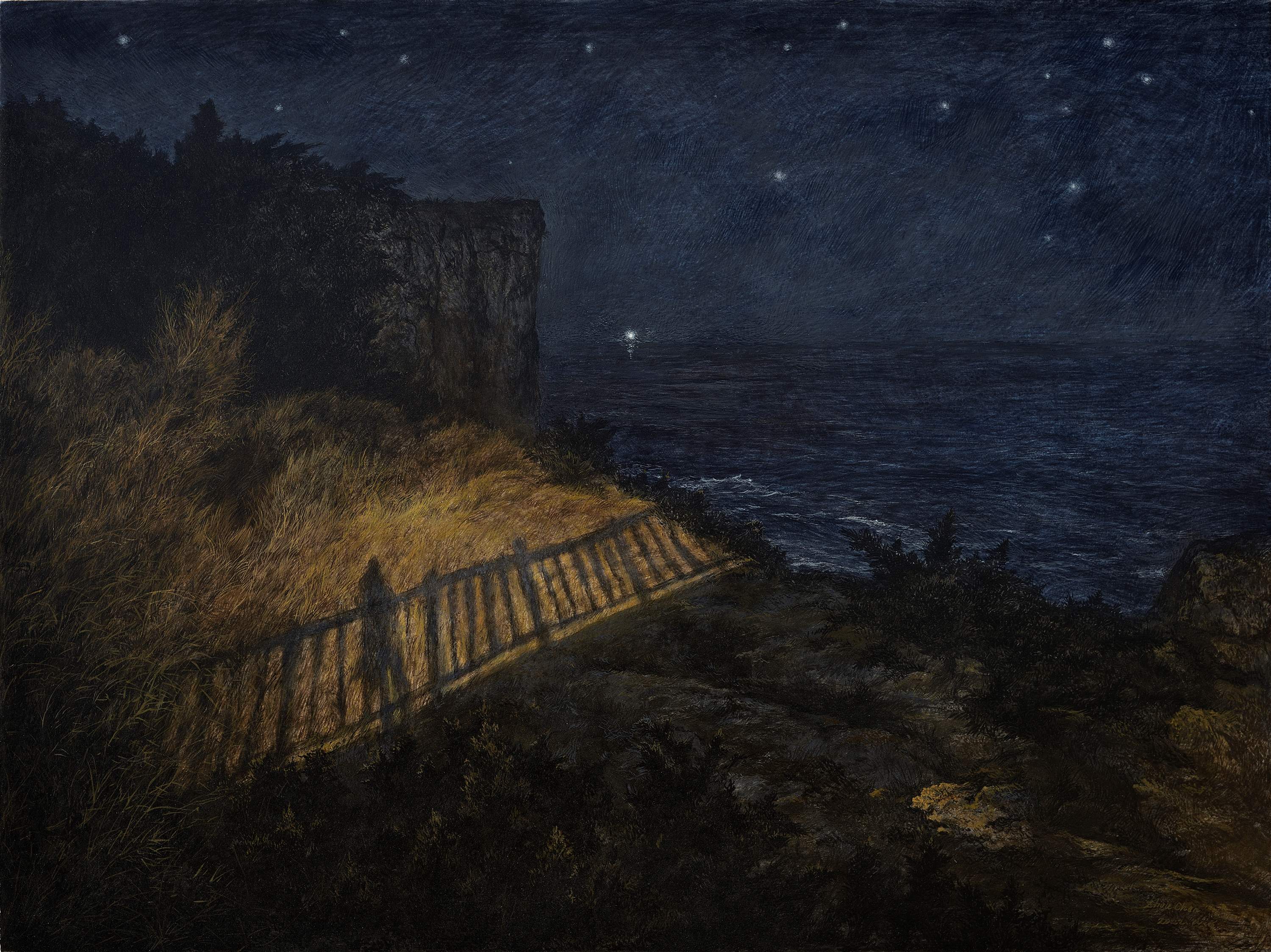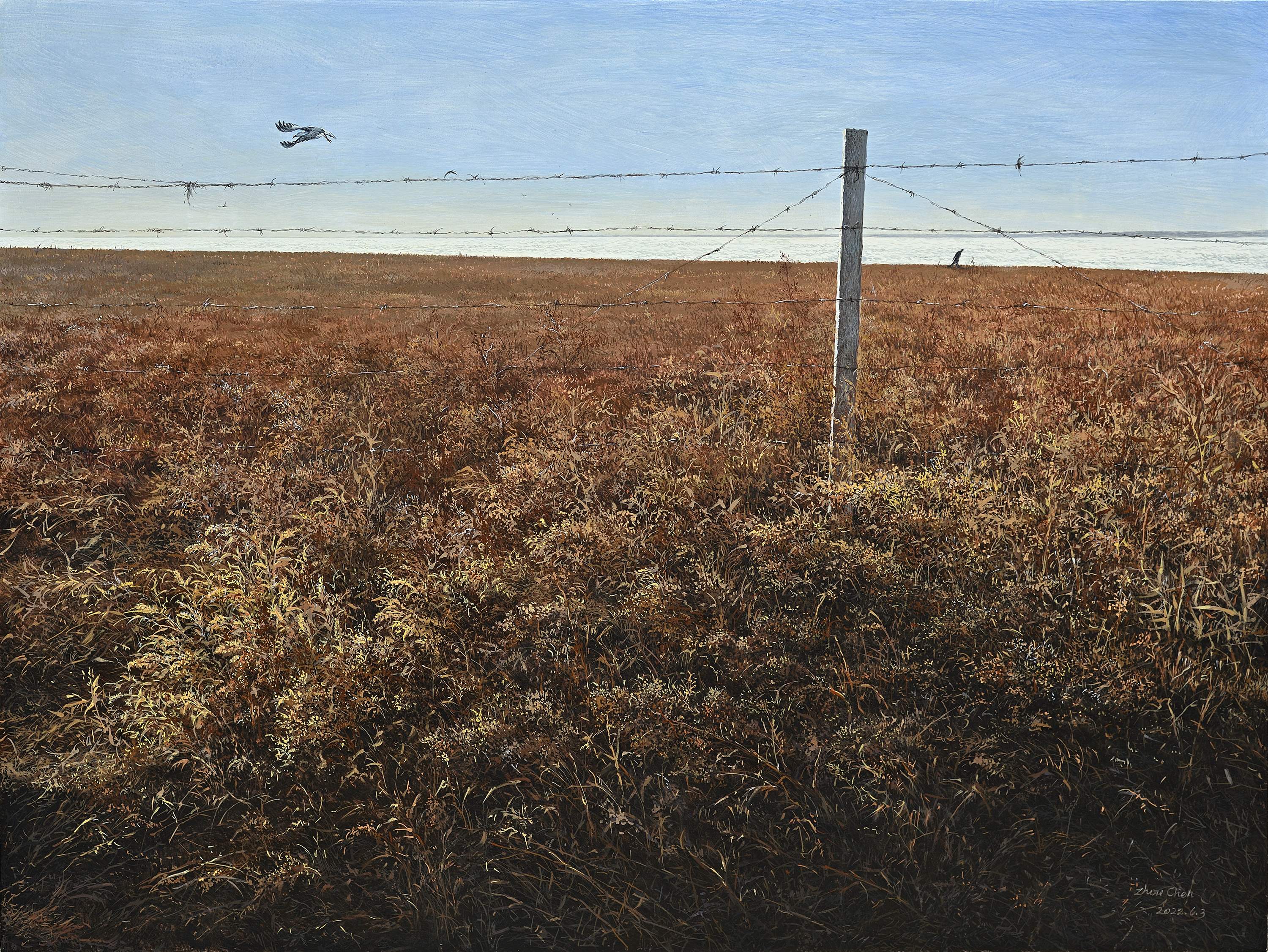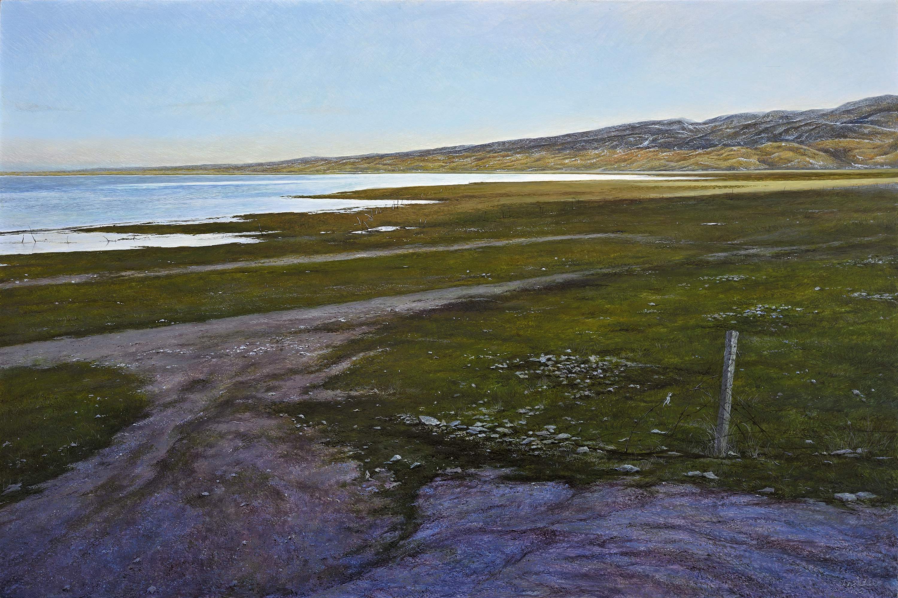 The works of the exhibition borrow their motifs from the western parts of China and from Zhou Chen’s own hometown in the country’s northeastern area. Western China possesses a rich history and a culture with deep roots, both of which are contained within a vast and magnificent natural landscape that is mostly untouched and empty of people. Opposite, Zhou Chen’s hometown is a new and quaint coastal town in northeastern China where the unpredictability of the sea and long and narrow shorelines dictate the character of the landscape. The diverse landscapes of the areas play a significant and meditative role for Zhou Chen. When he spends time in these places, he often experiences a powerful, calming, and healing energy radiated by nature that occurs when he observes and allows himself to linger in the same place over an extended period. For example, Zhou Chen will spend countless hours at the mountain by the sea near his hometown, from sunrise to sunset. This exercise offers complete immersion in nature’s secluded landscapes, revealing the subtle sensatory shifts that take place.