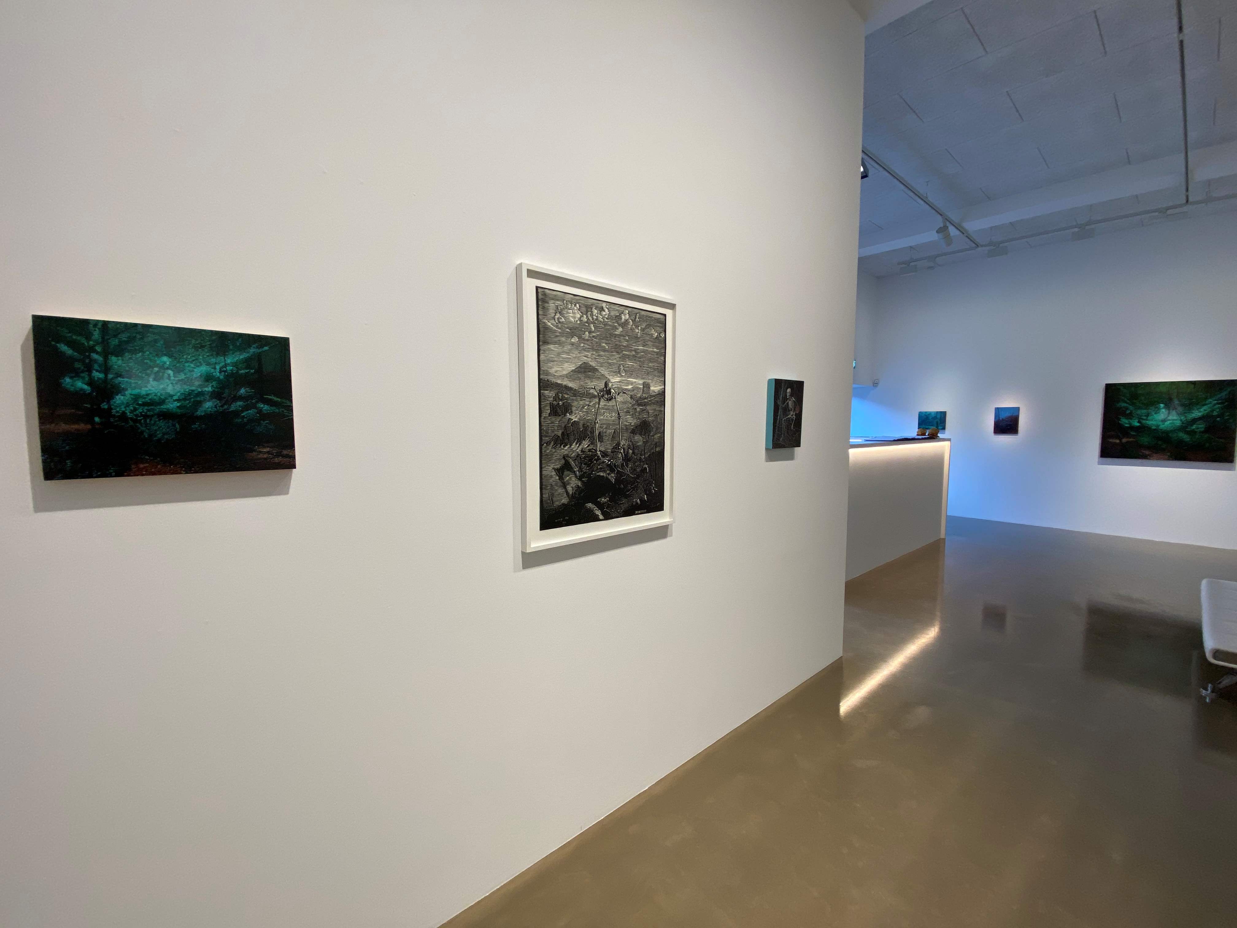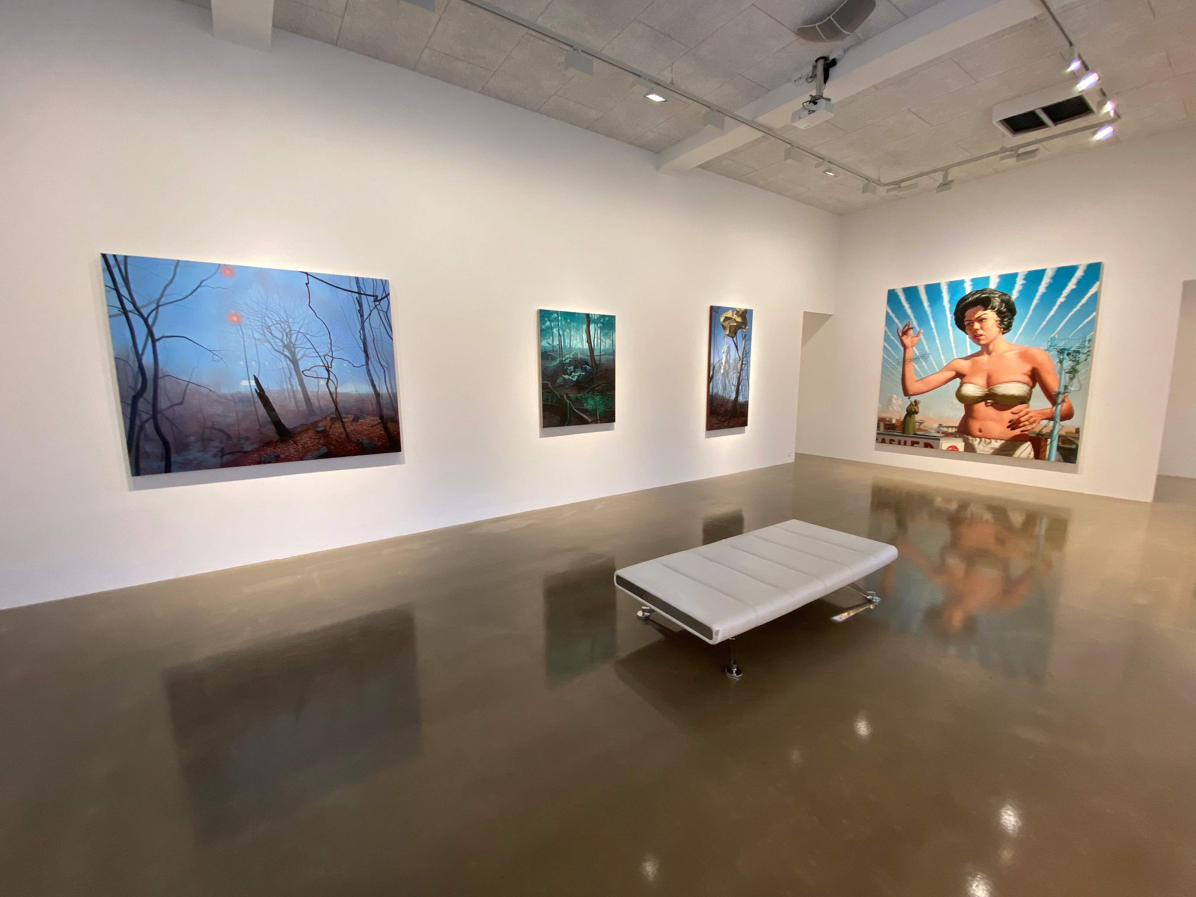 In a dreaming and cinematic way John Jacobsmeyer here describes the biggest painting in the exhibition called ”Invasion”. It references only a fraction of the cultural material organized to make a painting about how our media magnified female emotion into a sublime force of nature. It is an example of how Jacobsmeyer develop allegorical structures for each work and shows how many layers there is in his art.