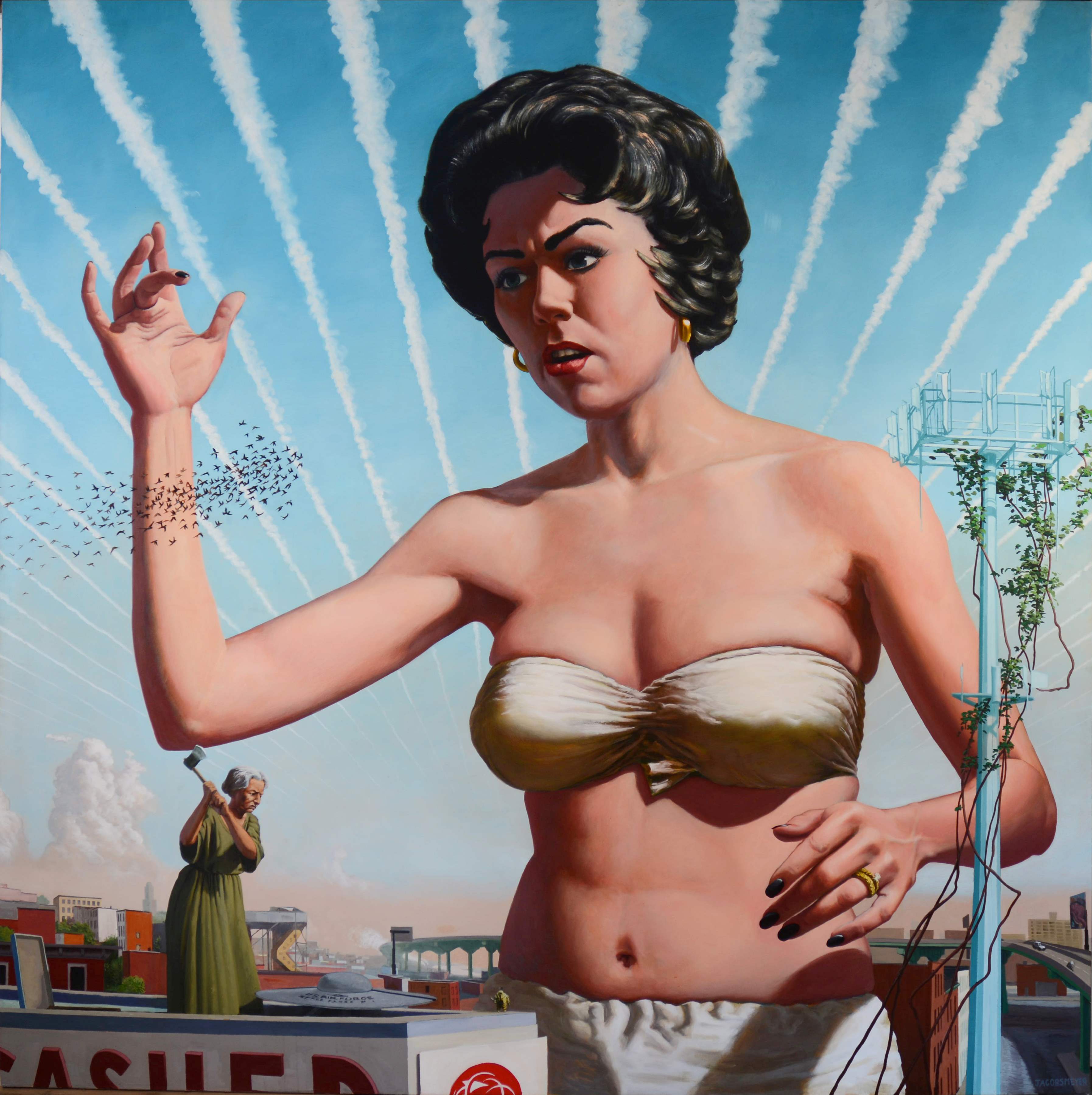 ”She’s like Nancy Archer from ”Attack of the Fifty Foot Woman”, a 30 something giant half naked woman with an Elizabeth Taylor haircut from the film, ”Cat on a Hot Tin Roof” looming several stories above Red Hook Brooklyn on a sunny day with an armada of jet vapor trails receding into the distance while in the foreground another giantess narrative from the Twilight Zone series plays out on the roof of a check cashing establishment.”