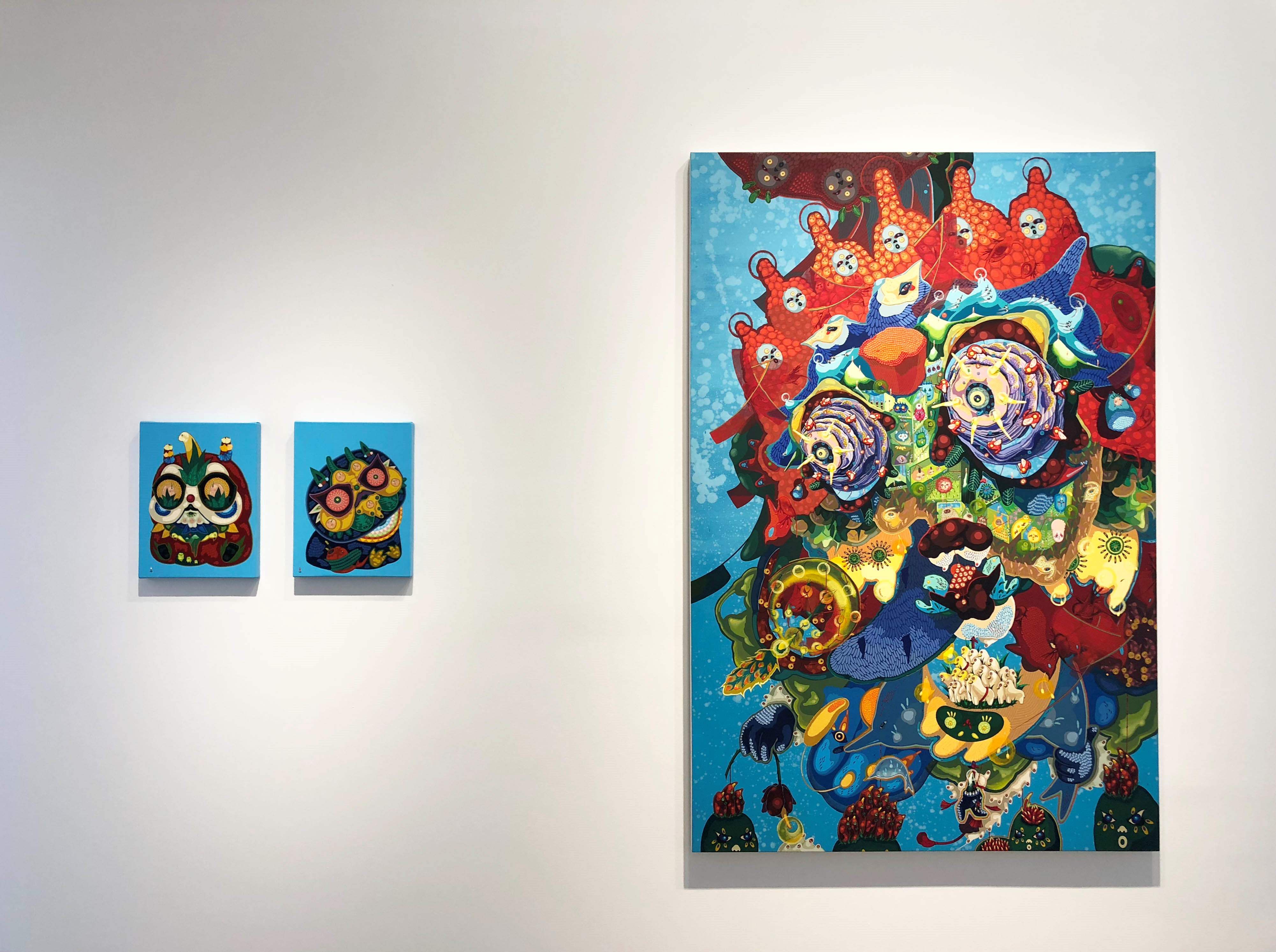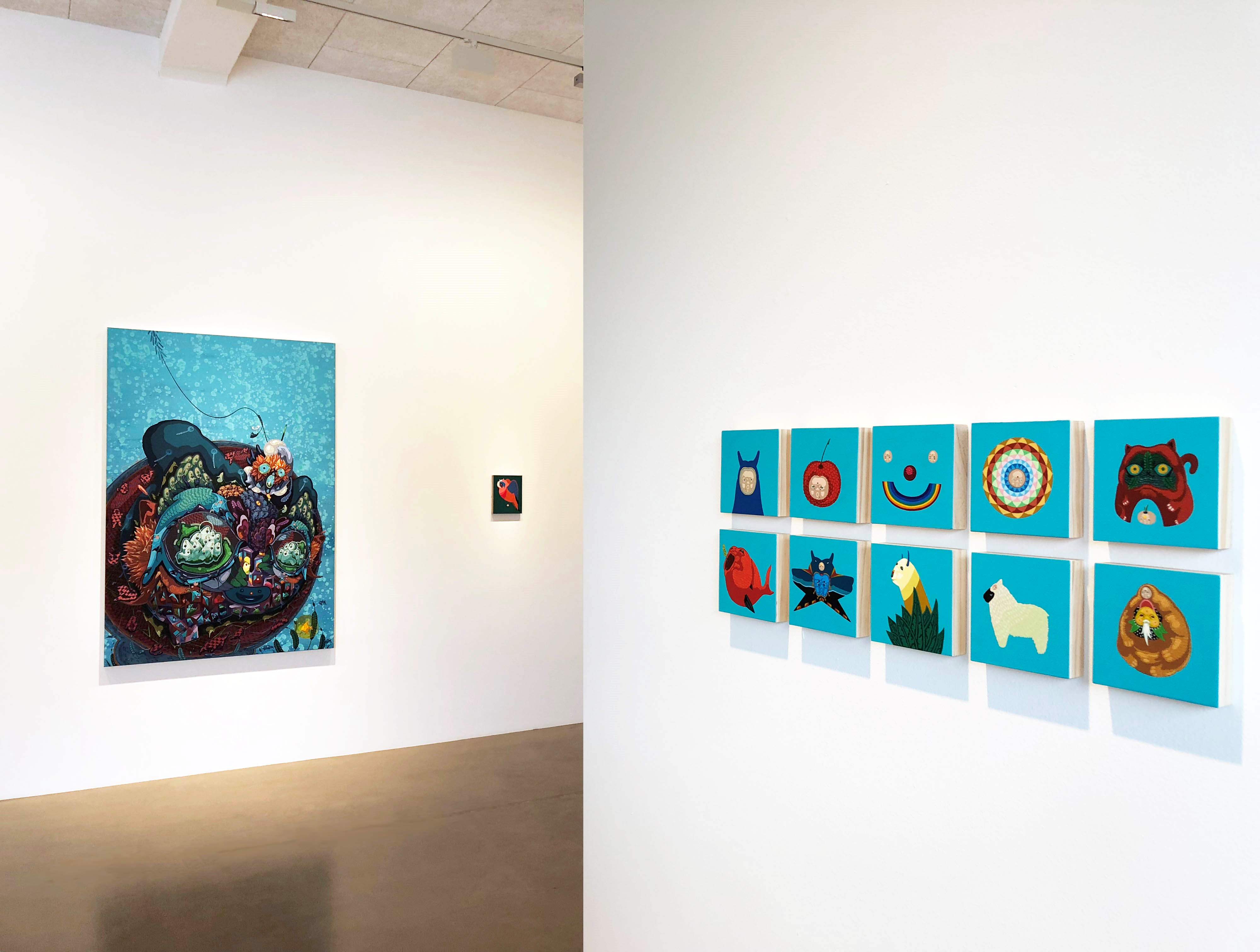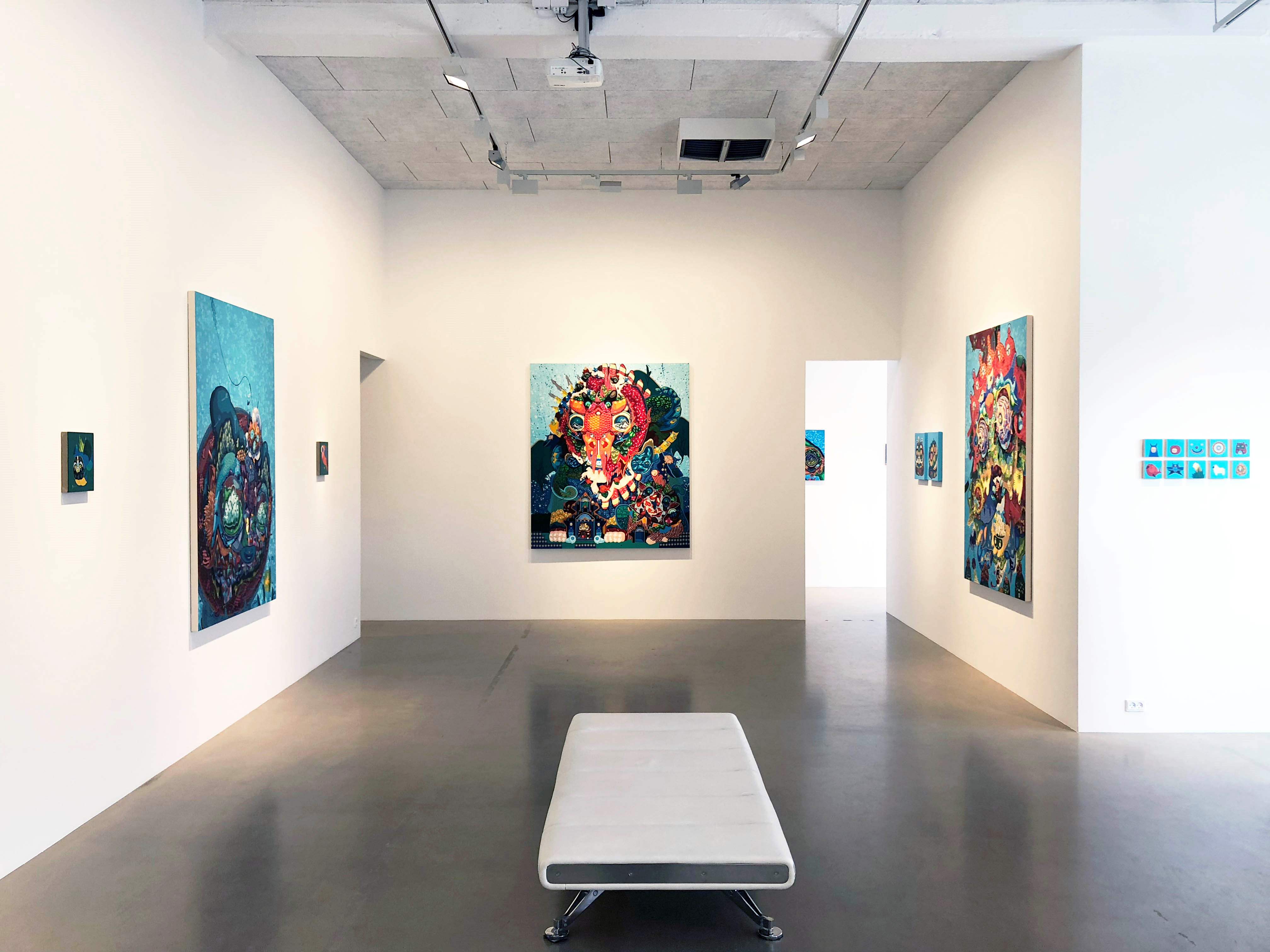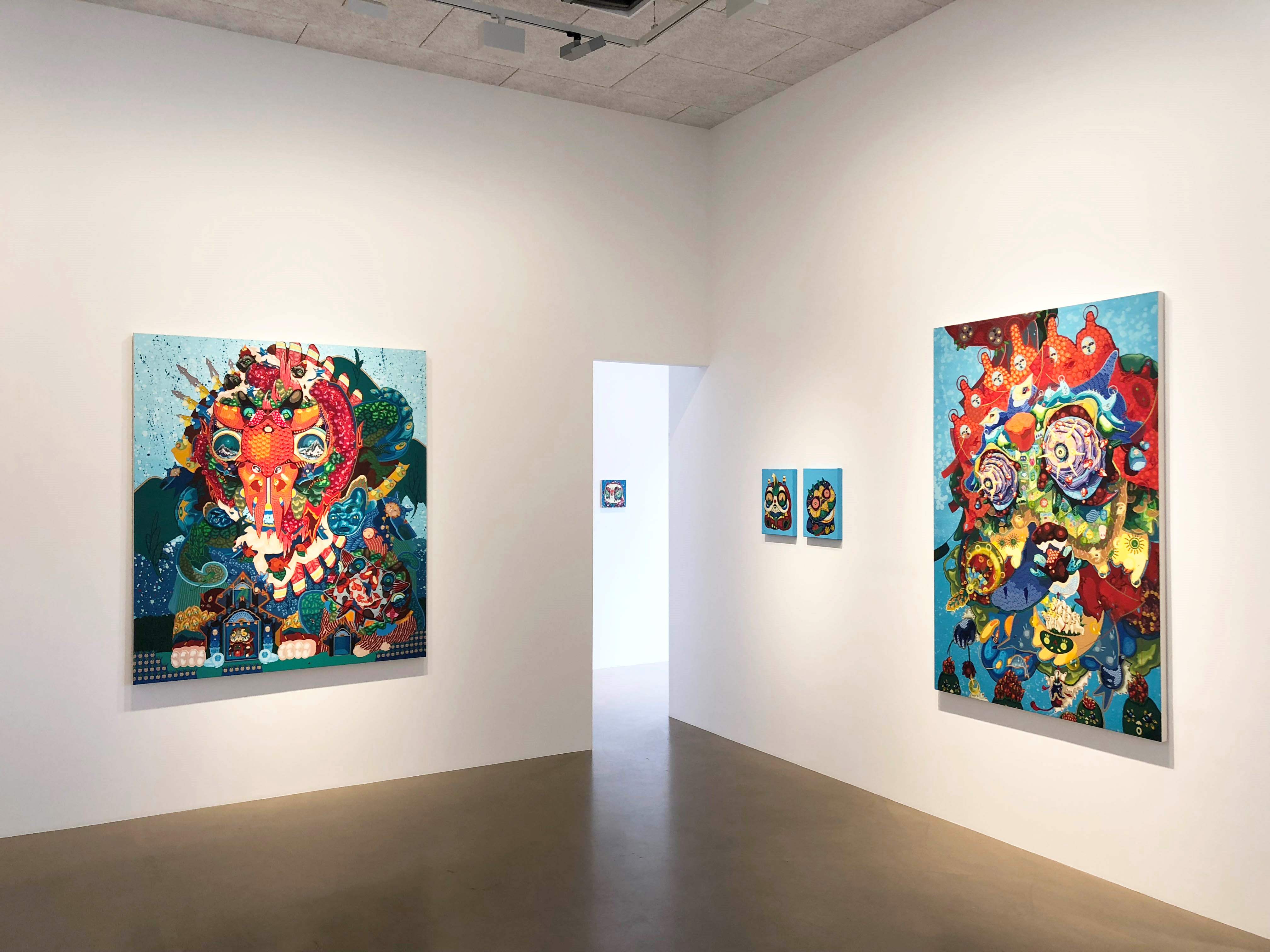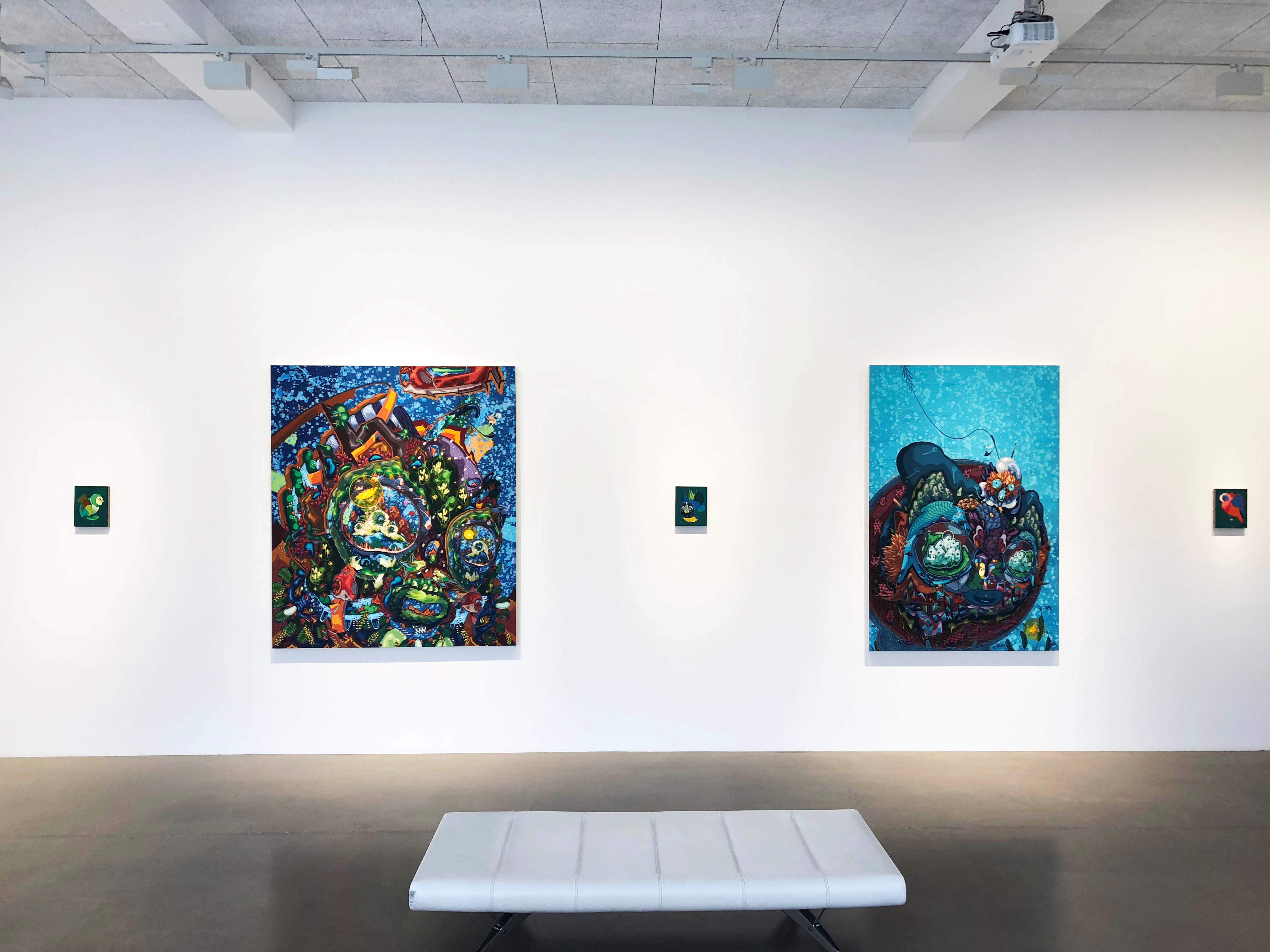 Each piece in the exhibition opens up a kaleidoscopic world, where myriads of animals and figures constantly mutate, and new forms reveal themselves. Intense color palettes and intricate patterns occur and dissolve over and over again. Mi Ju draws us deeply into her coral reef of mythical creatures in a visual explosion of coloristic dimensions. Thus, the mood is set when we kick off the fall season with Mi Ju's roaringly alluring solo show "Within Blue".