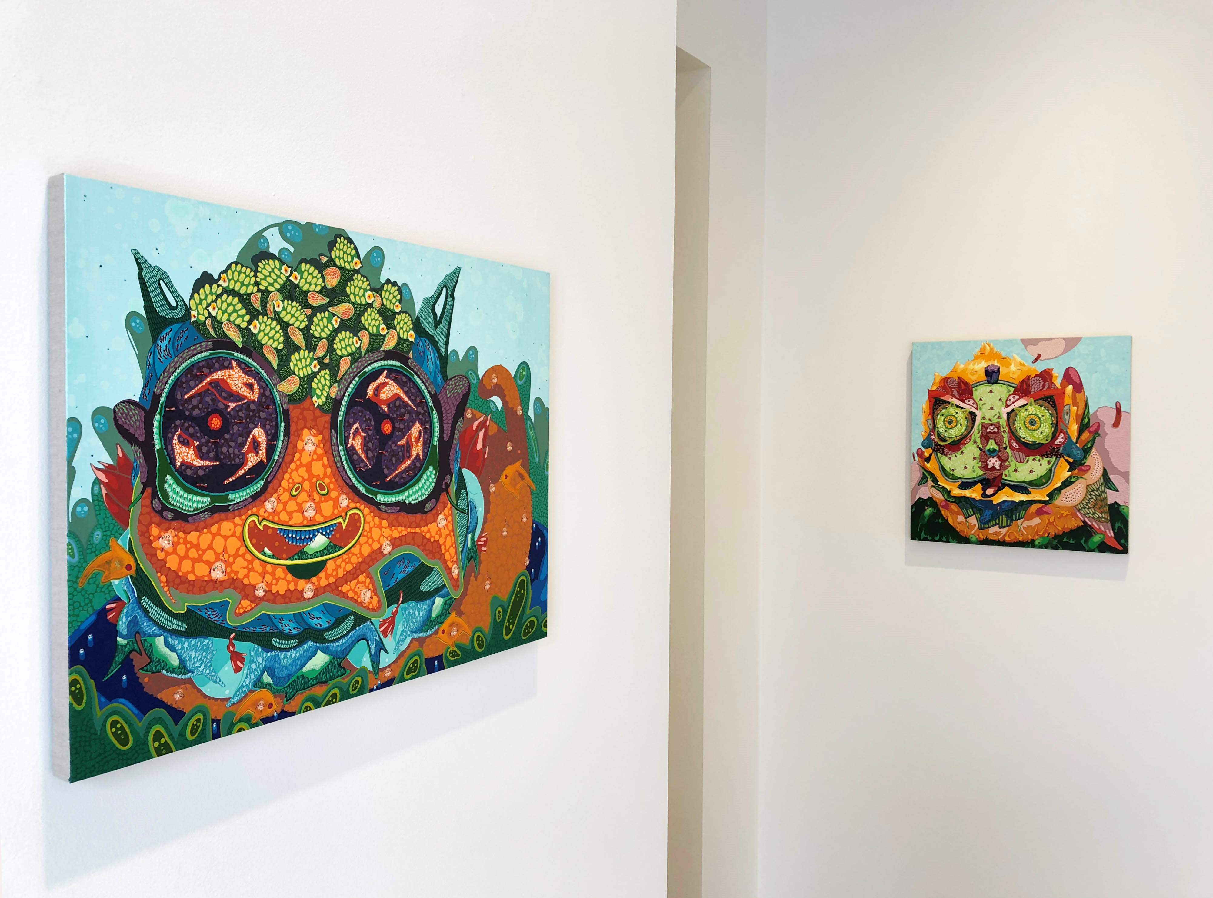 Lader vi os først rigtigt hvirvle ind i Mi Jus visuelle formationer, får vi også øje på en række mikroskopiske symboler langt inde i lærredet, der ikke kun syder og bobler over af detaljerigdom. Den skarpe beskuer vil opdage, at der blandt ukontrollerbare fabeldyr og livgivende blomsterfrø gemmer sig et lag af Mi Jus familiære ophav, der efter mere end 10 år i USA emmer af både amerikansk og koreansk kulturel identitet.