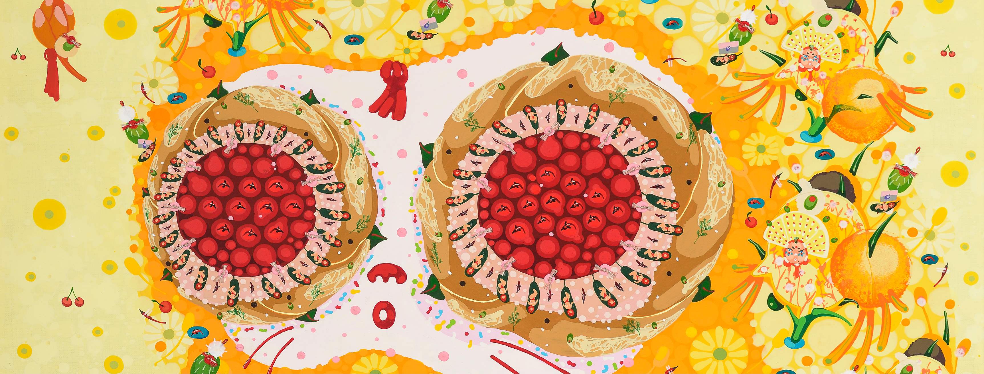 With “Yellow Cocoon” we are drawn into an open theme of family and home, with yellow acting as the connecting ‘red thread’. Different family structures and generations are explicitly portrayed in works like ”Family Portrait”, ”Friday Feast” and ”Blue Sheep”, where creatures with immense eyes are united in an explosion of colors.