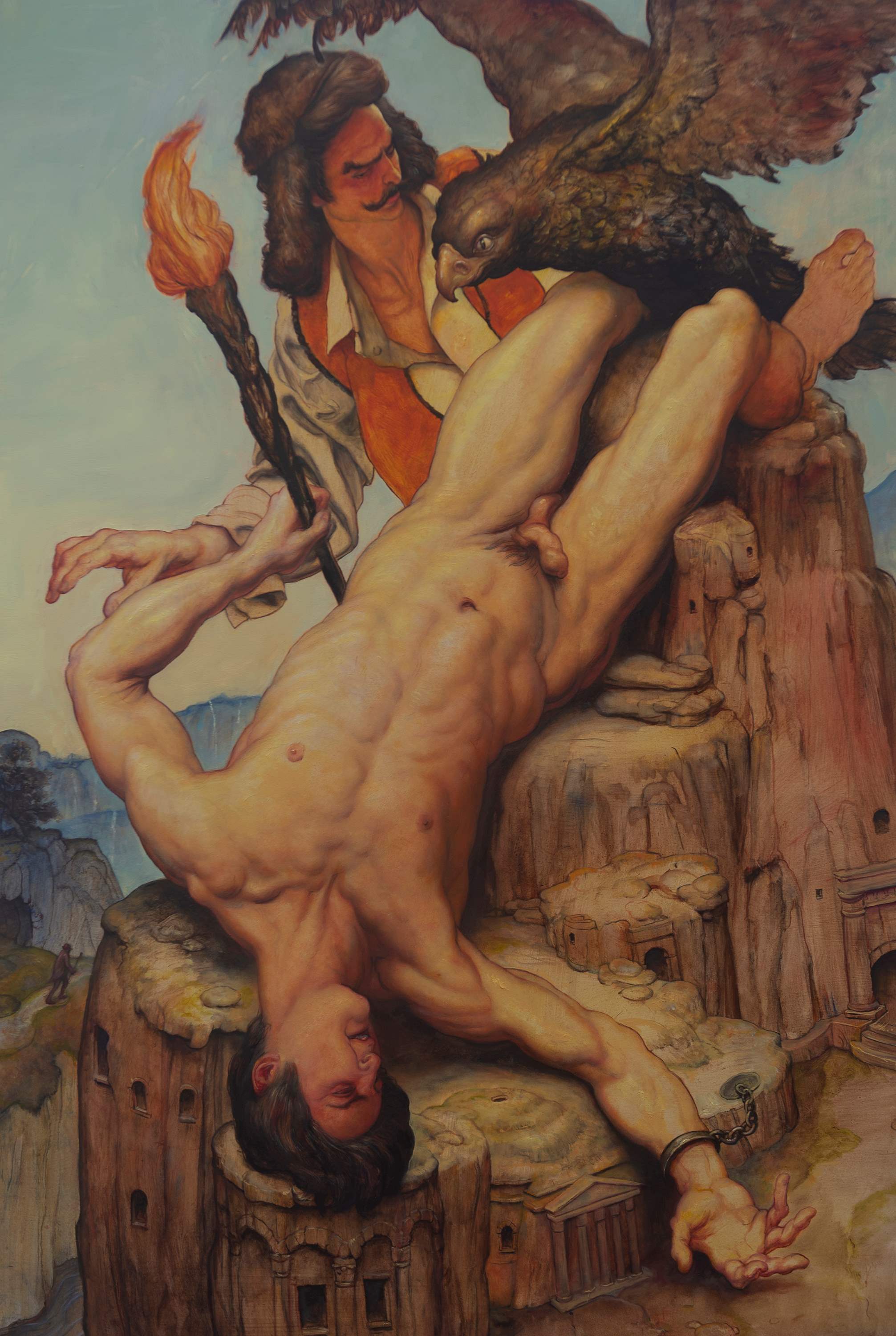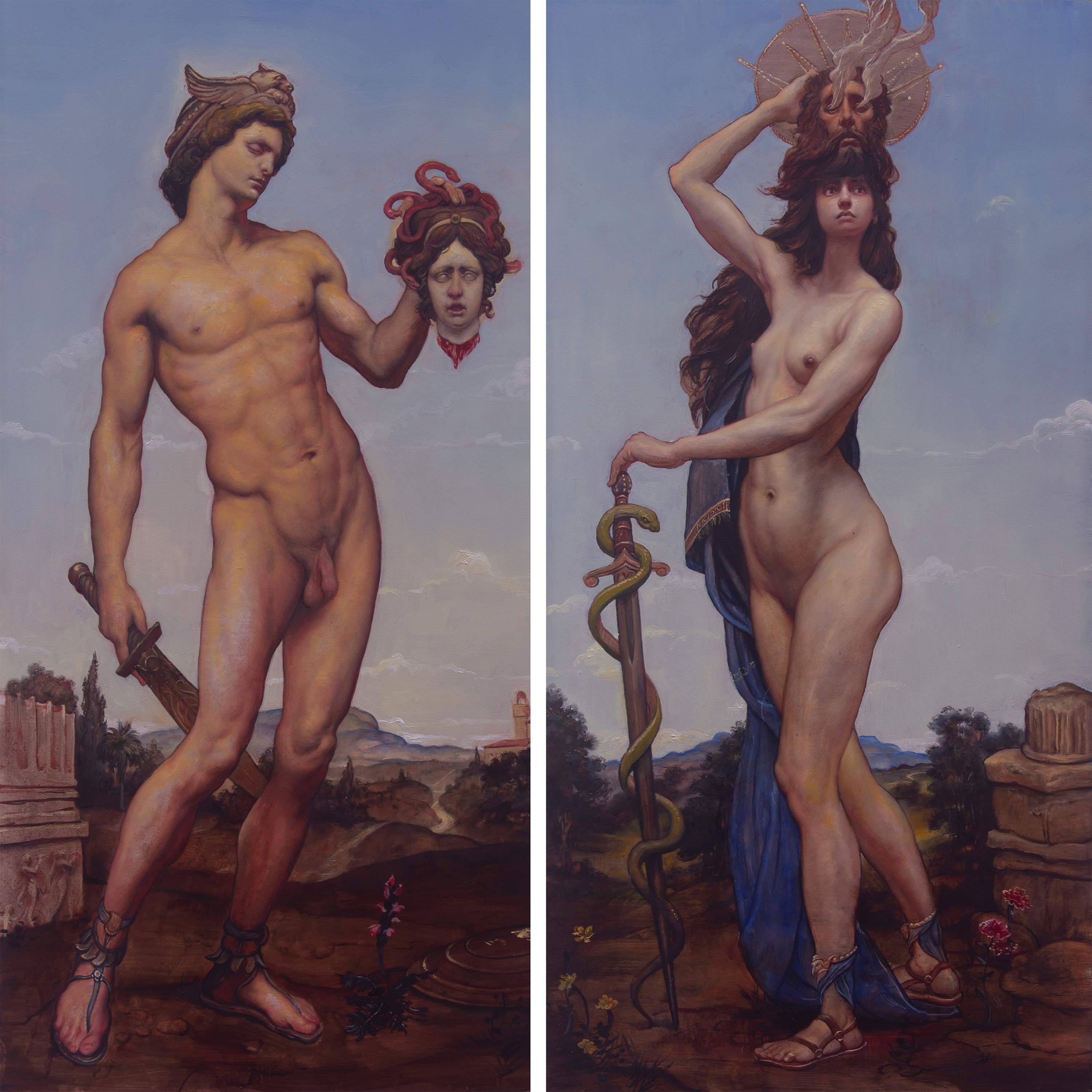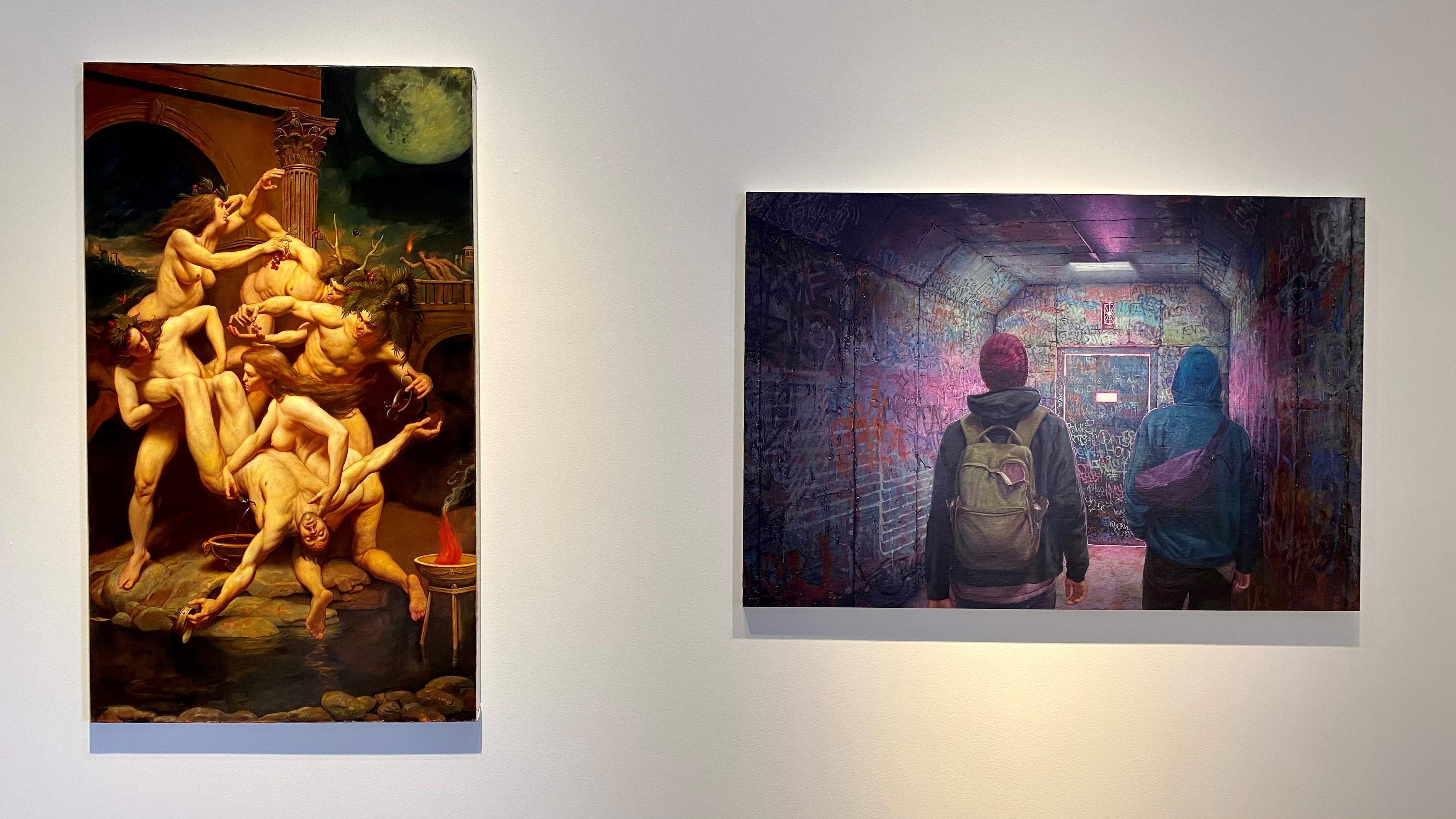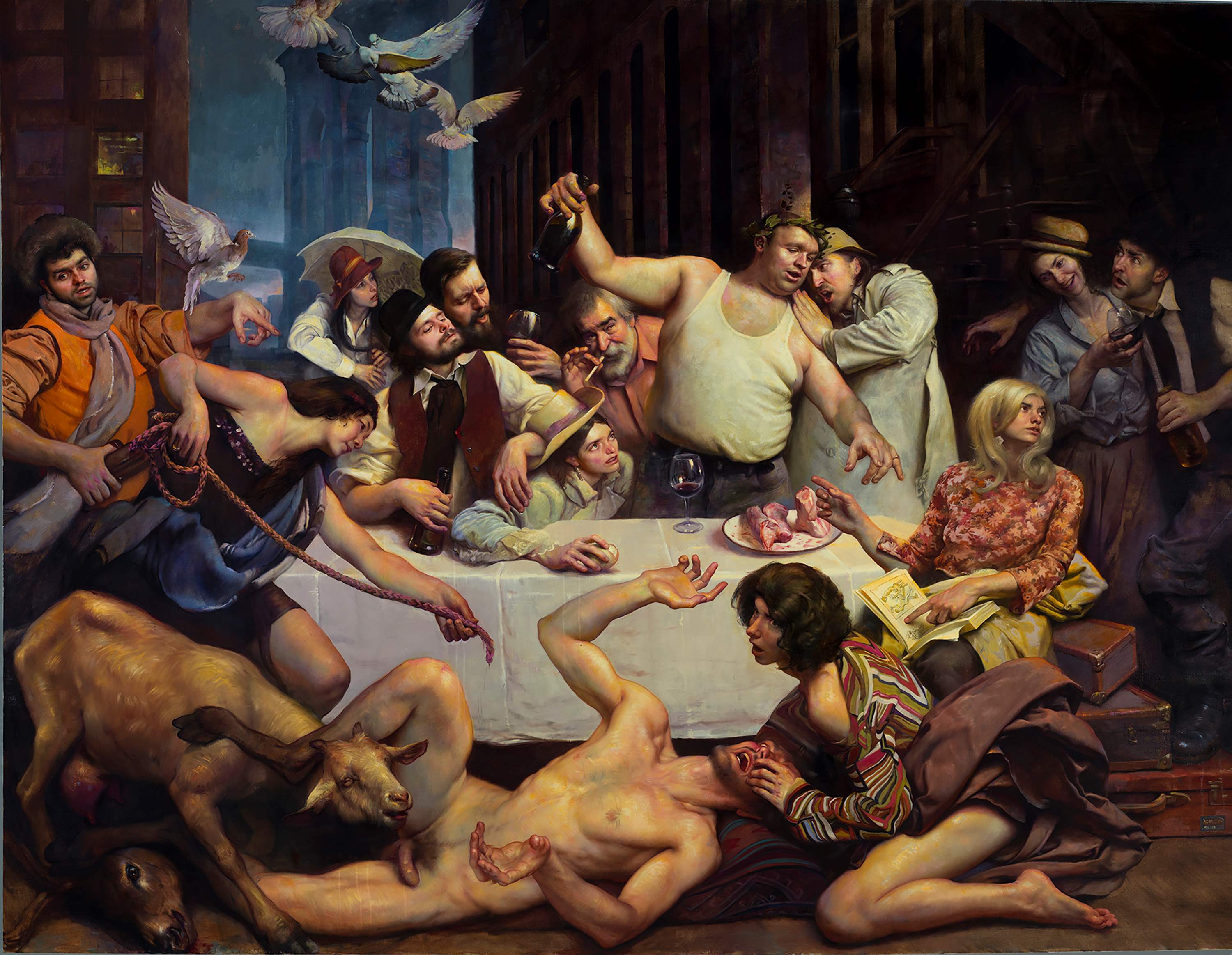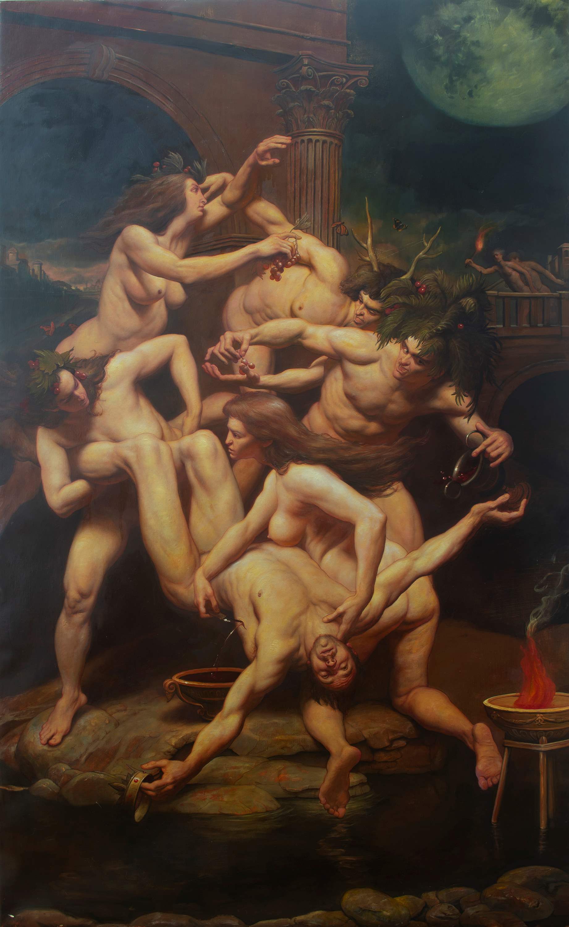 Adam Miller’s main painting in the show is called “Bacchae”. The piece represents the moment King Pentheus is killed by the followers of Bacchus, the god of wine, whom they attempted to bar from entering Thebes. More and more of the townspeople and even his own family joined the rights, unable to resist the pleasure and search for transcendence while Pentheus attempted to hold the old order of the city steady. Finally, he went out to see for himself the dancing women and rituals. Under the influence of a hallucination the women from his own family mistook him for a boar and ripped him the pieces. Referring to the theme of the show, this scene marks the moment where new forces arrive in a society, bringing disorder and change and in the act of resisting, the king or traditional powers are overthrown by the madness sweeping the people.