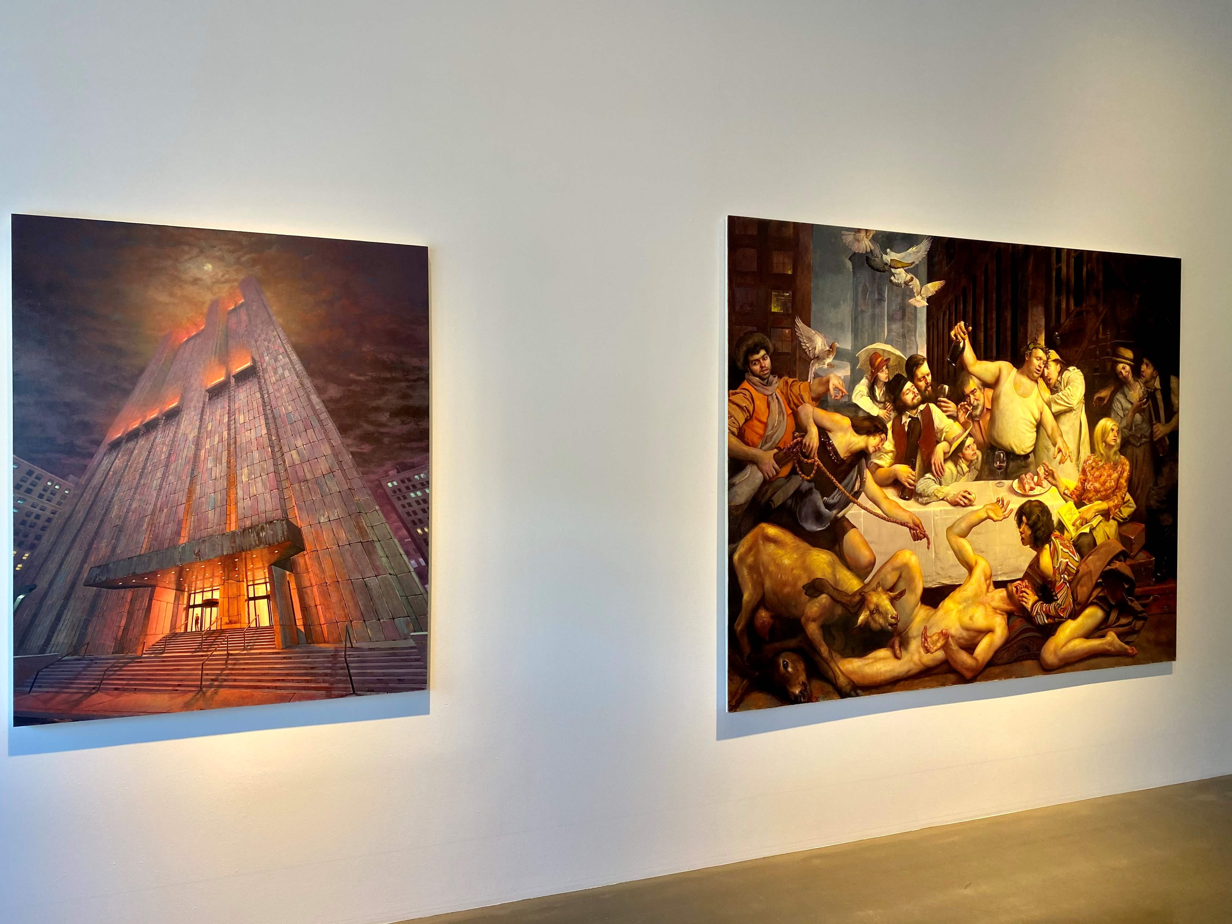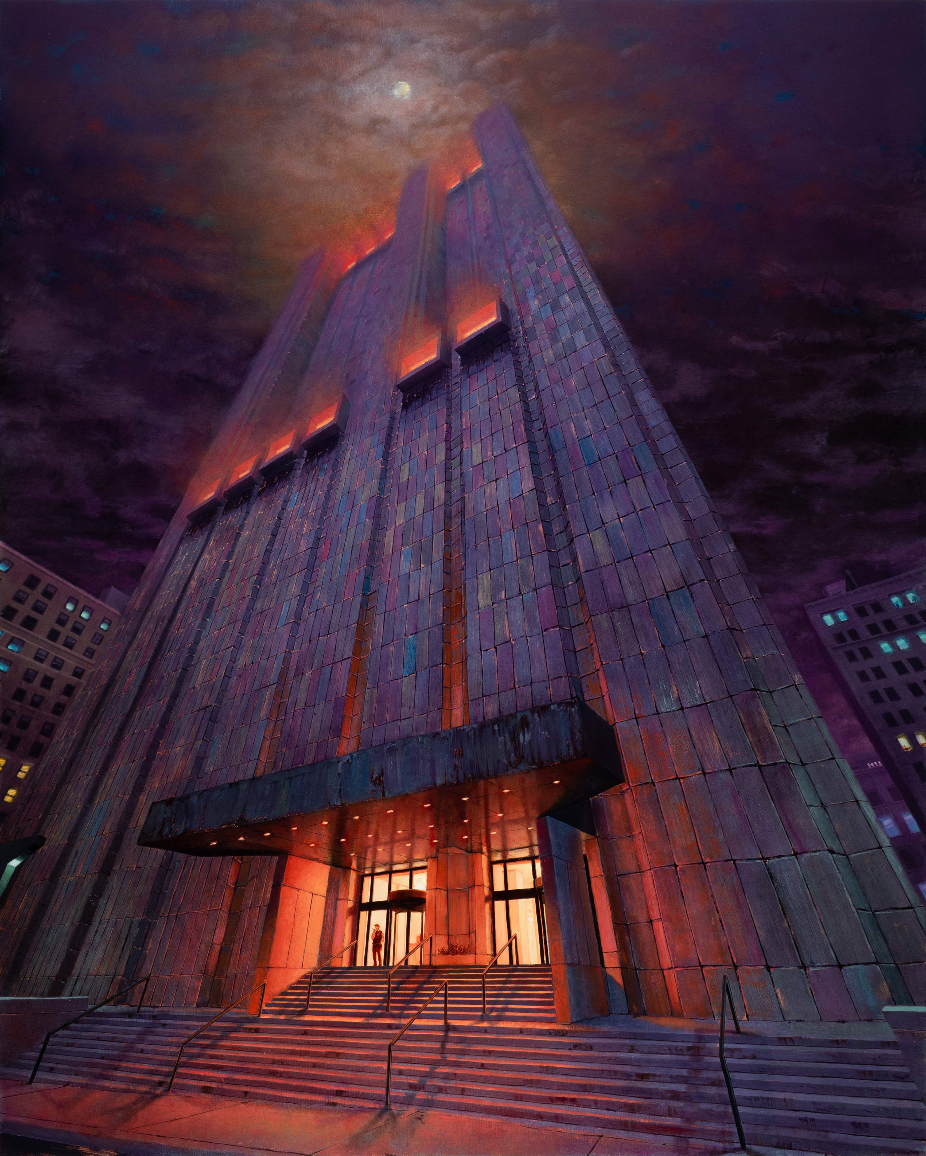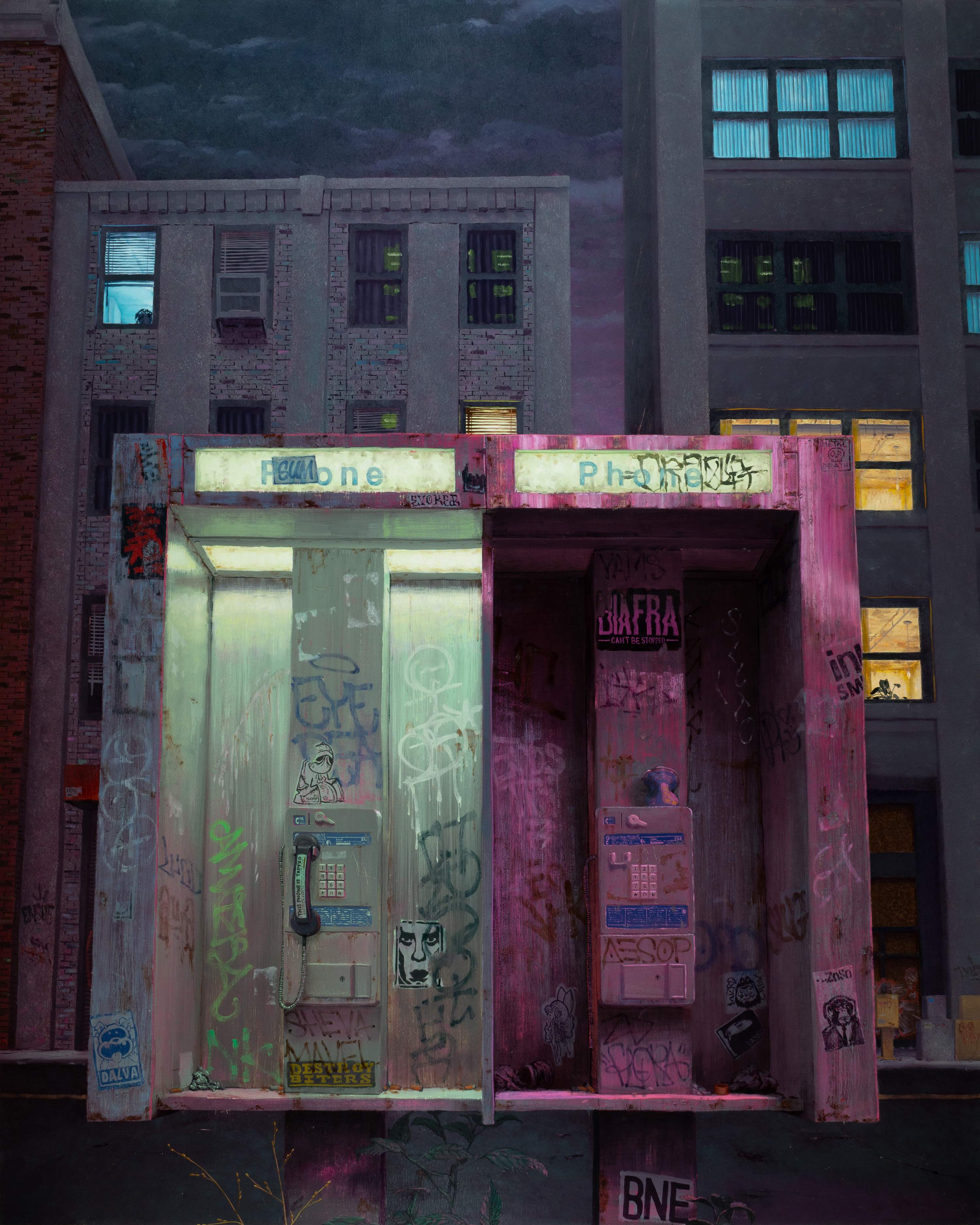 With the painting “Mediated Networks” Taylor Schultek addresses the late phone box, which was phased out and replaced by the cell phone during the 1990s. With the proliferation of the cell phone, the opportunity of total surveillance has become a reality, which Taylor focuses on in the painting “Titanpointe”. The painting depicts a real building, the former AT&T building on 33 Thomas Street, Tribeca, New York. In 2003 Edward Snowden revealed that this building was hiding a secret. A big part of the building was owned and driven by NSA, which was unknown to most of the employees at AT&T- The building had the code name Titanpointe under operation X and was a part of the American government’s daily surveillance of 175 million calls a day for long-distance and international communication. The brutal fortress-like building - devoid of any windows - is the perfect exemplar of the government’s surveillance of its own citizens in collaboration with multinational mega companies.