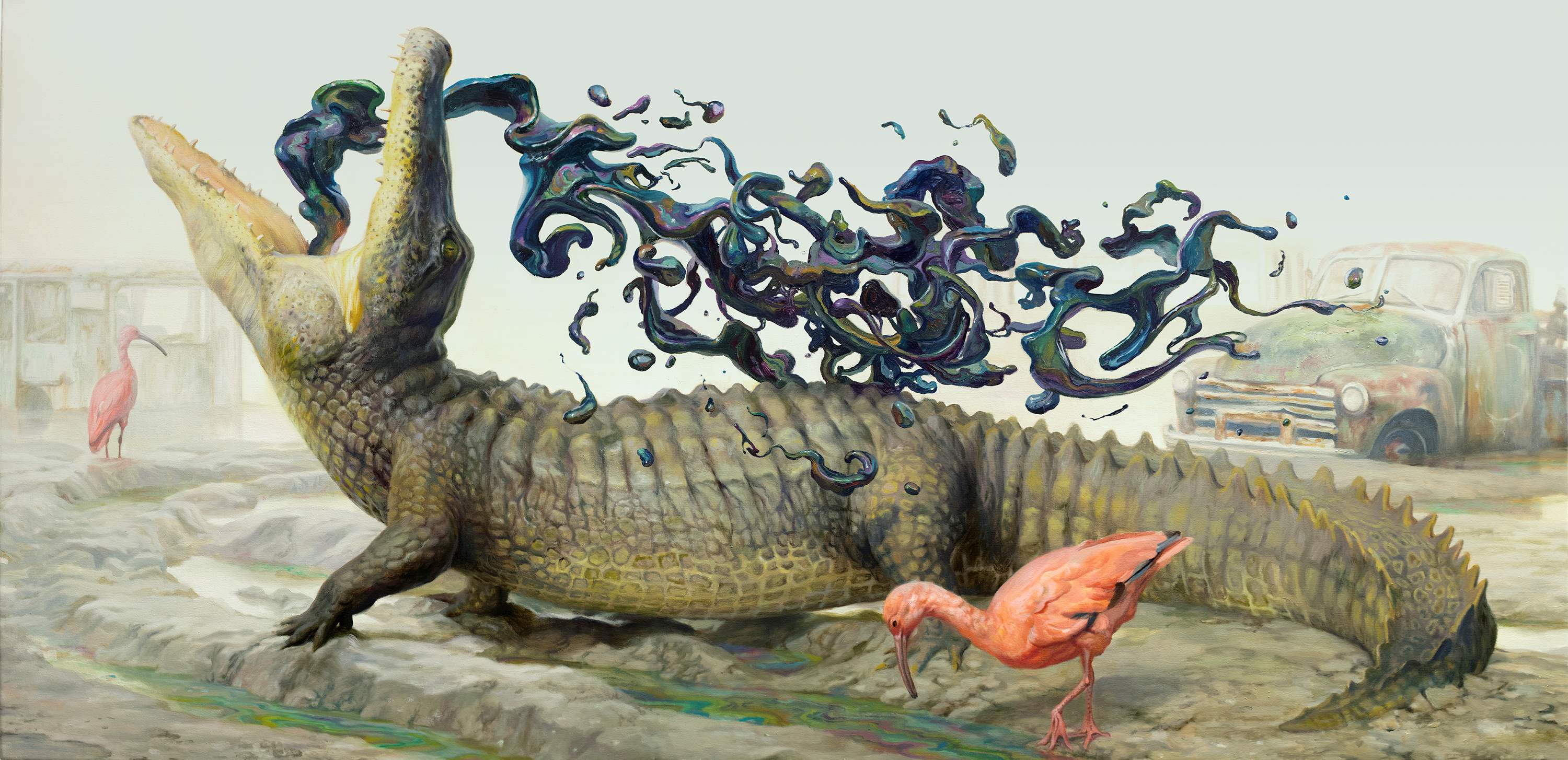 In the new paintings “Influencers” and “Beach Day” Martin Wittfooth introduces human figures into his work - previous to this exhibition, his works have been absent of them - as a reflection on the way that we have placed ourselves centrally within history’s unfolding narrative. The self-staging and the attempt to make ourselves the star of our own lives, as manifested in our increasingly ubiquitous relationship with social media, removes us from the physical, real world and instead we live an artificial life online where success is measured in likes. In these new works, we’re no longer simply influencing the world around us, but have become addicted to the notion that we occupy a star role, where content doesn’t matter, it’s all about ME! The addiction of approval and recognition we can achieve on social media here and now is like a fix, as soon as the intoxication is over, we are already working on the next, fresh thing, and this cycle then repeats itself. This vacuum of awareness of wider consequences is looked at in the paintings “Petroleum” and “Borealis”: the forced adaptation that must occur in the wake of this disruptive dynamic.