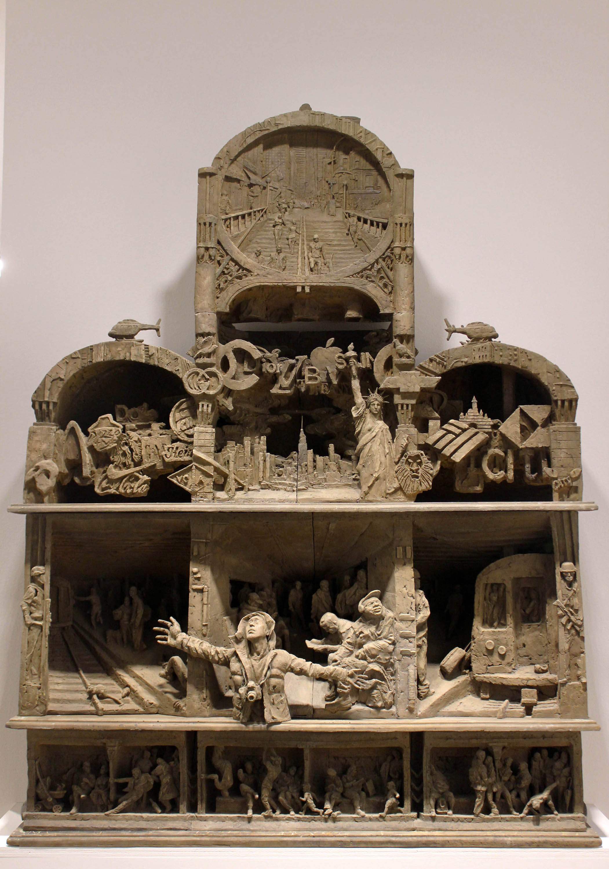 With the underground space being his focal point, Chinese Jiannan Wu has created an impressive sculptural edifice of great dimensions. A fantastic detailed 60-inch tall underground station has captivated the gallery space. The piece titled "New York New York" is elegantly created as a magnificent classical relief, but the keen observer will quickly note the satire within the many scenarios played out in the four levels of the sculpture. The subway has become a regular space for a multitude of people, across all levels of society, seated shoulder to shoulder, until they leave this temporary reality and return to their daily lives without looking back.