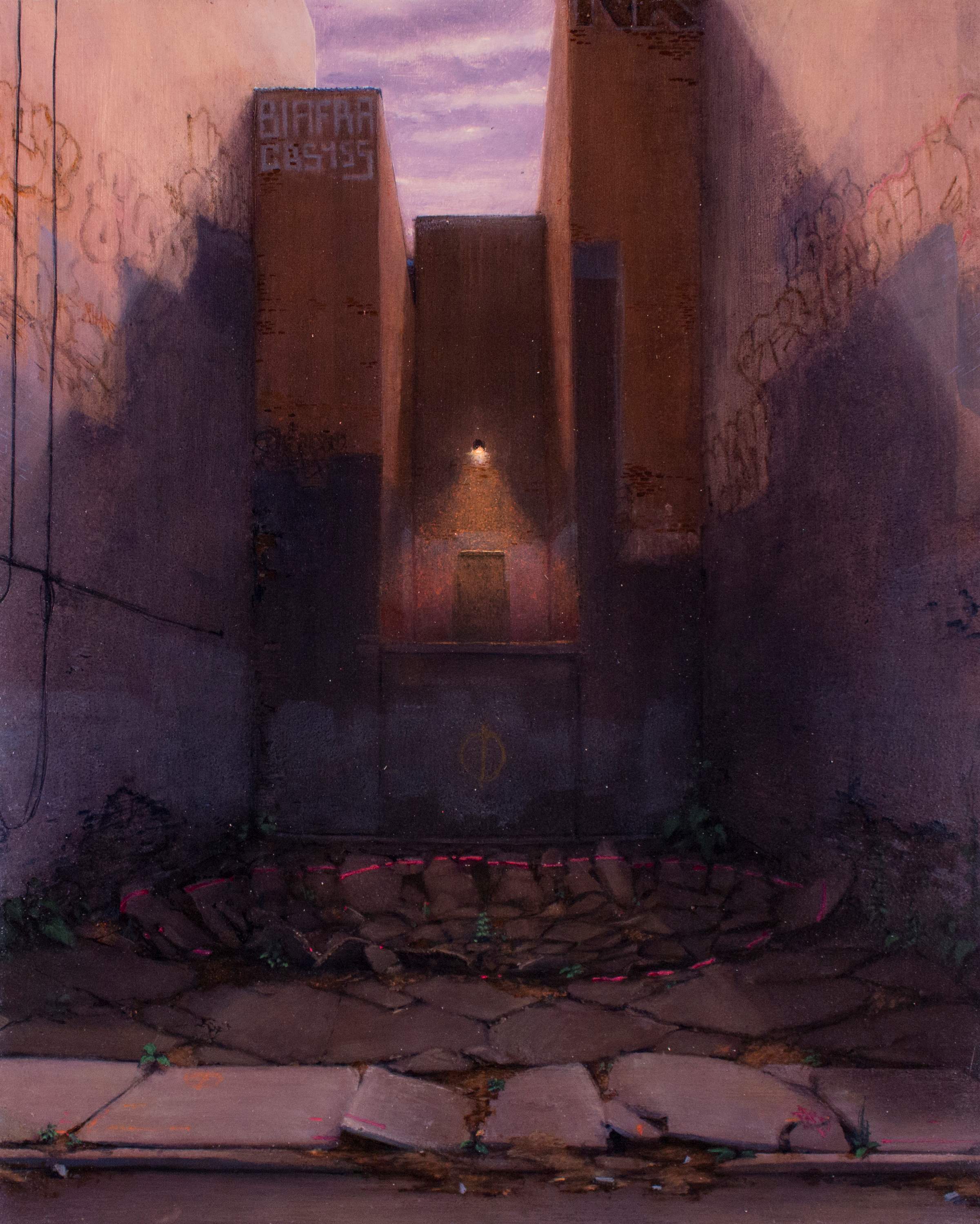 Virtual reality meets graffiti culture in a very fine visual concoction in Taylor Schultek’s canvas. With a firm brush he illustrates a number of seemingly deserted alleys and abandoned spaces. The discreetly embedded, yet alluring glimmers of light reveal, however, that they are not desolated spaces. On the contrary, they are an expression of man's imprint on the world. Each beam of light heralds life just around the corner, behind the door and right there under the stairs.