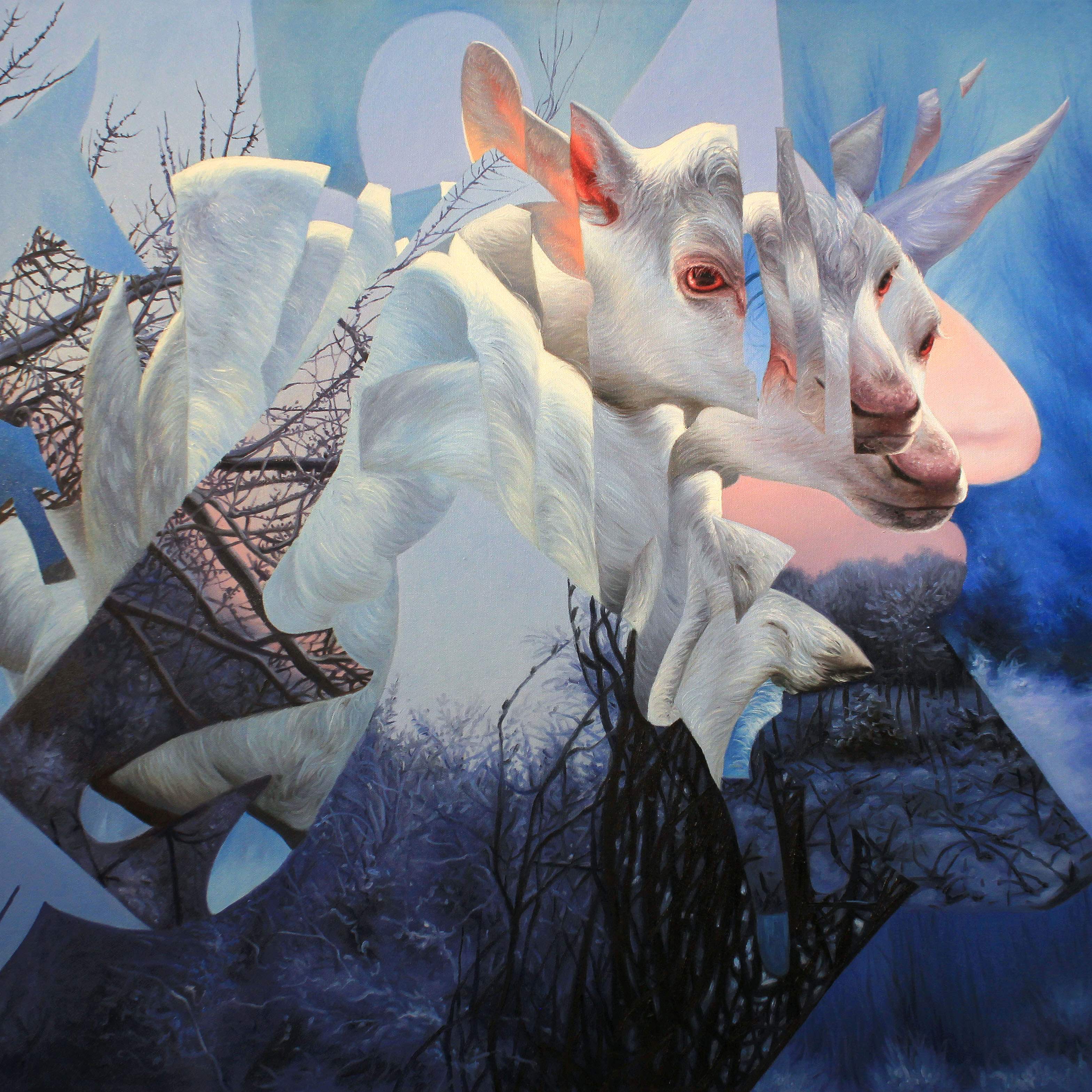 Angela Gram is similarly working with fragments of an otherwise identifiable reality, however, in a more literal sense. Gram has created four distorted works of an else ways natural world that she splits into strange and surreal shapes. She challenges the way we understand the picturesque scenery. This is not merely an aesthetic scattered puzzle, but in her many layers we experience nature's savagery, which is spread out in a modern Western context, piece by piece.