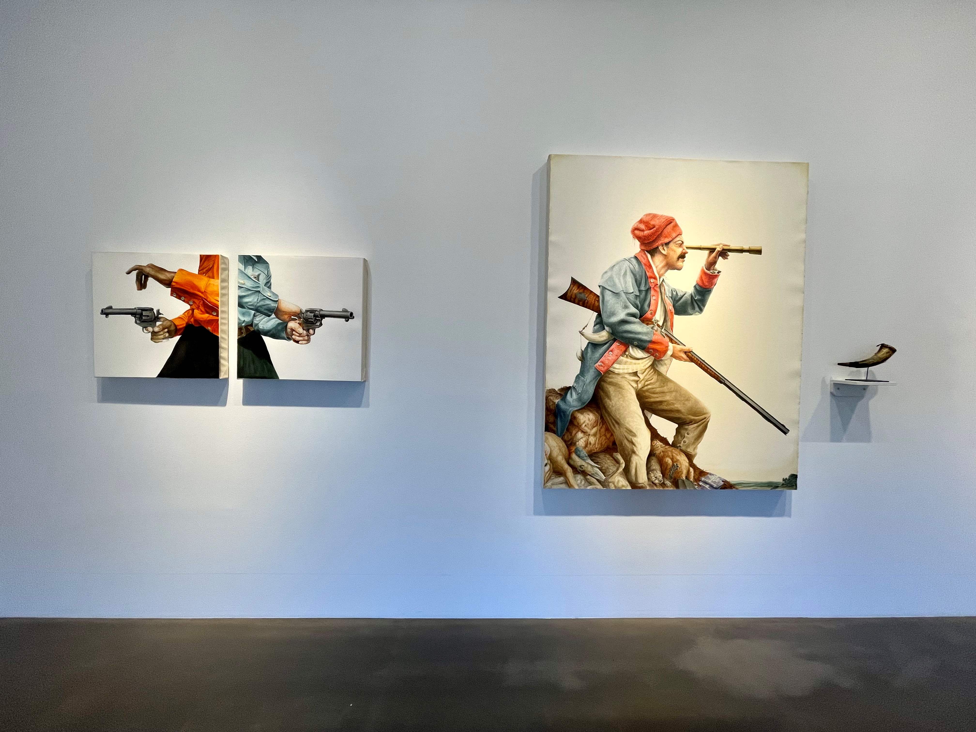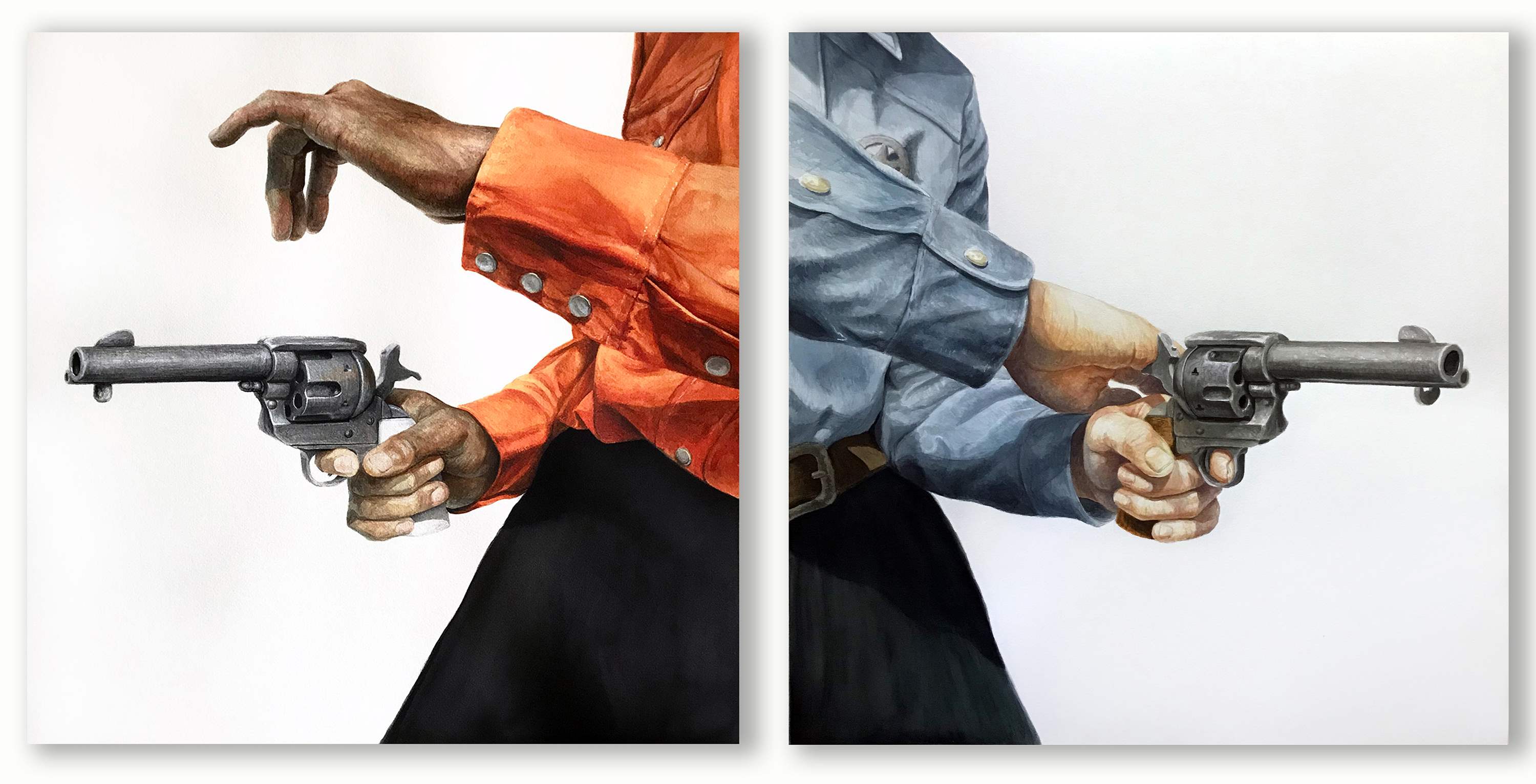The often-distorted myths and stories of the Wild West are applied in Jed Webster Smith’s paintings to challenge, comment on and convey his own perspective on the tendencies and conflicts that are unfolding in the US today. The inherent social criticism lay as a subtle layer underneath the figurative expression of the paintings, which forces the viewer to recognize the myth that is being presented before the critique exposes itself. Jed Webster Smith grew up in rural Colorado surrounded by the American Western myth and its rugged characters. Because of this the Western genre offer, for Webster Smith, a recognizable image that is unavoidably connected to the American perception of identity which he is using in his artistic comments on currents events.