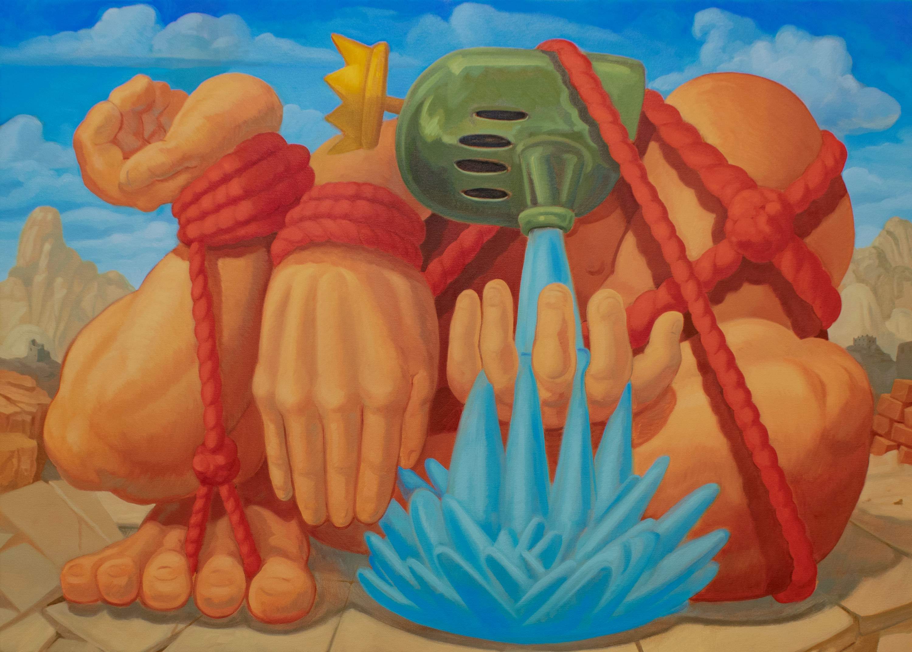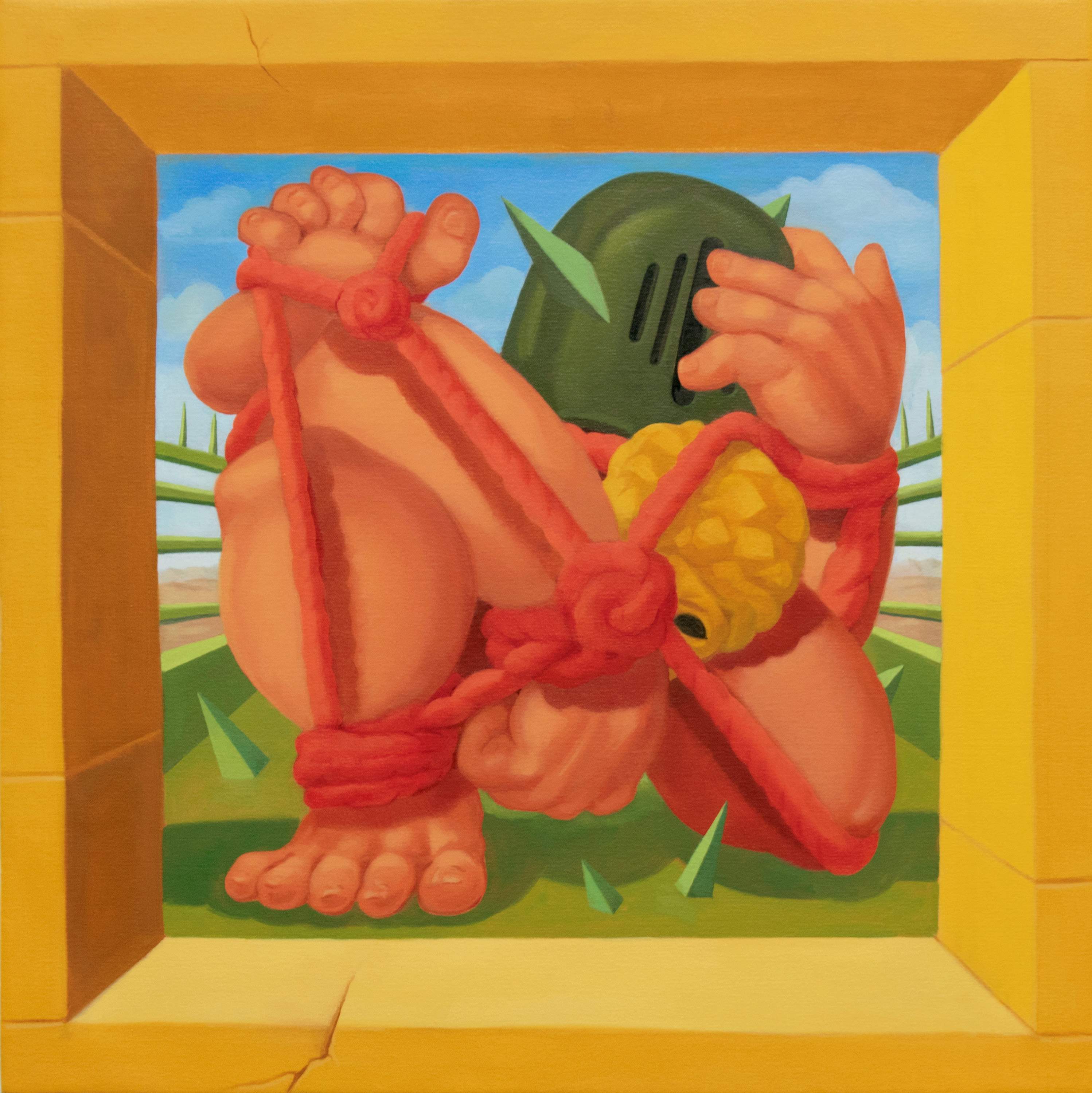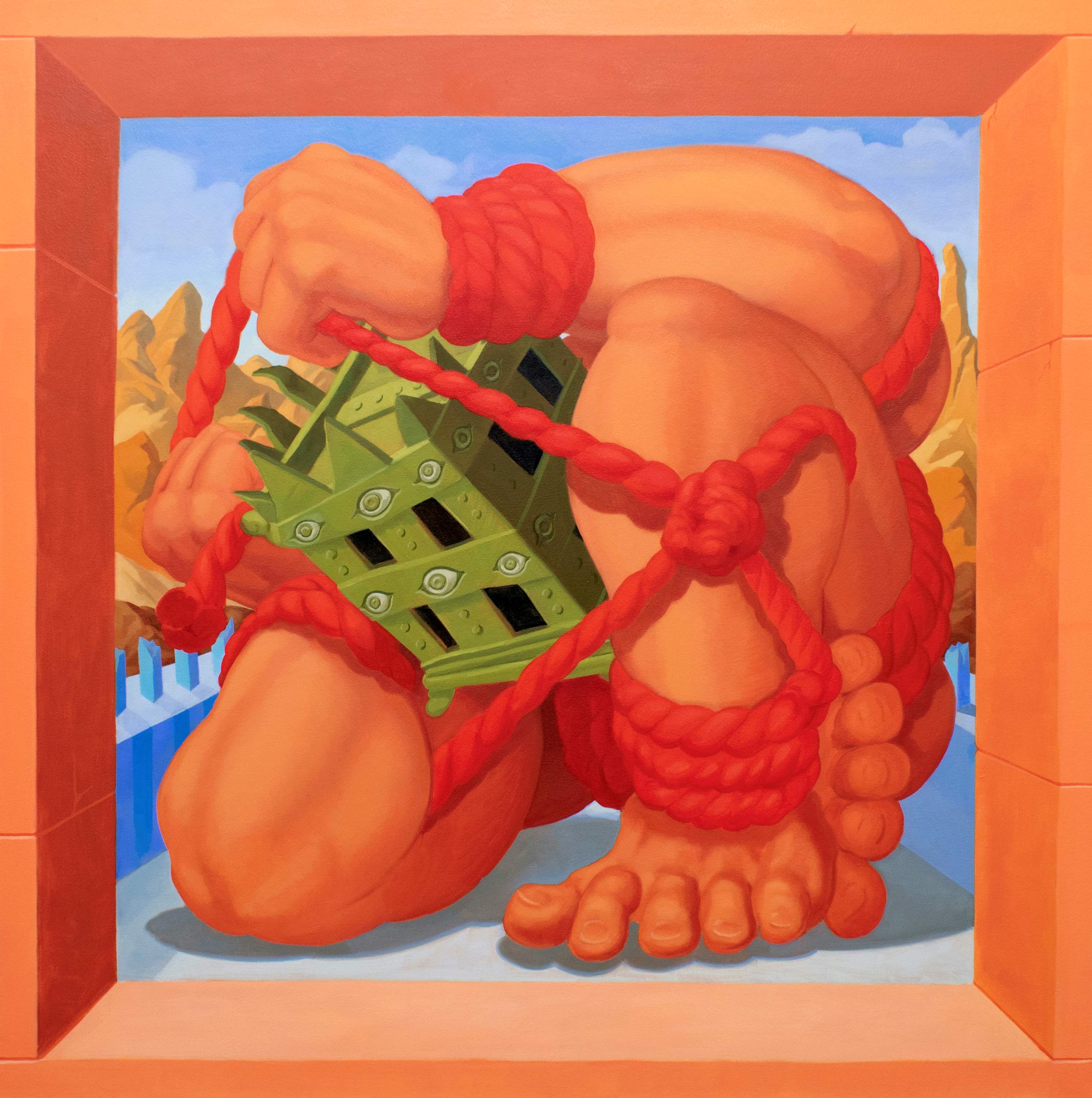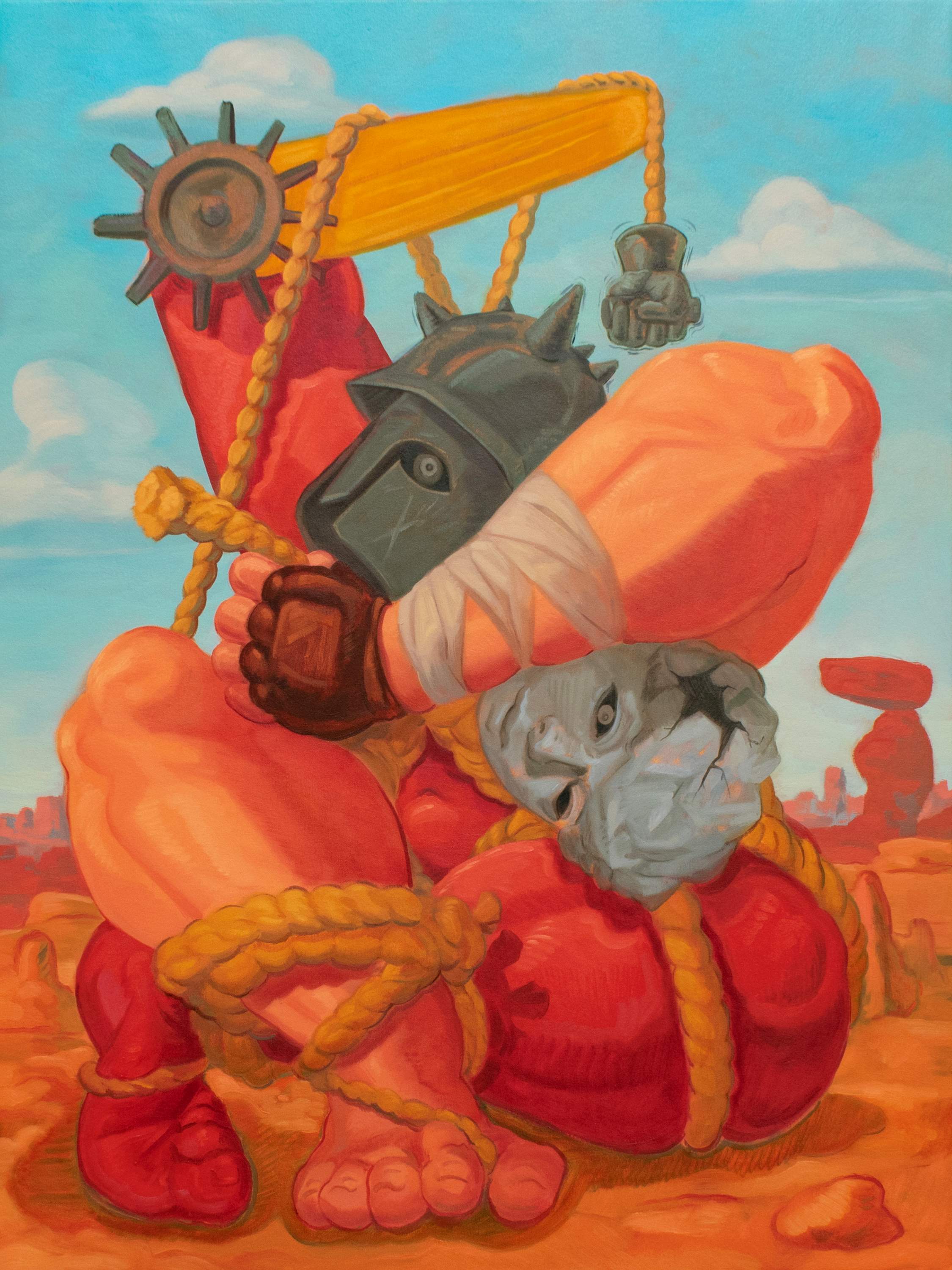 Massive, ungainly figures, bound up in ropes fill the entirety of Zachary Lank’s canvas. These bundled up giants become icons of futility as they are unable to imagine a way out of their own predicament. Some of them we see through windows, reminiscent of cells, suggesting one prisoner looking at another. Lank terms this series of works that is influenced by Roman friezes, religious paintings of the Quattrocento as well as the work of 20th century painters like Philip Guston, Stanley Spencer and the Mexican muralists Jose Clemente Orozco and Diego Rivera, as his own “Titanomachy”. They are depictions telling a story of power and its limitations, thinking of the body as both a free subject and a prison. Lank highlights the dualities of strength and impotence, the longing for freedom versus the fear of one day getting it. Even if these Titans were to break free, they would be lost souls destined to wander the desert that surrounds them. In these works, we are prompted to explore ancient Theogony, how agencies come into being, and the recurring manifestation of the physical body as both a jailer and the jailed in a visual account of the world’s becoming.