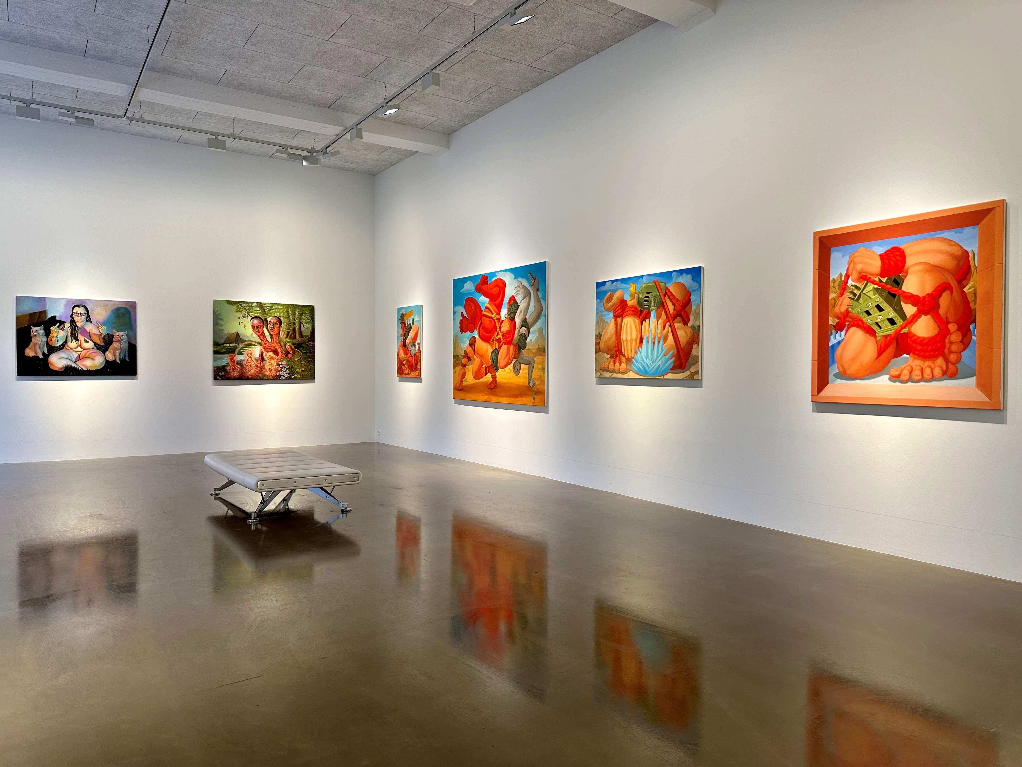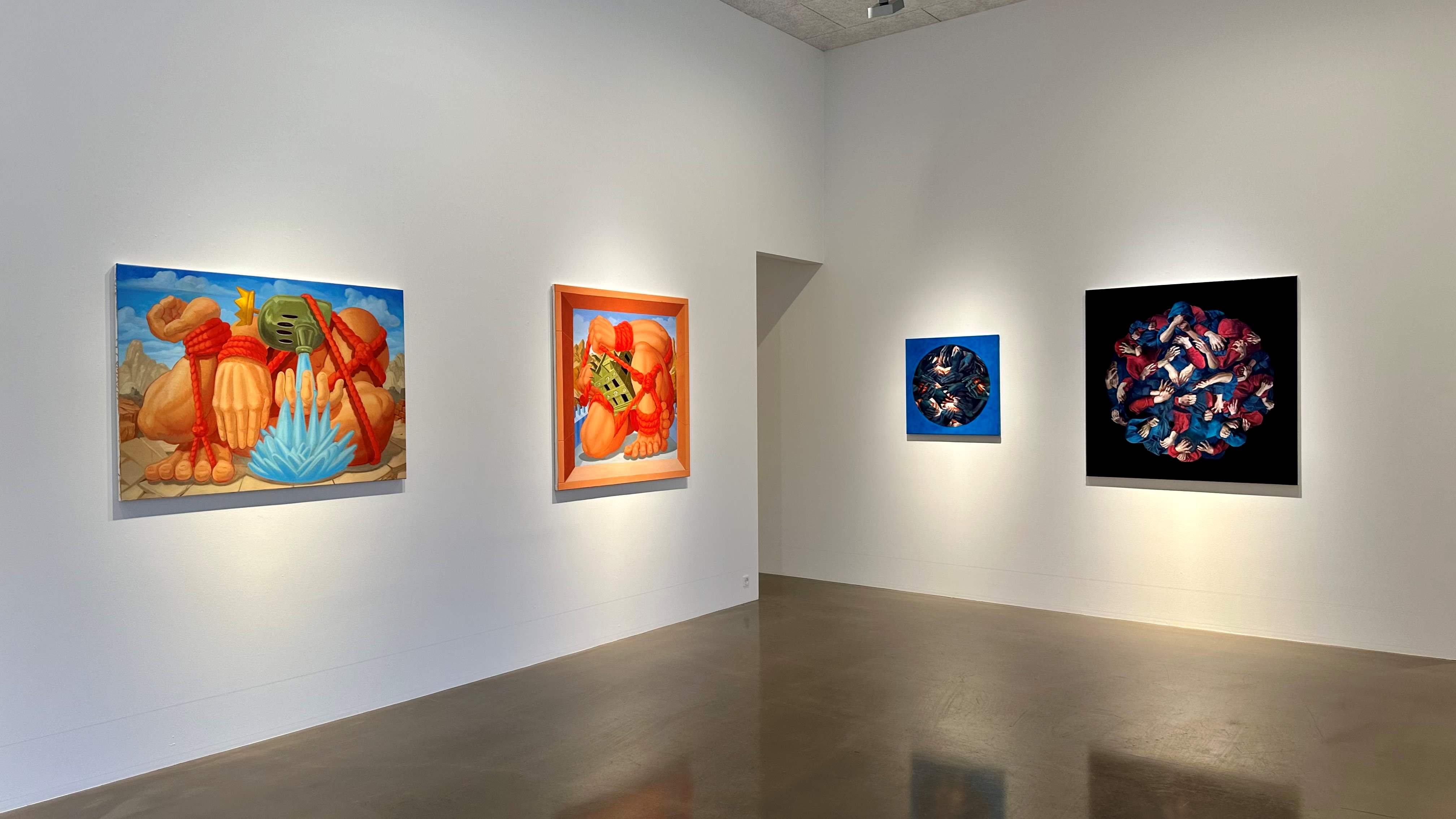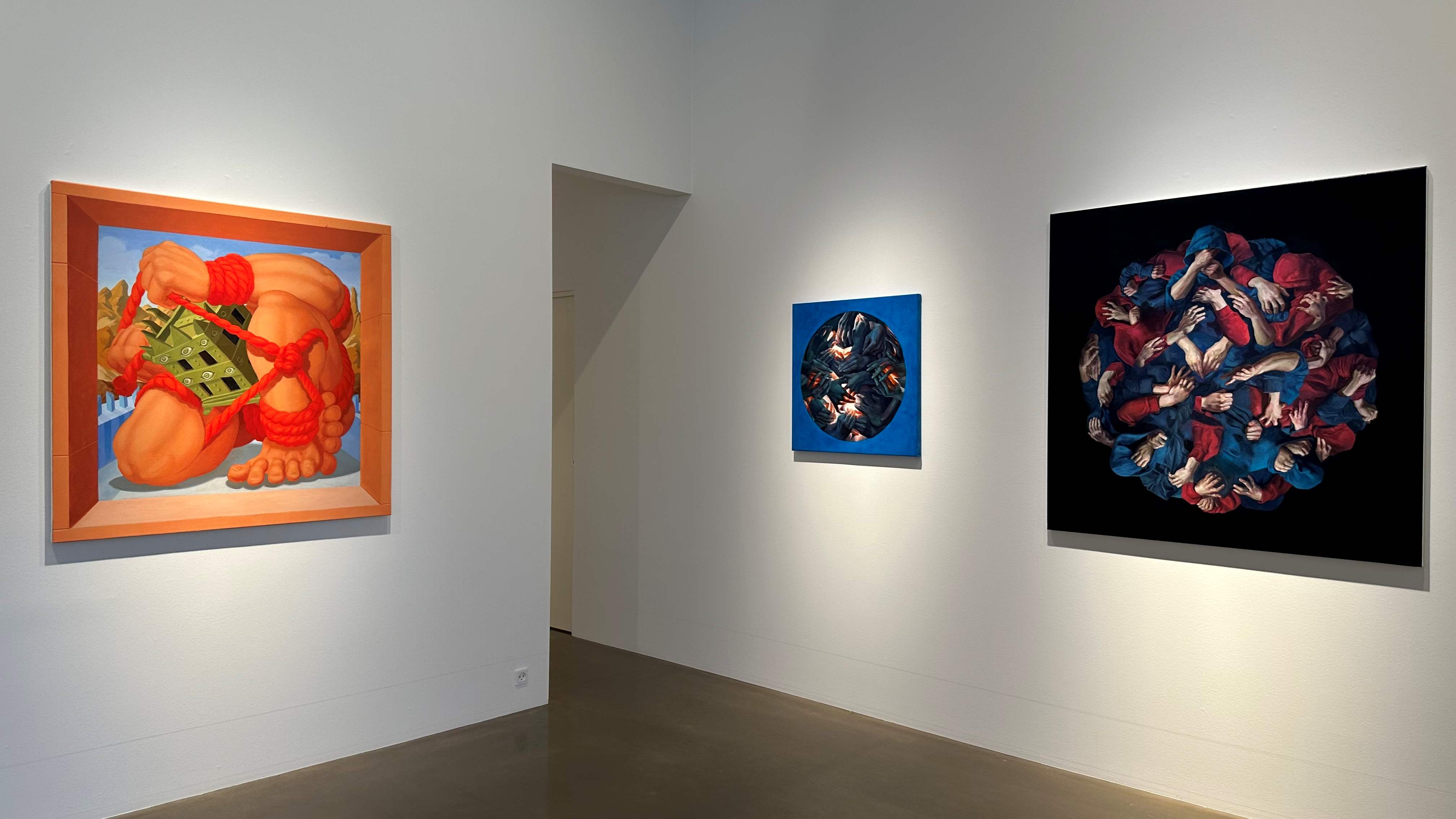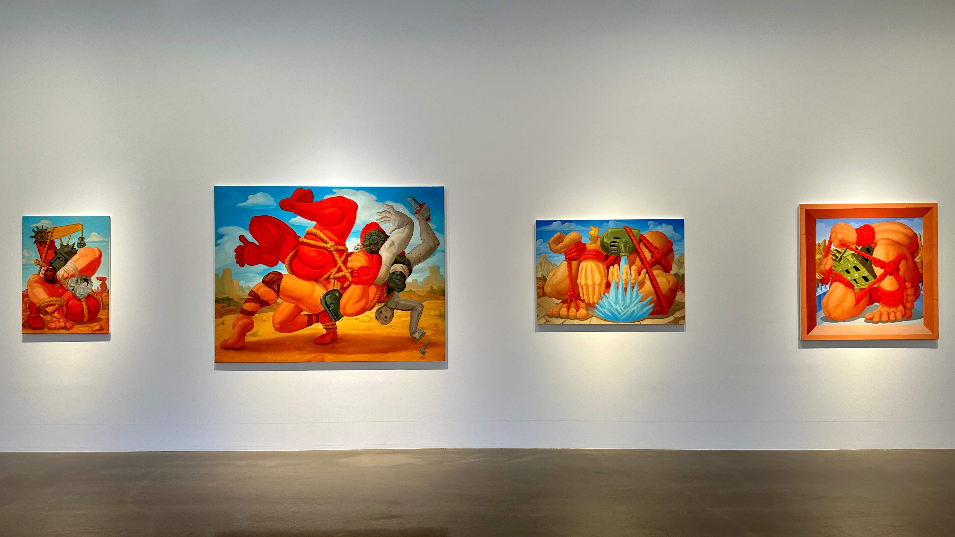 Massive, ungainly figures, bound up in ropes fill the entirety of Zachary Lank’s canvas. These bundled up giants become icons of futility as they are unable to imagine a way out of their own predicament. Some of them we see through windows, reminiscent of cells, suggesting one prisoner looking at another. Lank terms this series of works that is influenced by Roman friezes, religious paintings of the Quattrocento as well as the work of 20th century painters like Philip Guston, Stanley Spencer and the Mexican muralists Jose Clemente Orozco and Diego Rivera, as his own “Titanomachy”. They are depictions telling a story of power and its limitations, thinking of the body as both a free subject and a prison. Lank highlights the dualities of strength and impotence, the longing for freedom versus the fear of one day getting it. Even if these Titans were to break free, they would be lost souls destined to wander the desert that surrounds them. In these works, we are prompted to explore ancient Theogony, how agencies come into being, and the recurring manifestation of the physical body as both a jailer and the jailed in a visual account of the world’s becoming.