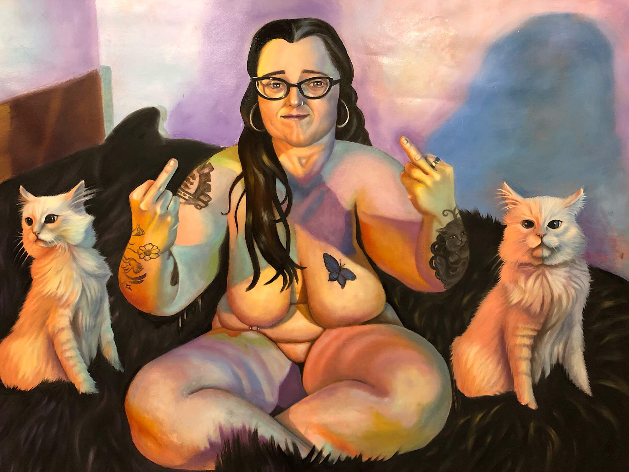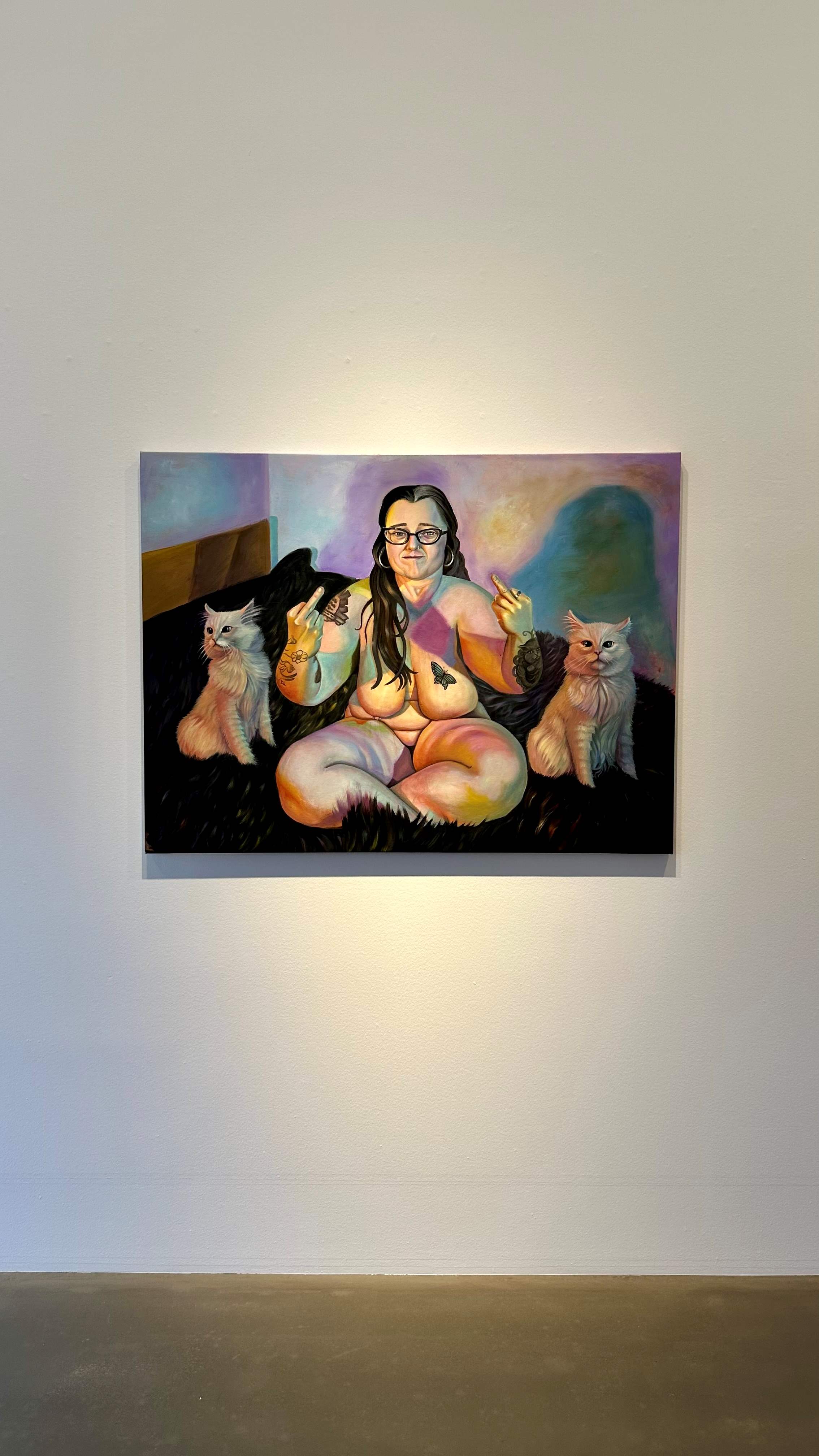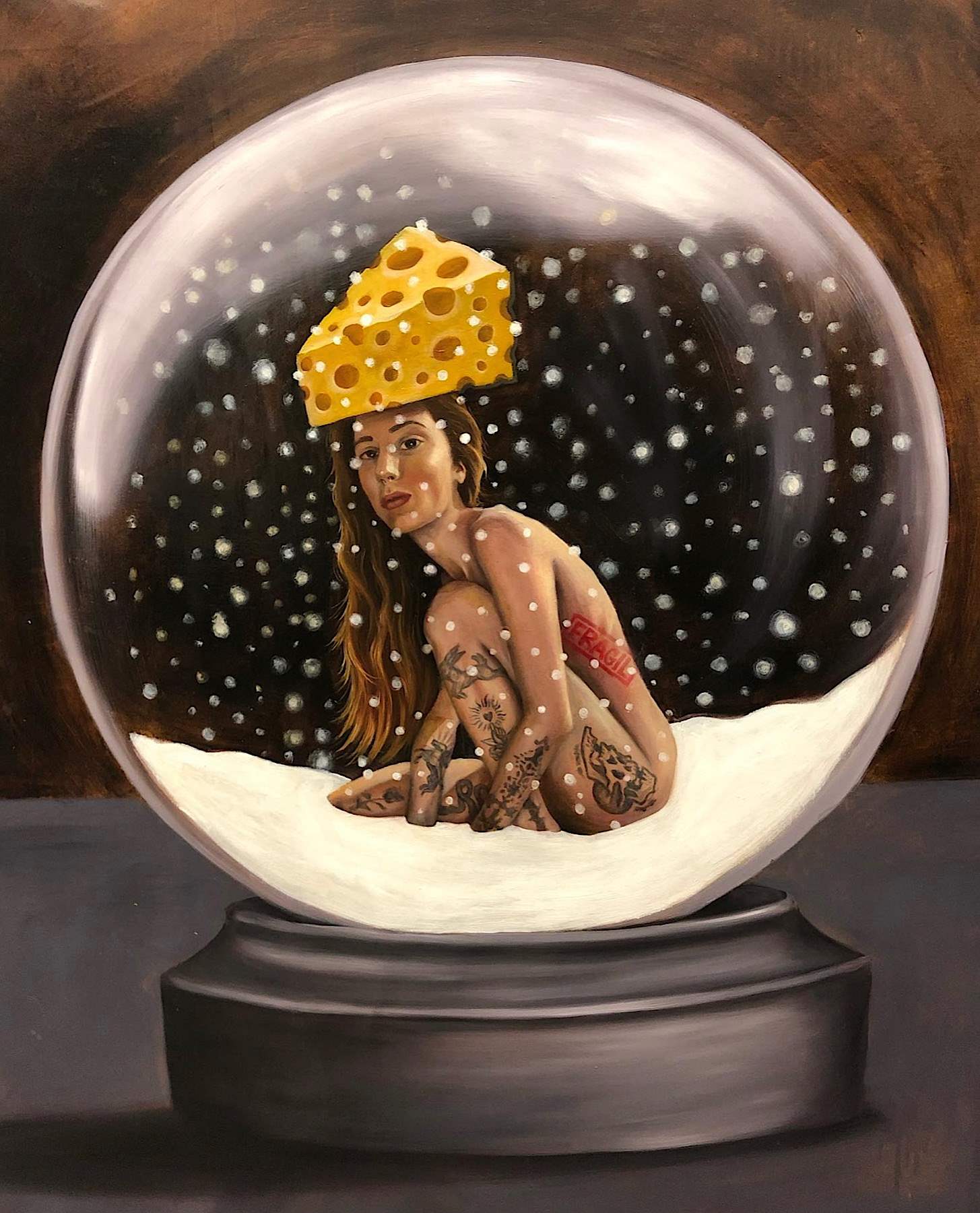 Tslil Tsemet takes us along on an impactful journey of self-discovery in her whimsical, raw depictions that invite viewers to ponder the intricacies of identity, representation and empowerment. Whether it is Tsemet posing stoically in a snowglobe, or a dear friend of hers presenting herself unapologetically to the world, Tsemet’s works explore the challenges perpetuated by societal myths and the strength that lies in the reshaping of these narratives. Her distinctive works exhibit a double-edged sword, blending elements of humor and gravity. In a depiction of a two-headed figure yearning to be included, Tsemet presents viewers with a nuanced exploration of complex themes such as alienation, the desire for acceptance and navigating a life where there are pressures from society. Through her work, she encourages reflection on the quest for belonging, diversity and autonomy in an often divided world.