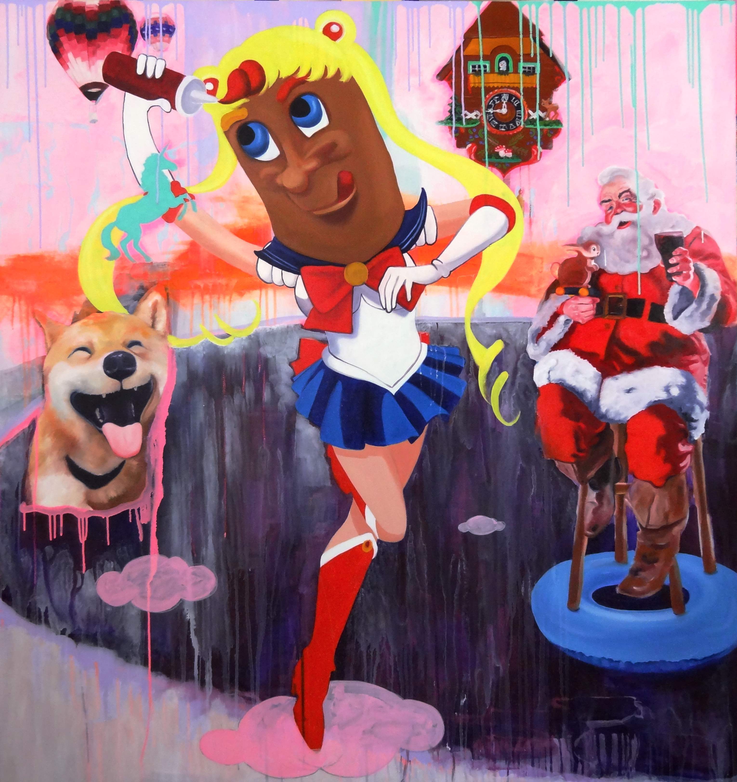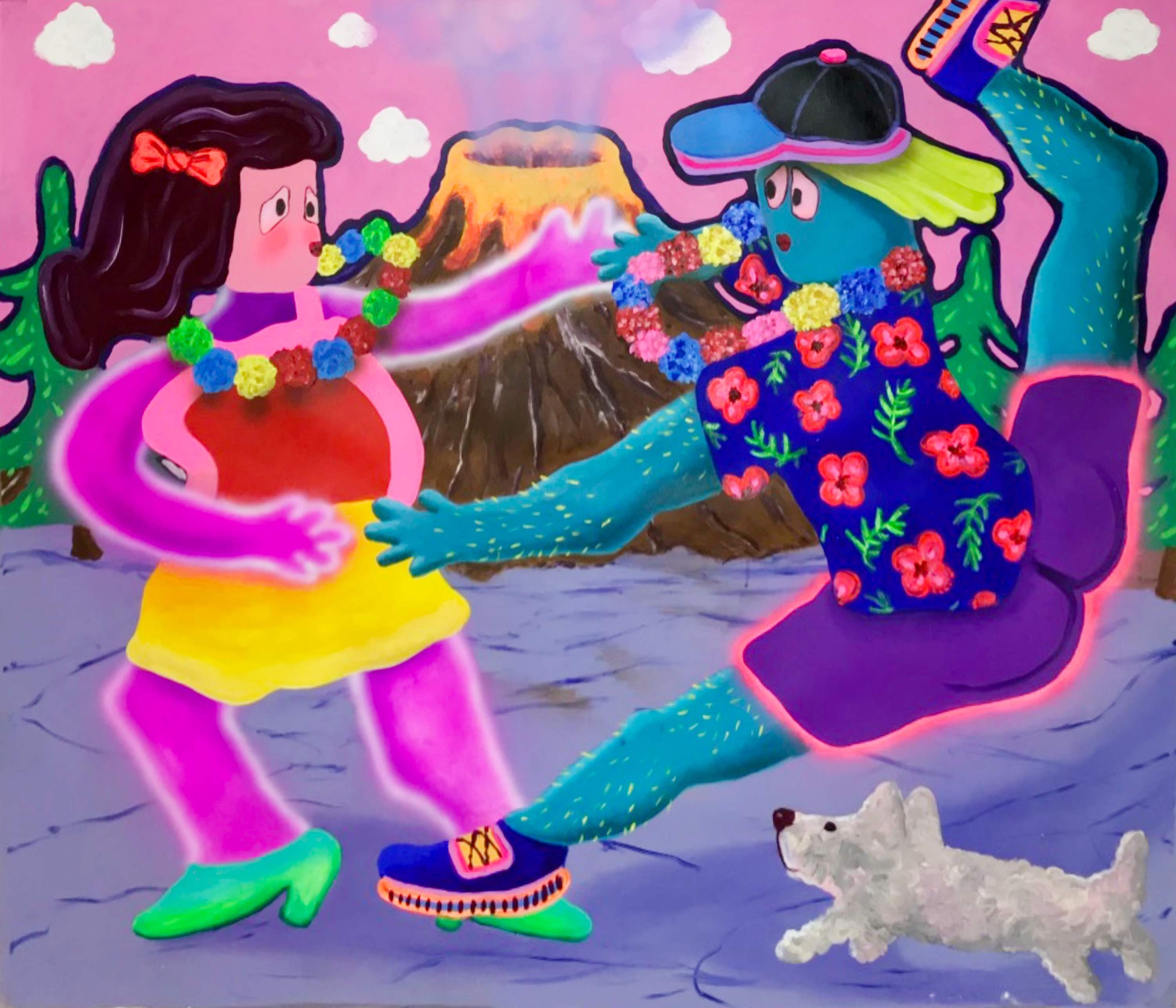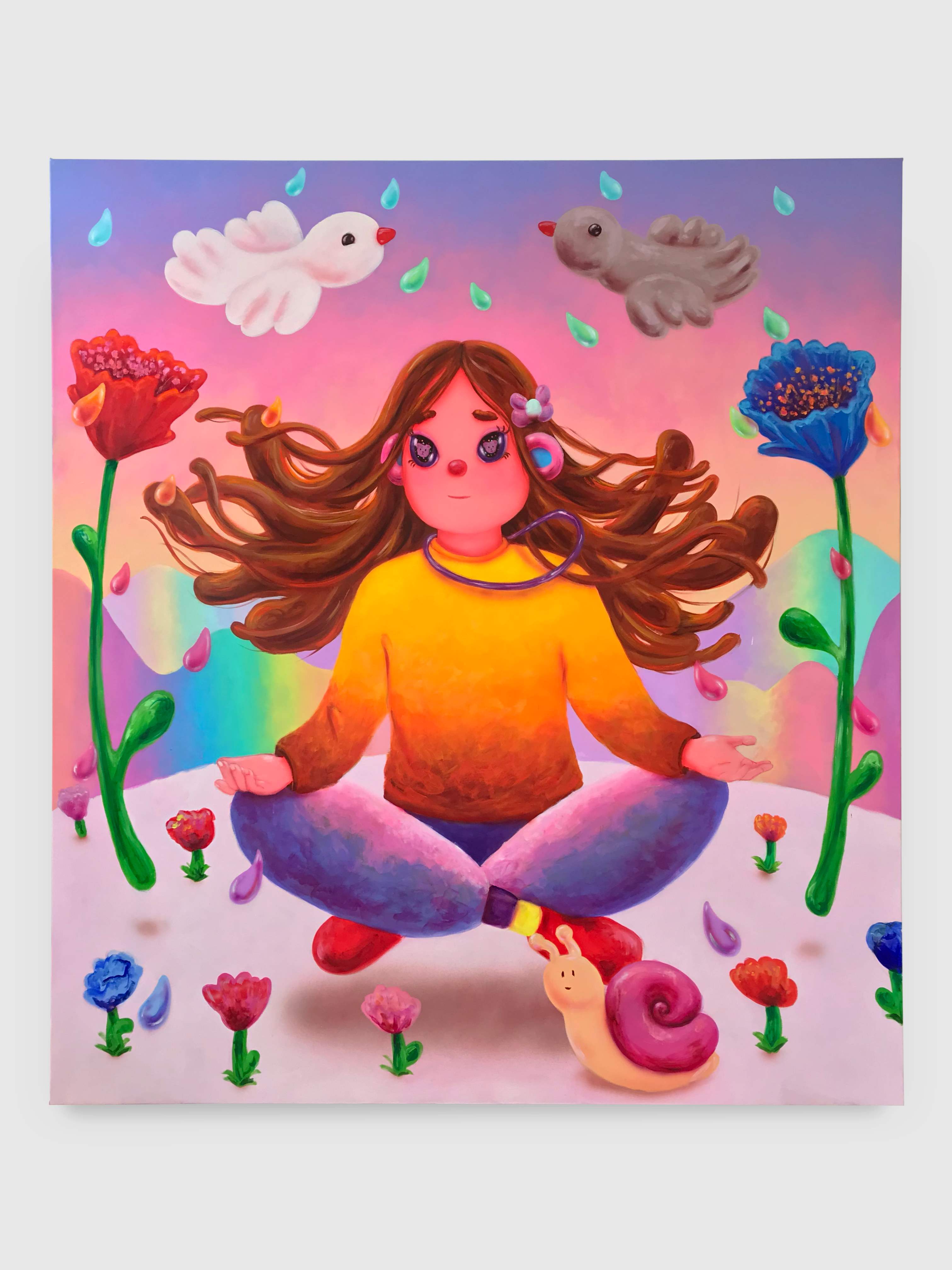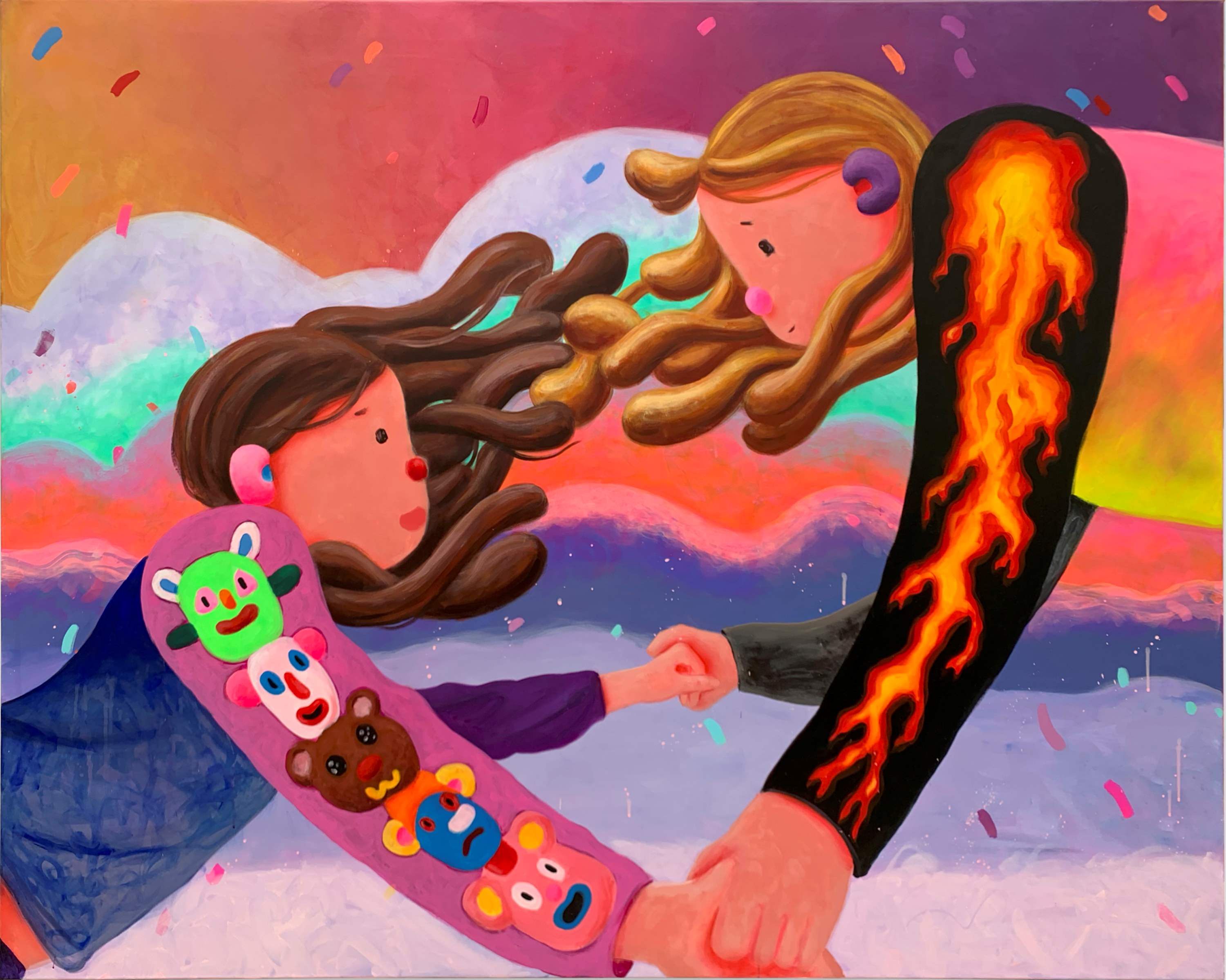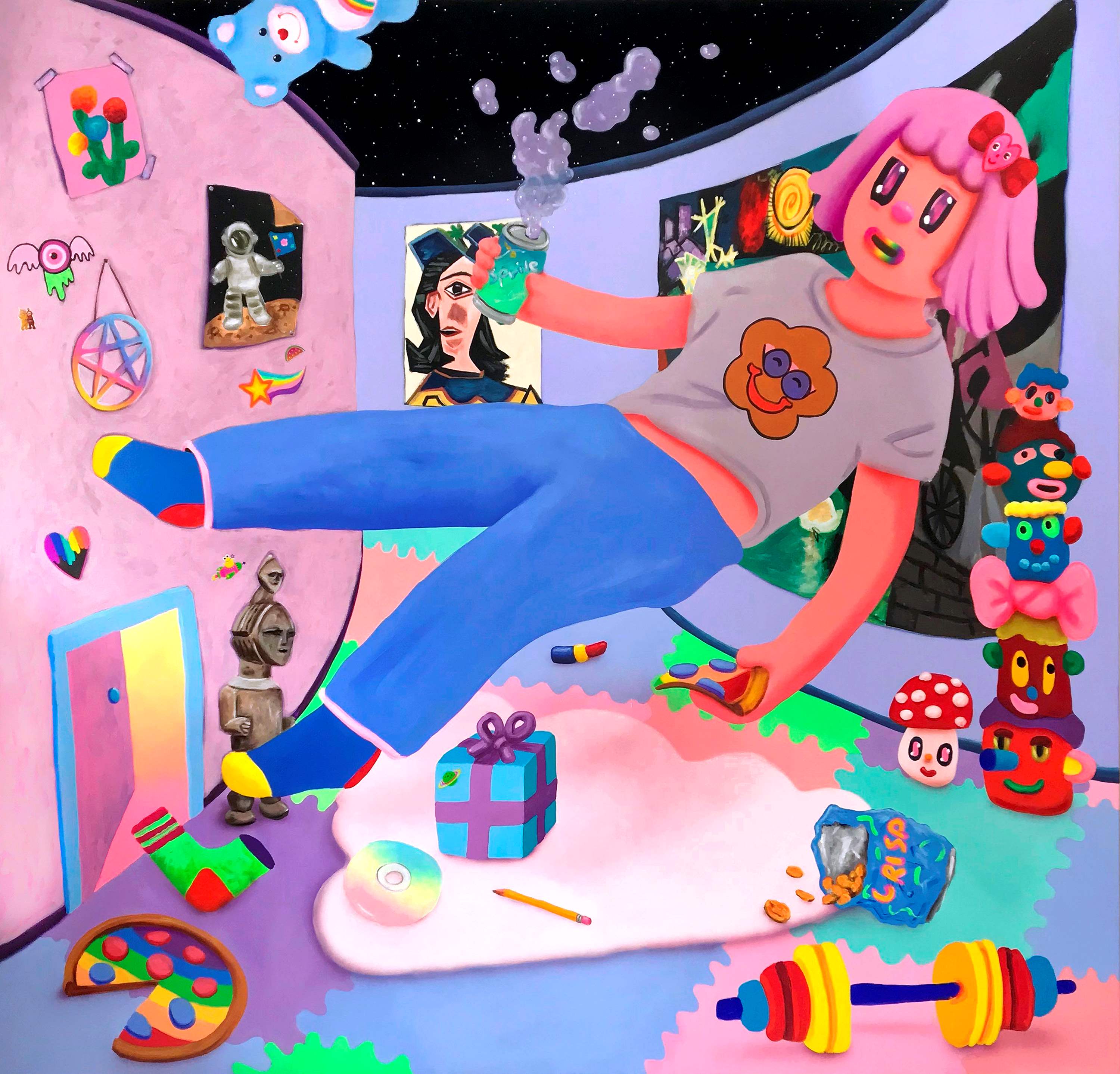 Super Future Kid's work is largely based on themes that strongly relate to certain ideas of childhood and youth; a time that still greatly influences her personality and artistic identity. She's deeply fascinated with the perception and perspective on the world from the view of an adolescent mind, particularly in ideas of the mysteries and strangeness associated with being grown up. Those ideas include character identity, curious behavior and spirituality, games and playfulness, and the freedom of the youthful spirit itself.