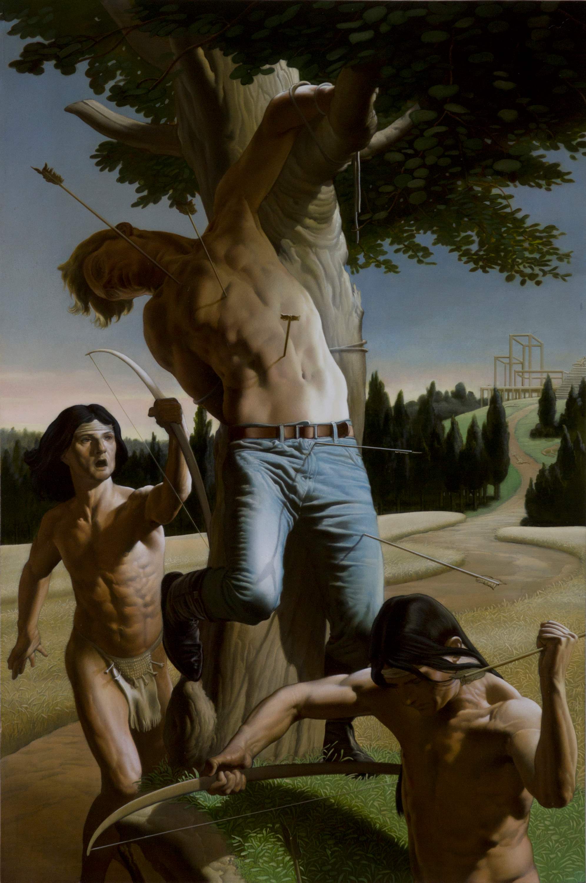 Nicola Verlato gives us a third image of what downfall can look like, in this context ”personal destruction”. His vinyl painting ”Hostia - Assassination No.2 - Marlowe” shows in its elegant grey shades the fabled murder of Christopher Marlowe (1564-1593), an English playwright, poet and interpreter of the Elizabethan era. The classically composed scene is both intense and disturbing with flexing muscles, lethal gazes and spouting blood. This work is part of the comprehensive and yet to be completed museum concept ”Hostia”, which tells us the story of the Italian philosopher and filmmaker Pier Paolo Pasolini (1922-1975). Pasolini was often compared to the aforementioned Marlowe as they both suffered the same cold-blooded and mythical fate.