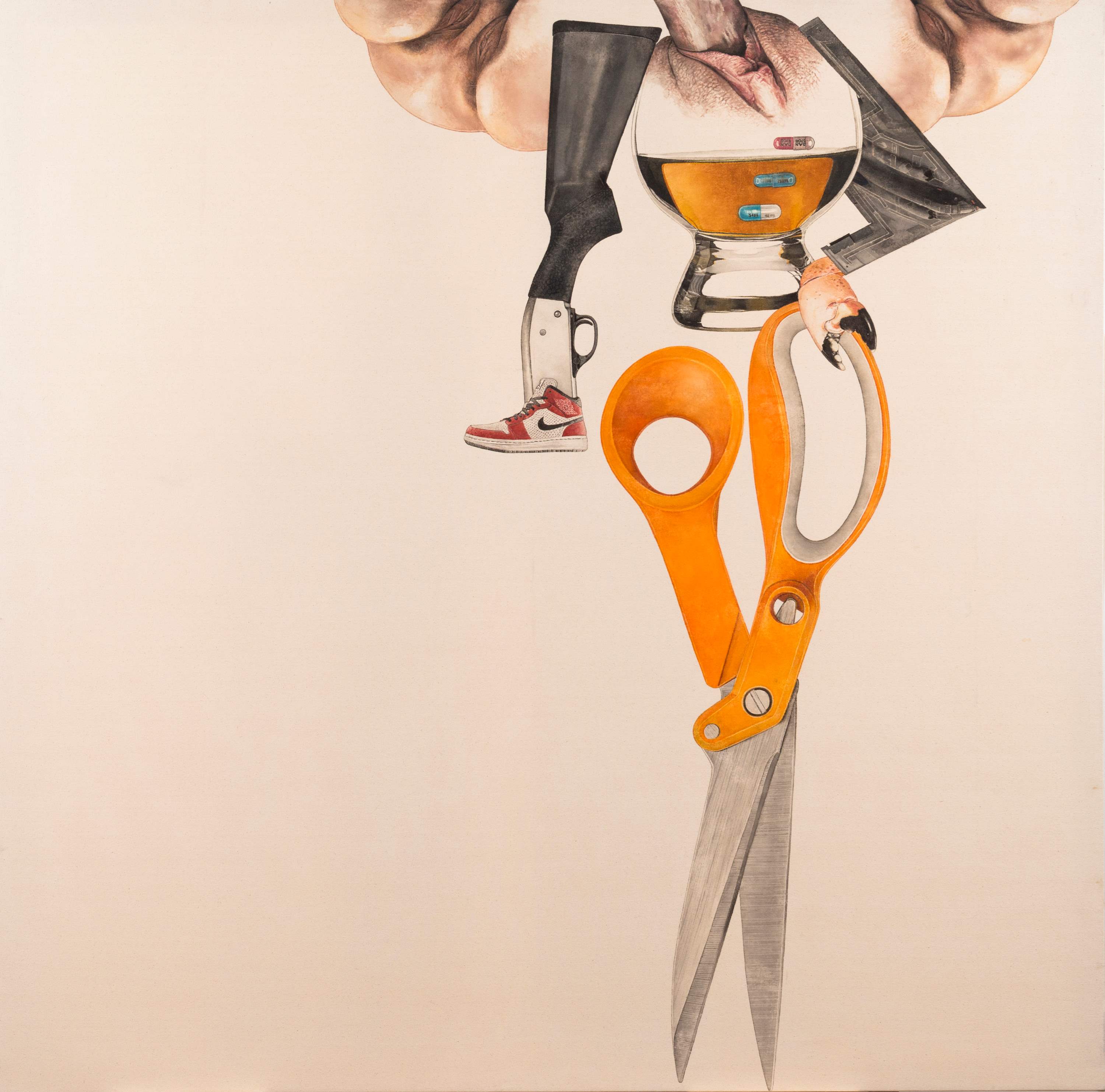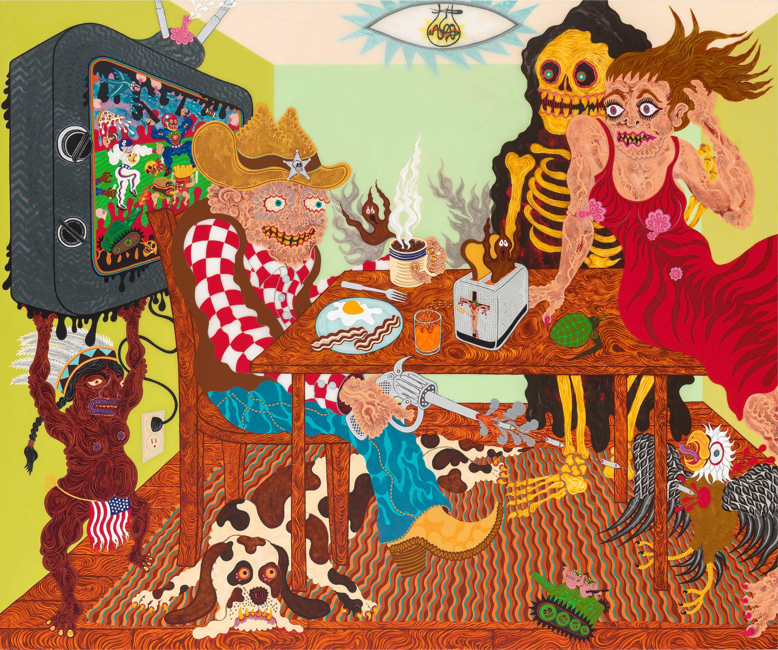 In Aaron Johnson’s unique acrylic painting ”Cowboy Coffee” we get an eloquent and grotesque image of what everyday downfall looks like. While the characteristic patriarchal and classic American cowboy is reigning by the end of the table, death pays a visit and evokes the already strained tension in the living room.