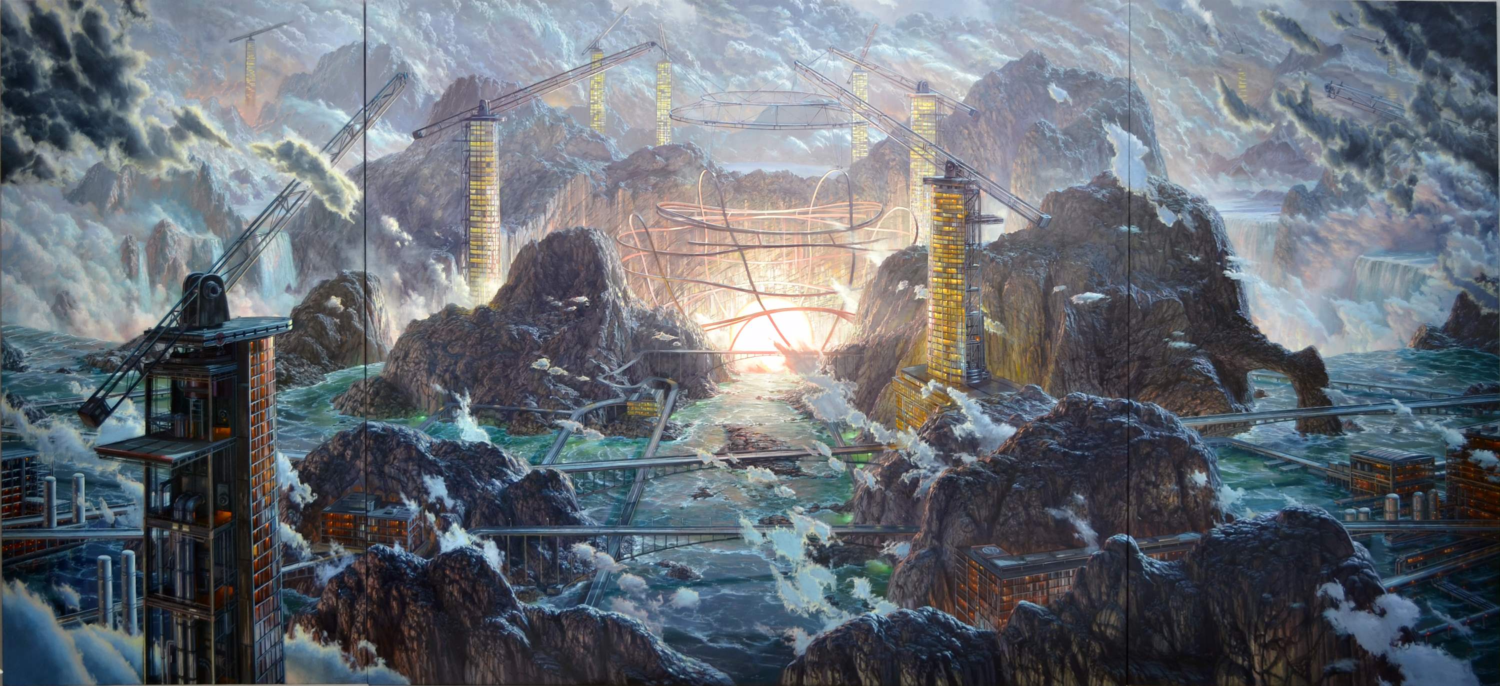 Although we are certainly ”the good guys”, just like the Telemark Heroes, we are not prevented from showing you terrifying, dramatic and breath-taking apocalyptic scenes, which ”Tale of a Black City”, the impressive work of Jean-Pierre Roy, gives us a striking example of. In this 13 feet long oil painting the apocalypse is just about to unfold in a mix of violent forces of nature, glowing geometry and trembling industrial architecture.