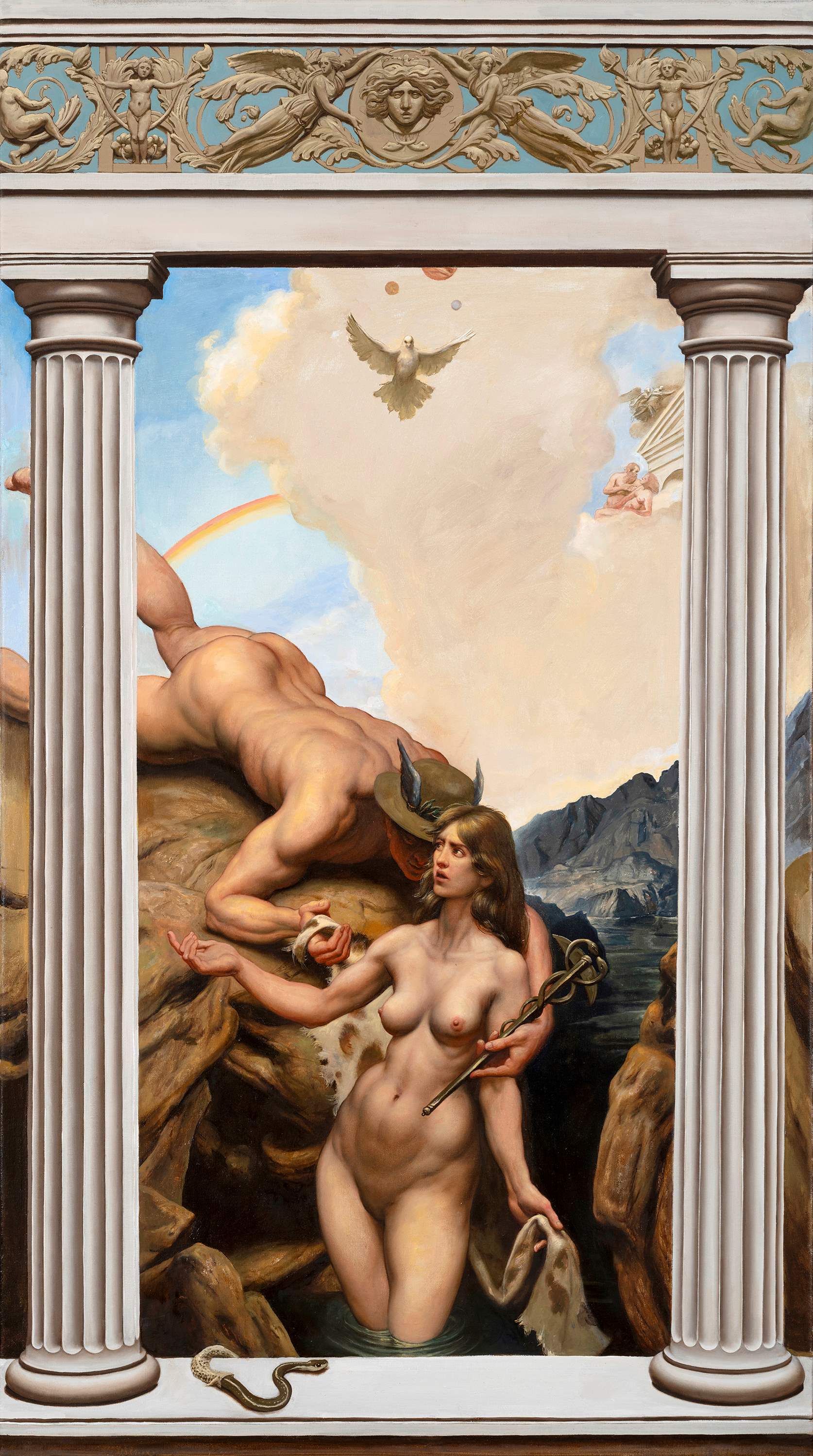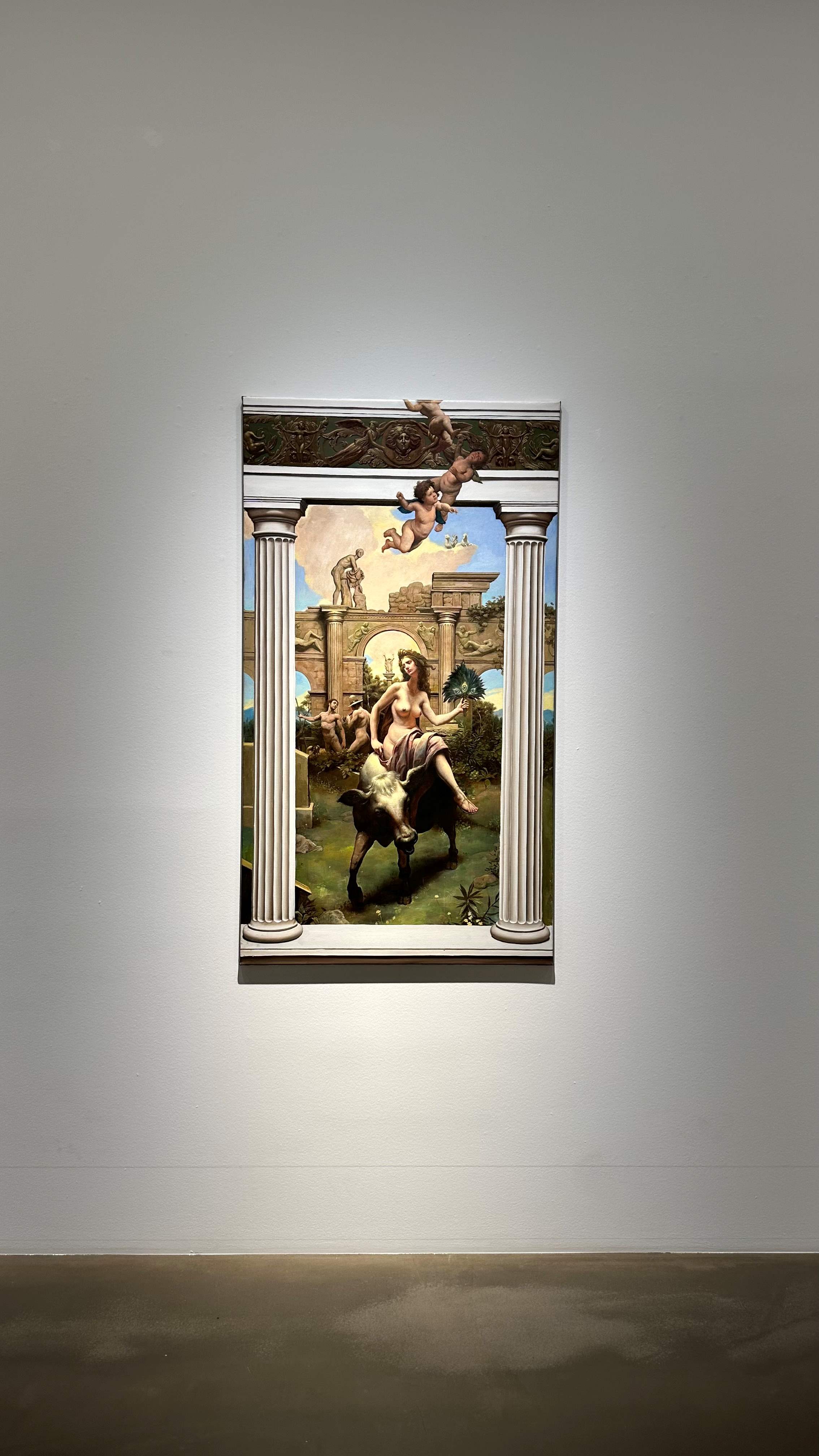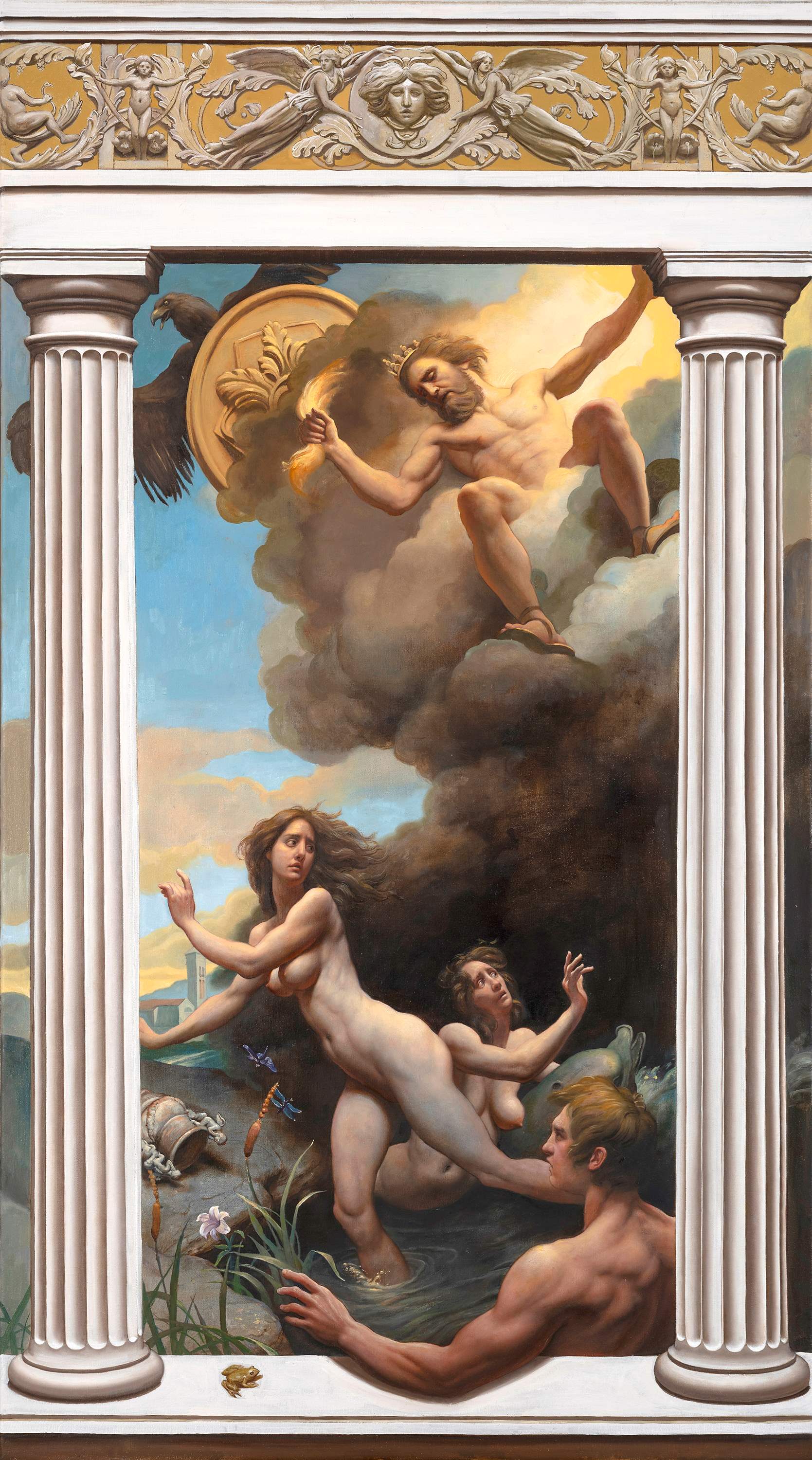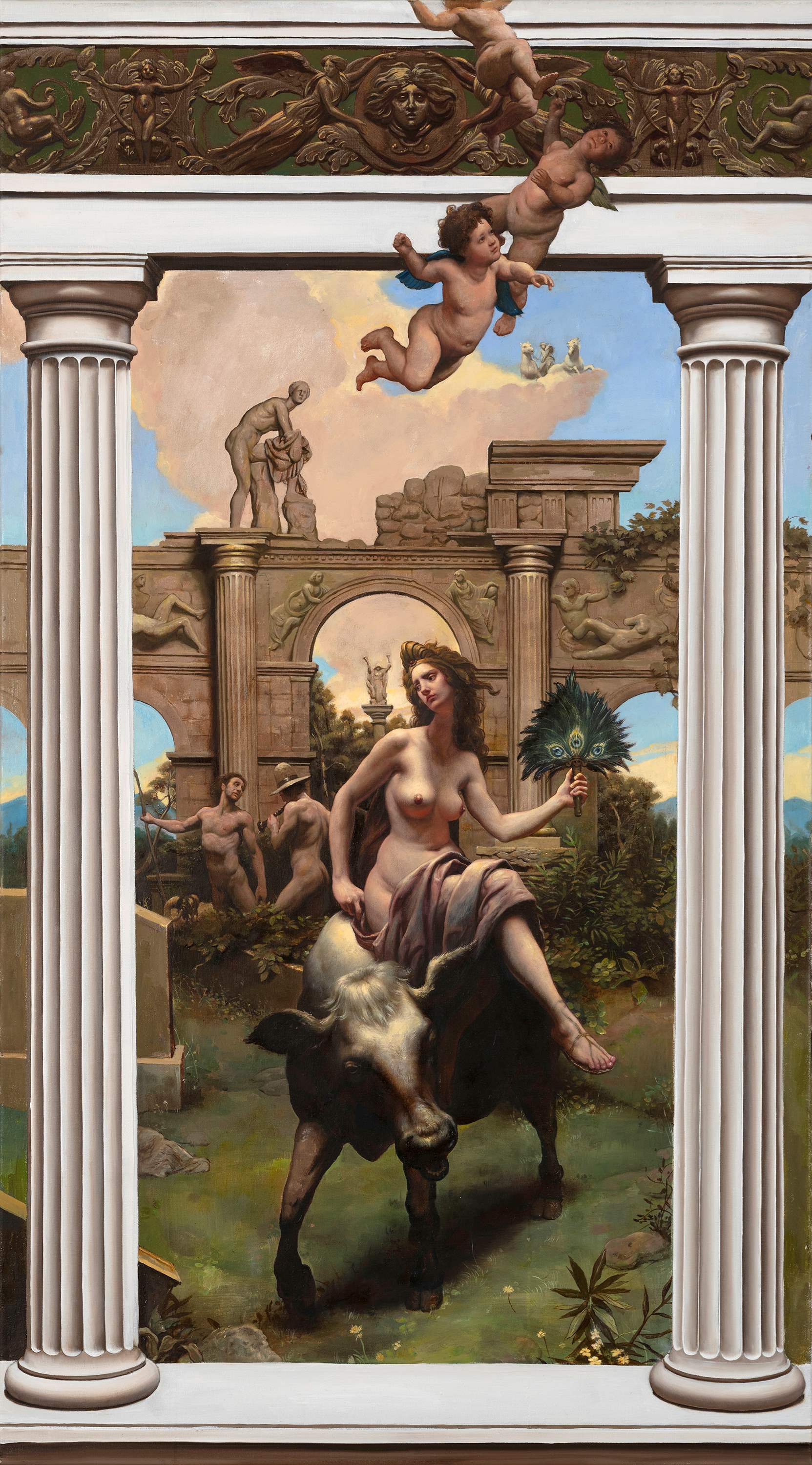 Adam Miller’s new solo exhibition is inspired by the poem Metamorphoses, written by the Roman poet Ovid, which is a compendium of stories of the gods and heroes of ancient Greece. It is playful and erotic and has inspired multiple great masterpieces of Western art. The Metamorphoses has been Miller's subject for the last four years, where he has been exploring the illusionistic mixture of architectural forms, sculpture, and realistic narrative scenes reminiscent of Italy's Renaissance palazzos and cathedrals.