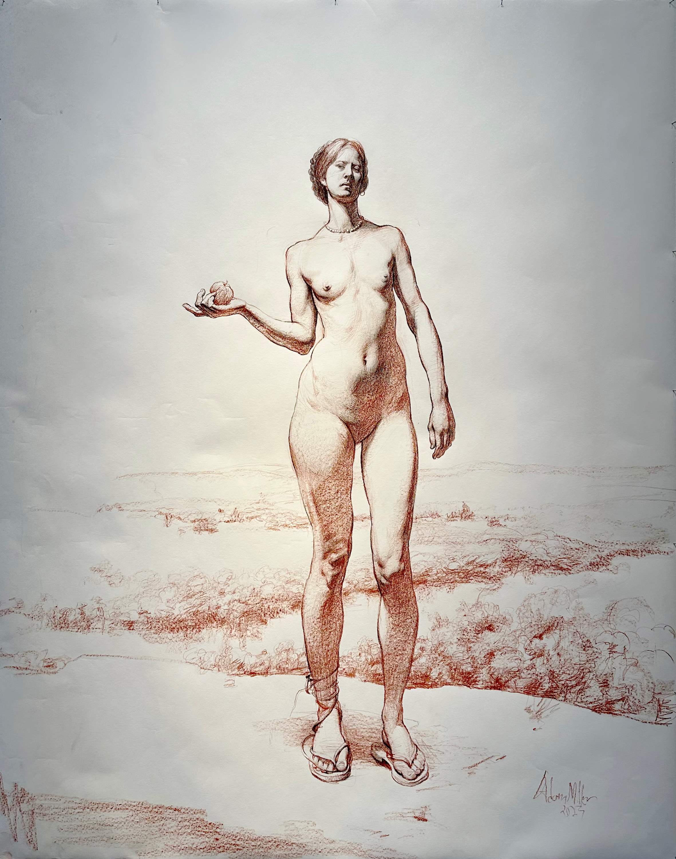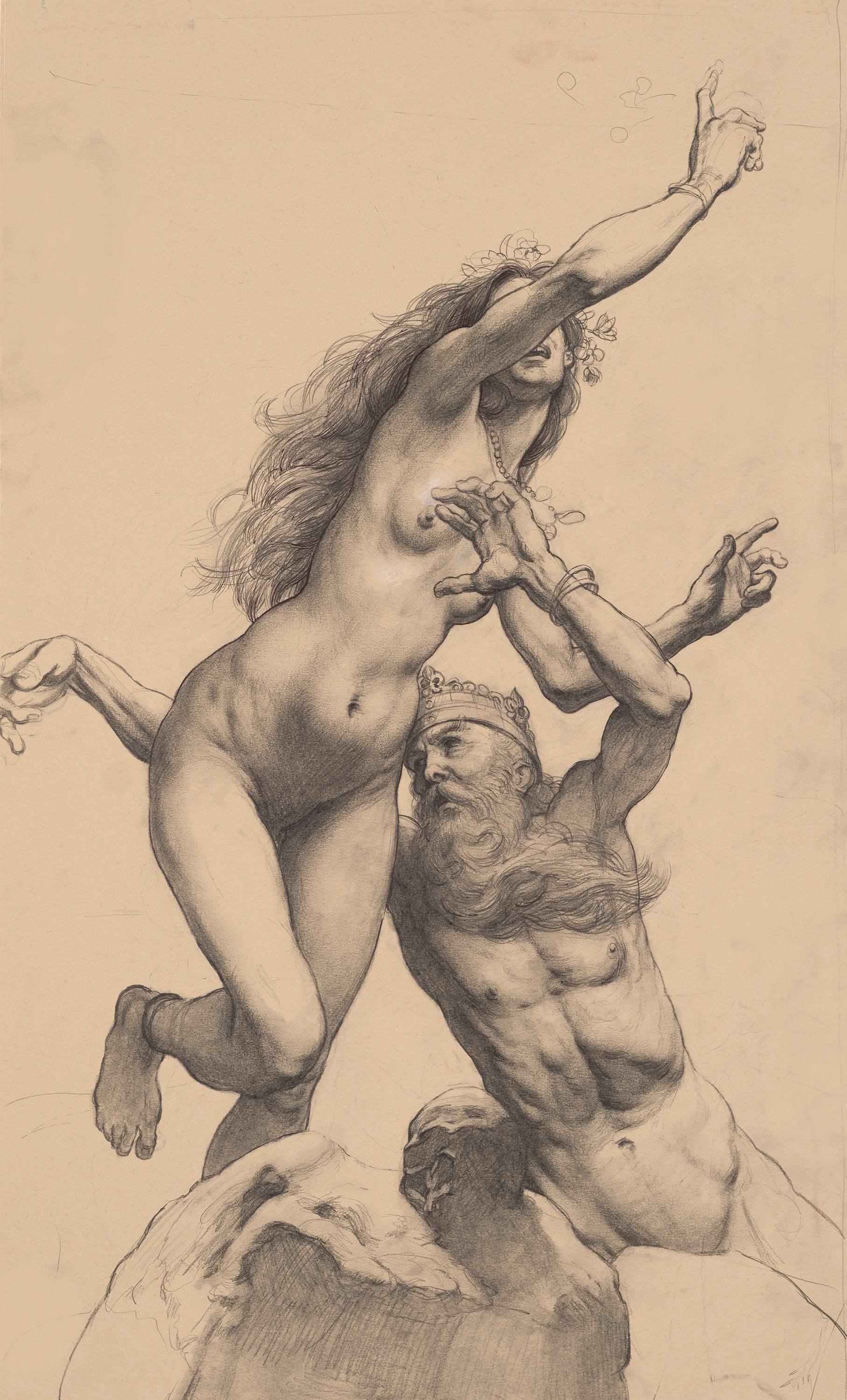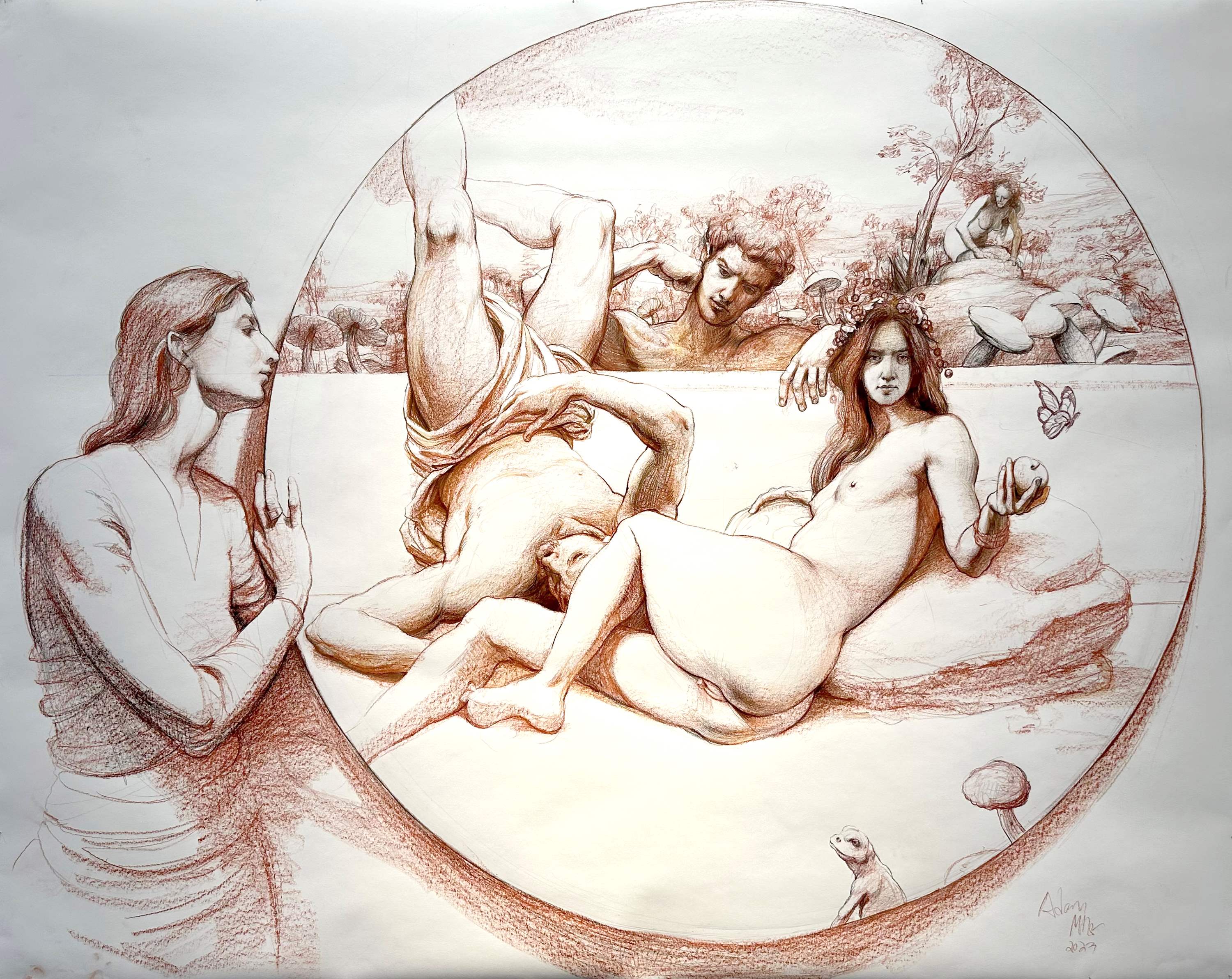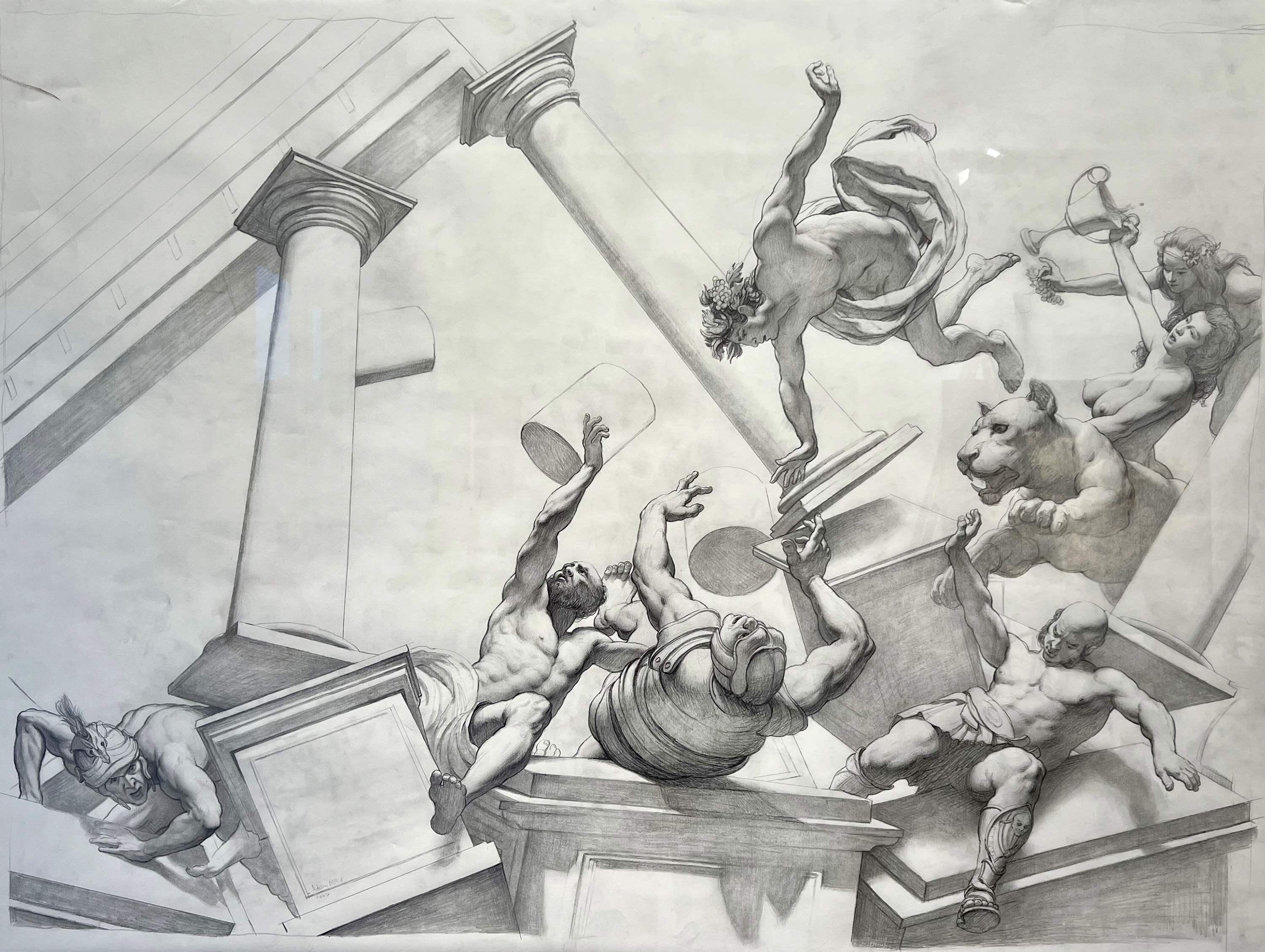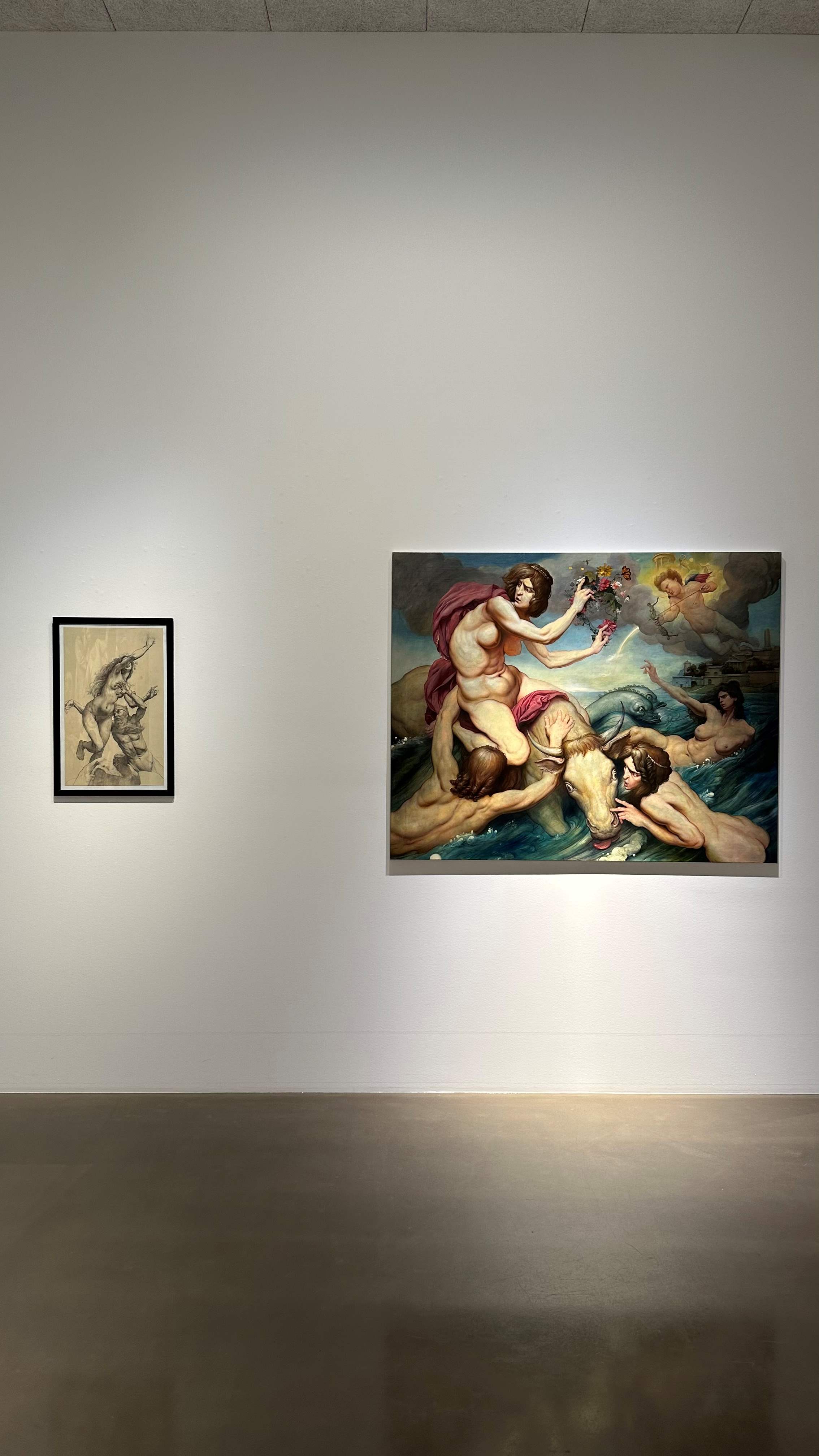 In addition to the paintings, the show includes a series of drawings, one of which is Persephone and Pluto. The scene depicts Persephone, who was the daughter of the goddess Demeter, gathering flowers in a meadow one morning when Pluto, the lord of the underworld, saw her and was immediately smitten. He rose from the underworld and carried her down to Hades to be his queen in the realm of the dead. Her mother searched for her and caused all the plants and flowers to wither and die until Pluto was forced to compromise and release Persephone for half of the year. This is why half of the year vegetation thrives and for the other half it is dead. The drawing shows the moment Pluto leaps from the underworld to take her with him. In addition to being a stand-alone work, the drawing also serves as a study for a larger painting that will be shown at Art Miami in December 2023.
