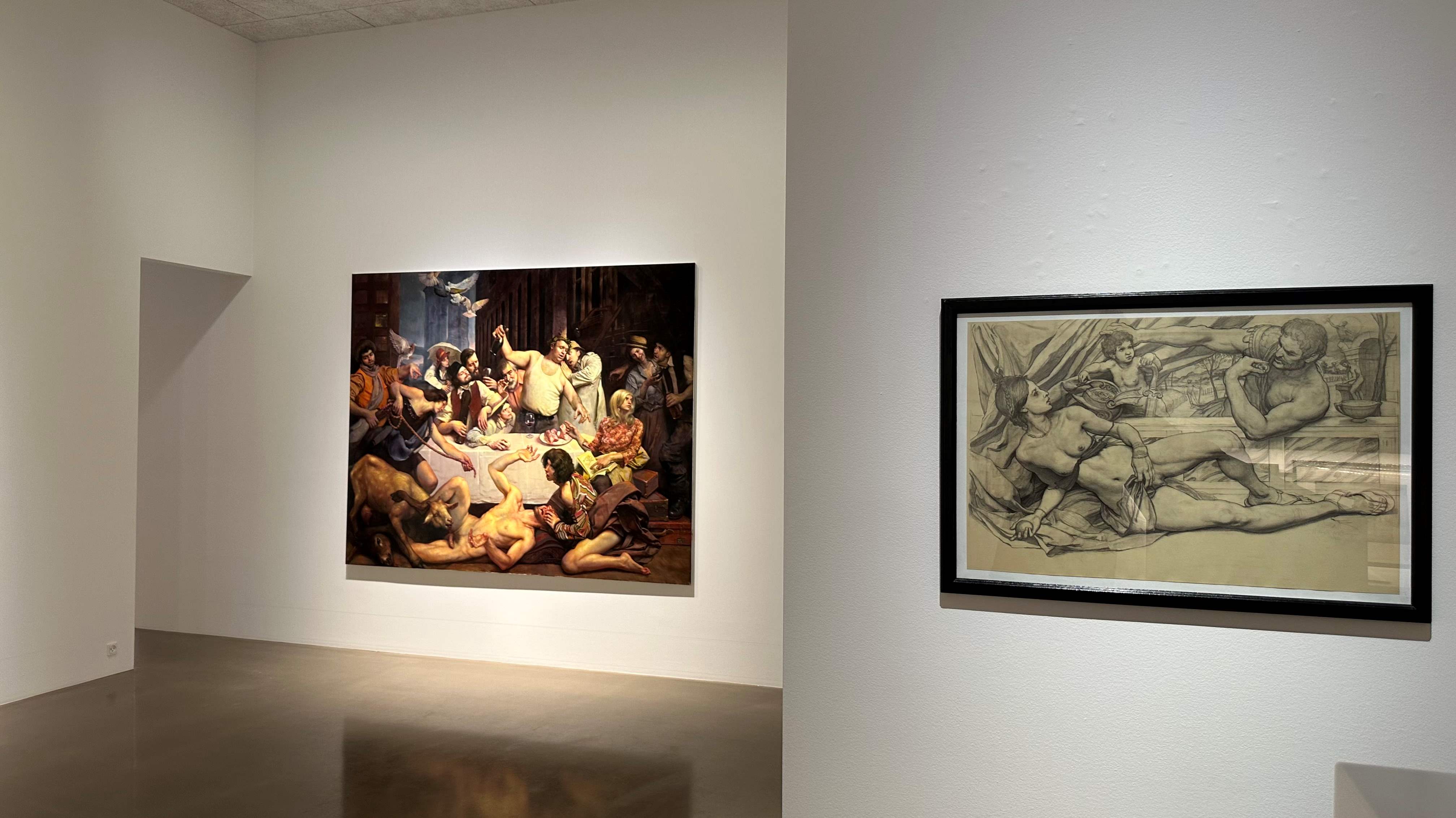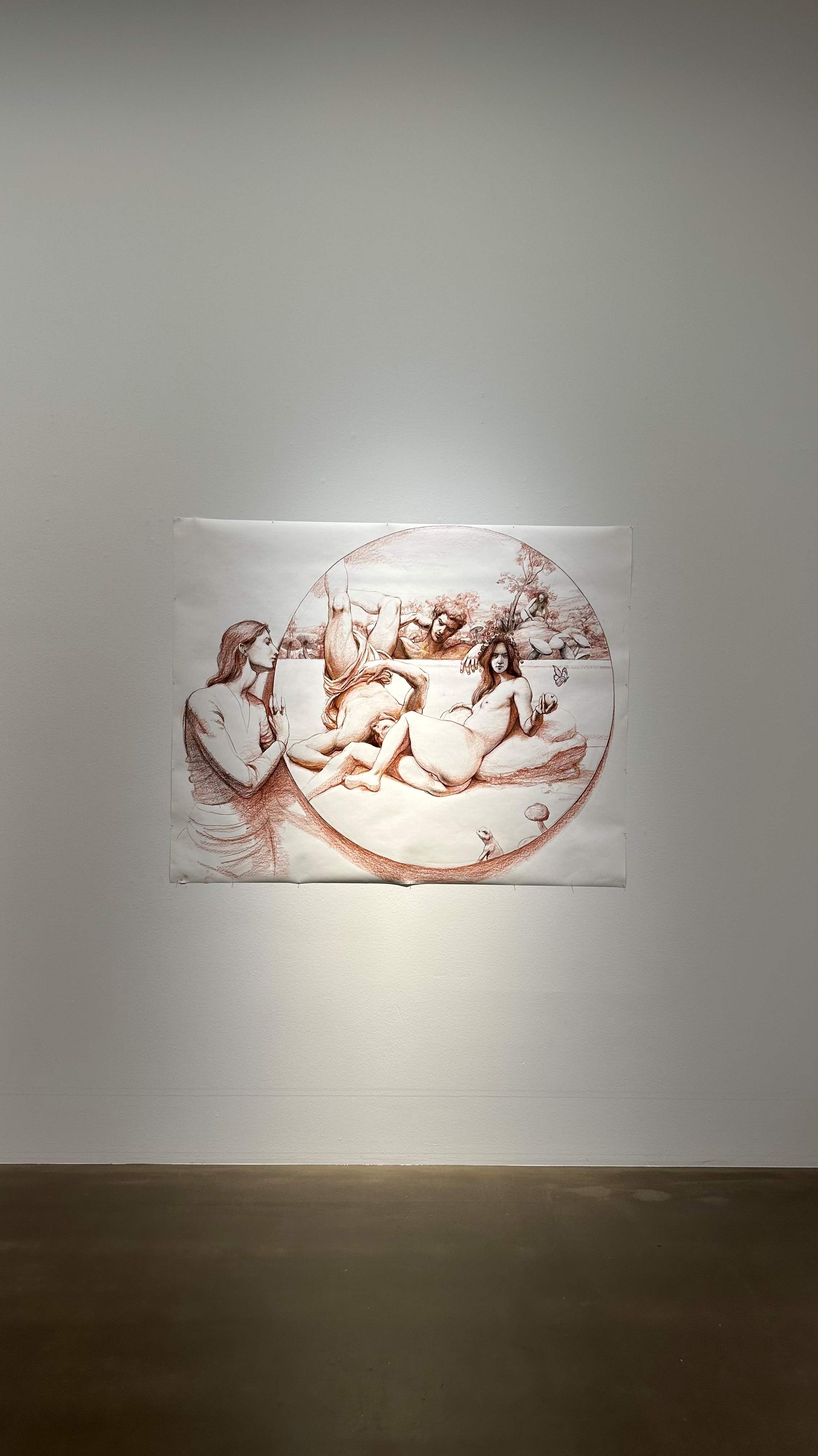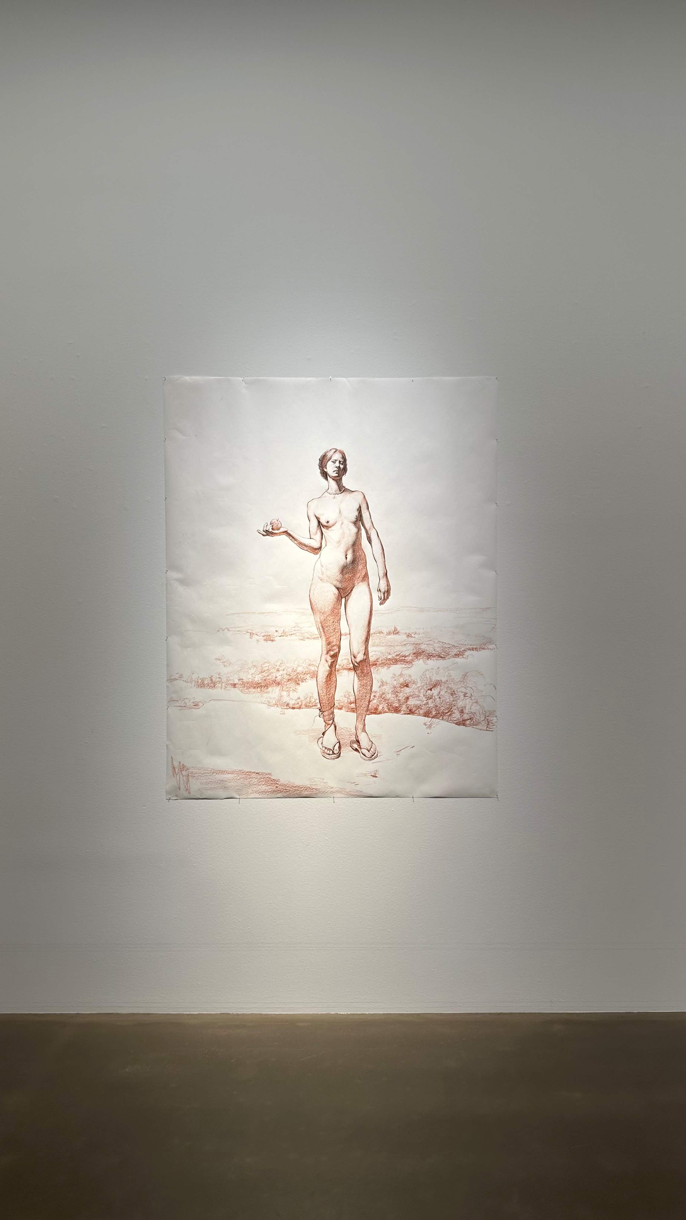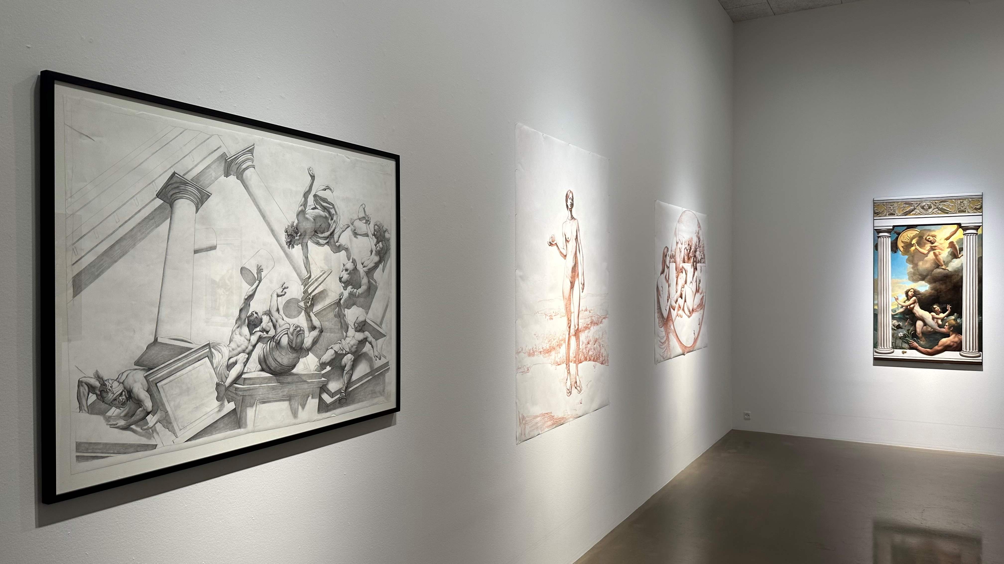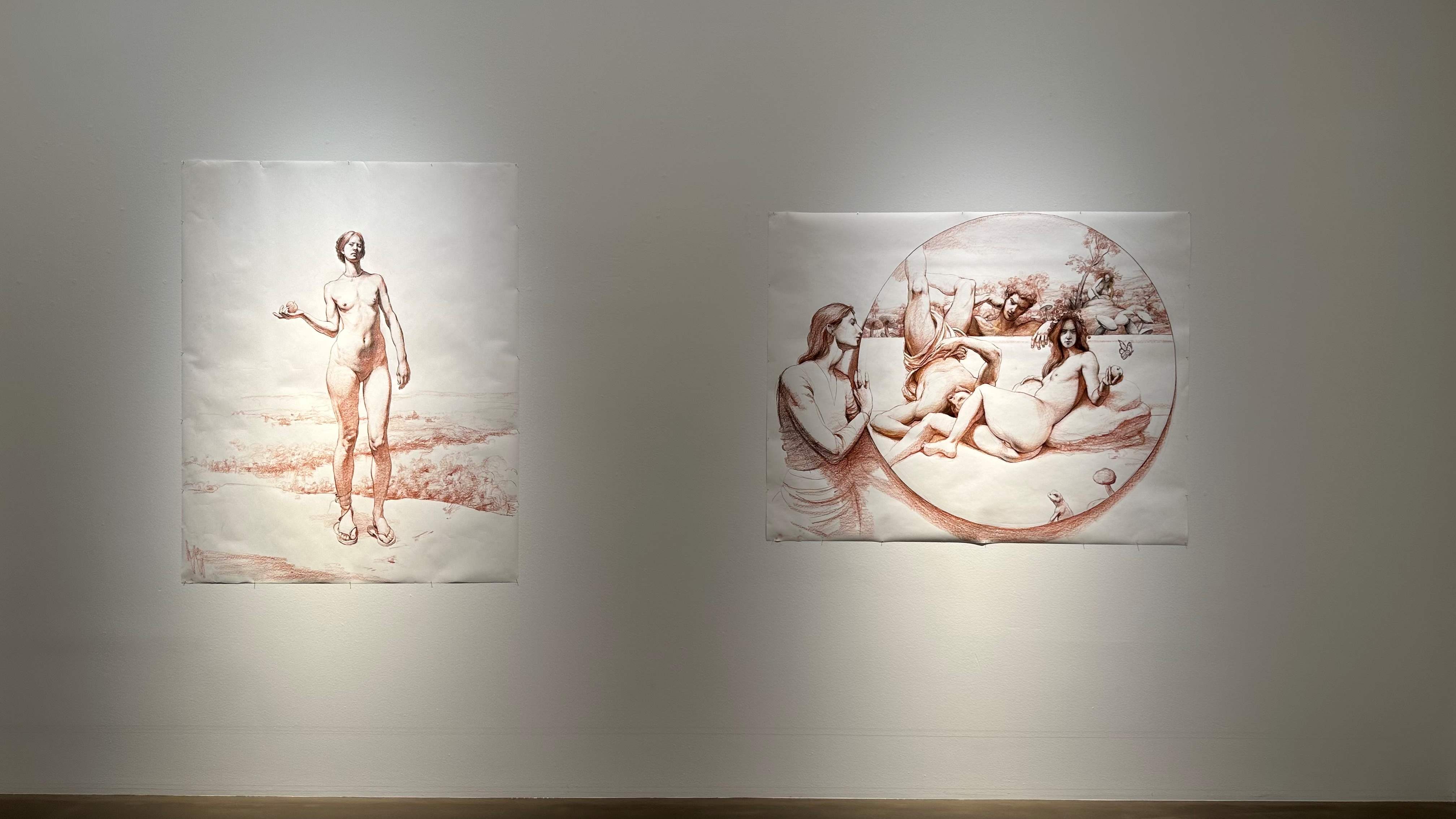 The exhibition presents six oil paintings, three framed drawings, and two large-scale, onsite drawings.