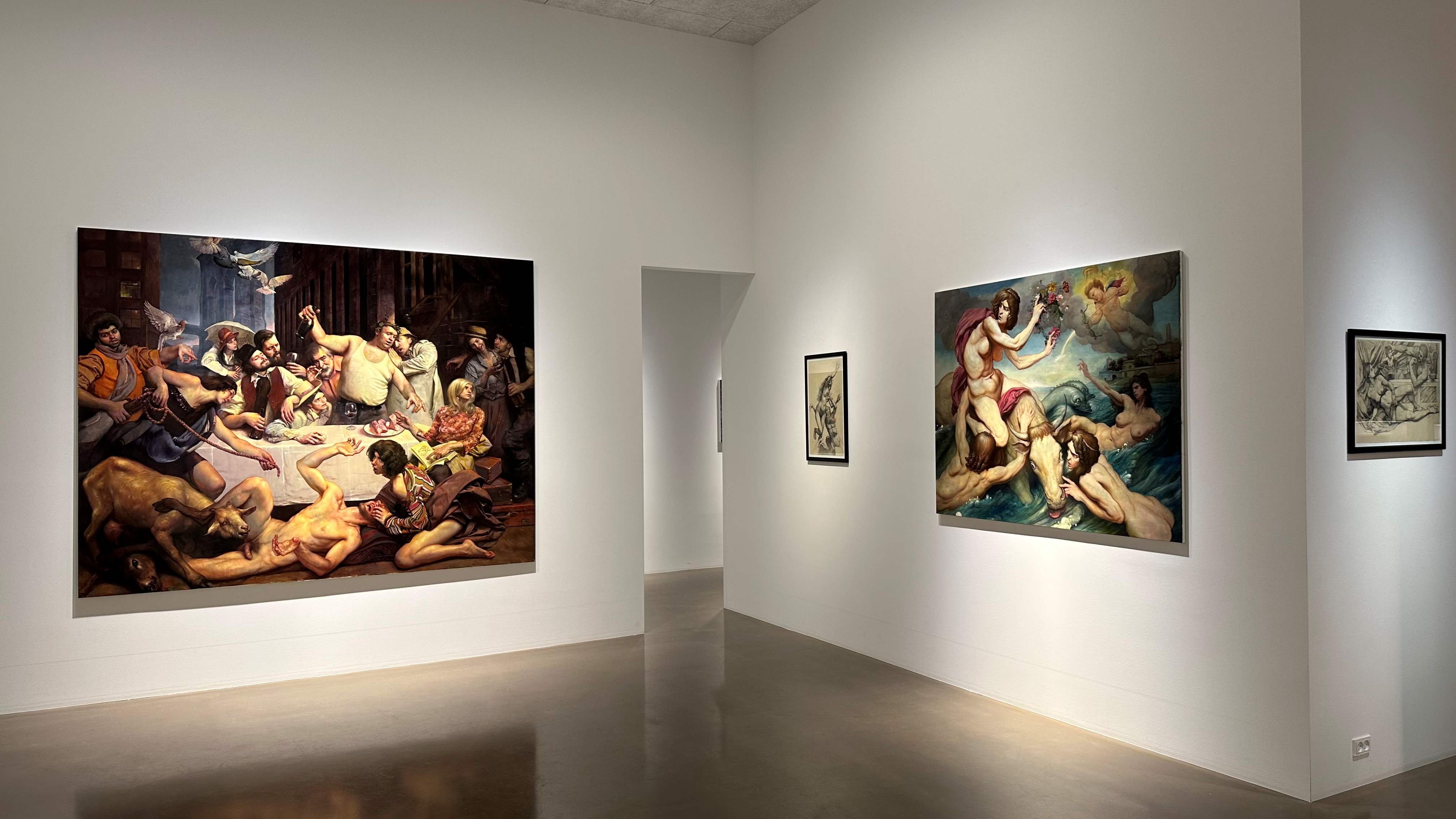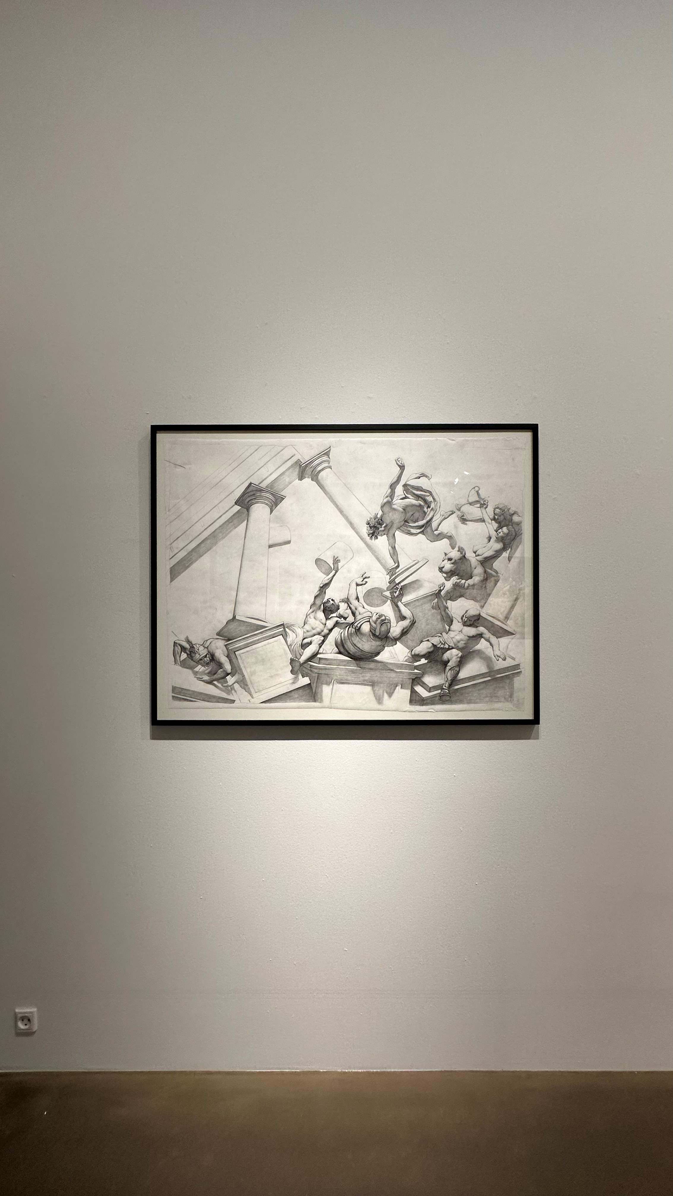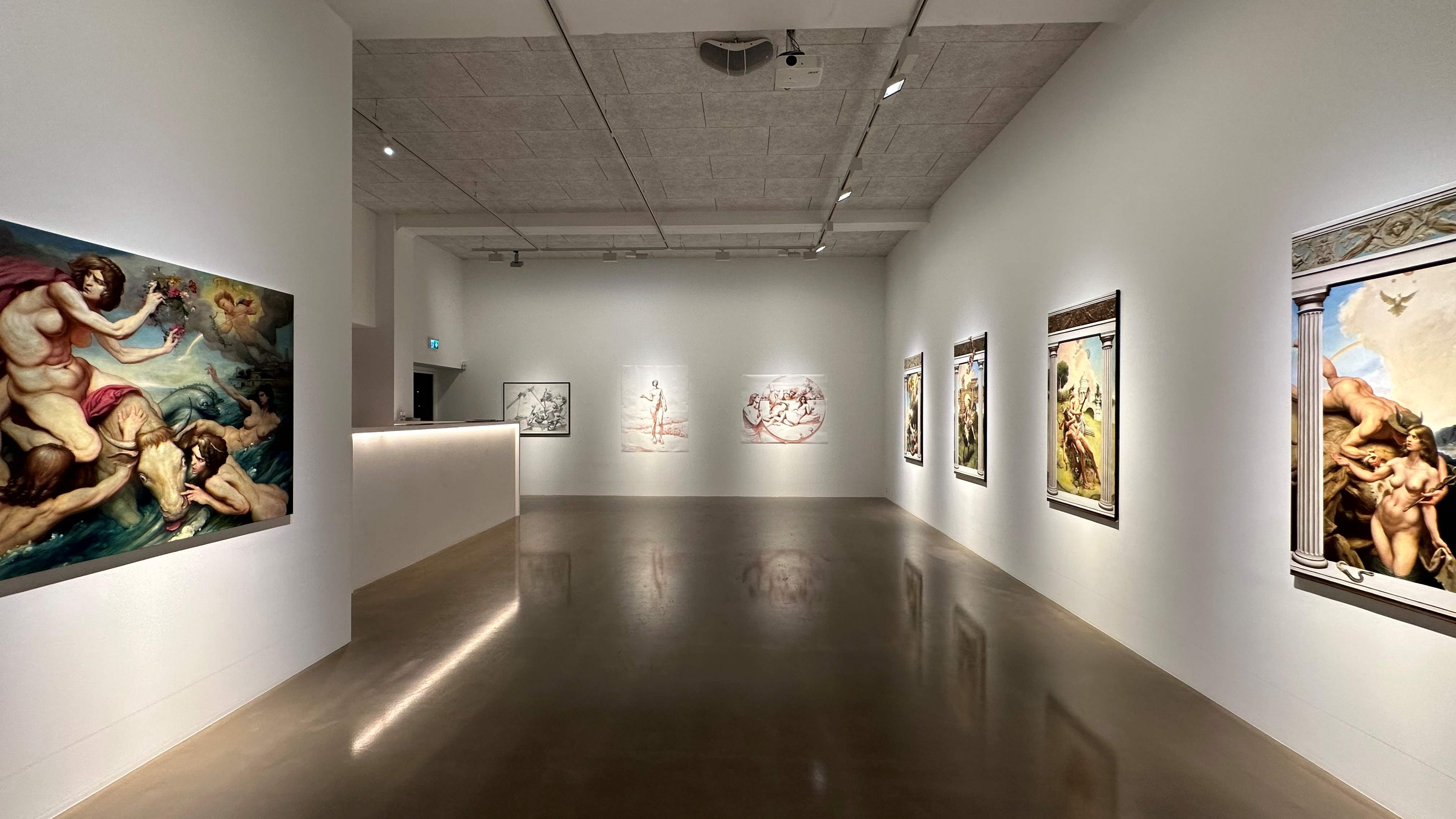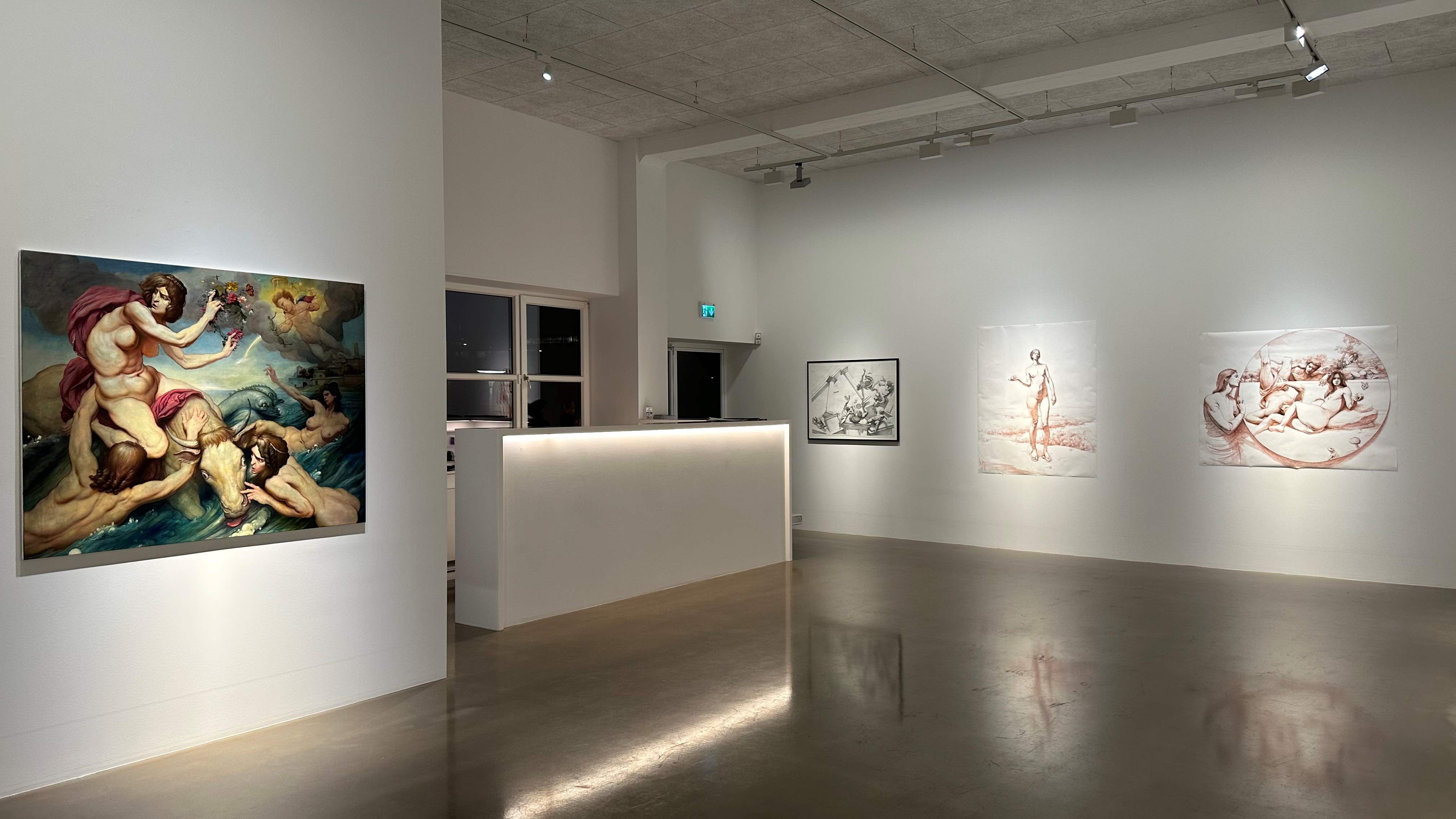 With his new series of works, Adam Miller conveys ancient myths that, in their great influence and universality, have become part of the human spirit and our collective history. A series of paintings within the collection of new works, whose motifs are framed by doric columns painted on the canvases, portray the myth of Jupiter (Zeus) and the priestess Io. The other works in the exhibition express different myths of the gods, including Pluto’s abduction of Persephone and the story of Mars and Venus. The works are accompanied by two large-scale, onsite, and improvised drawings made specifically for this exhibition.