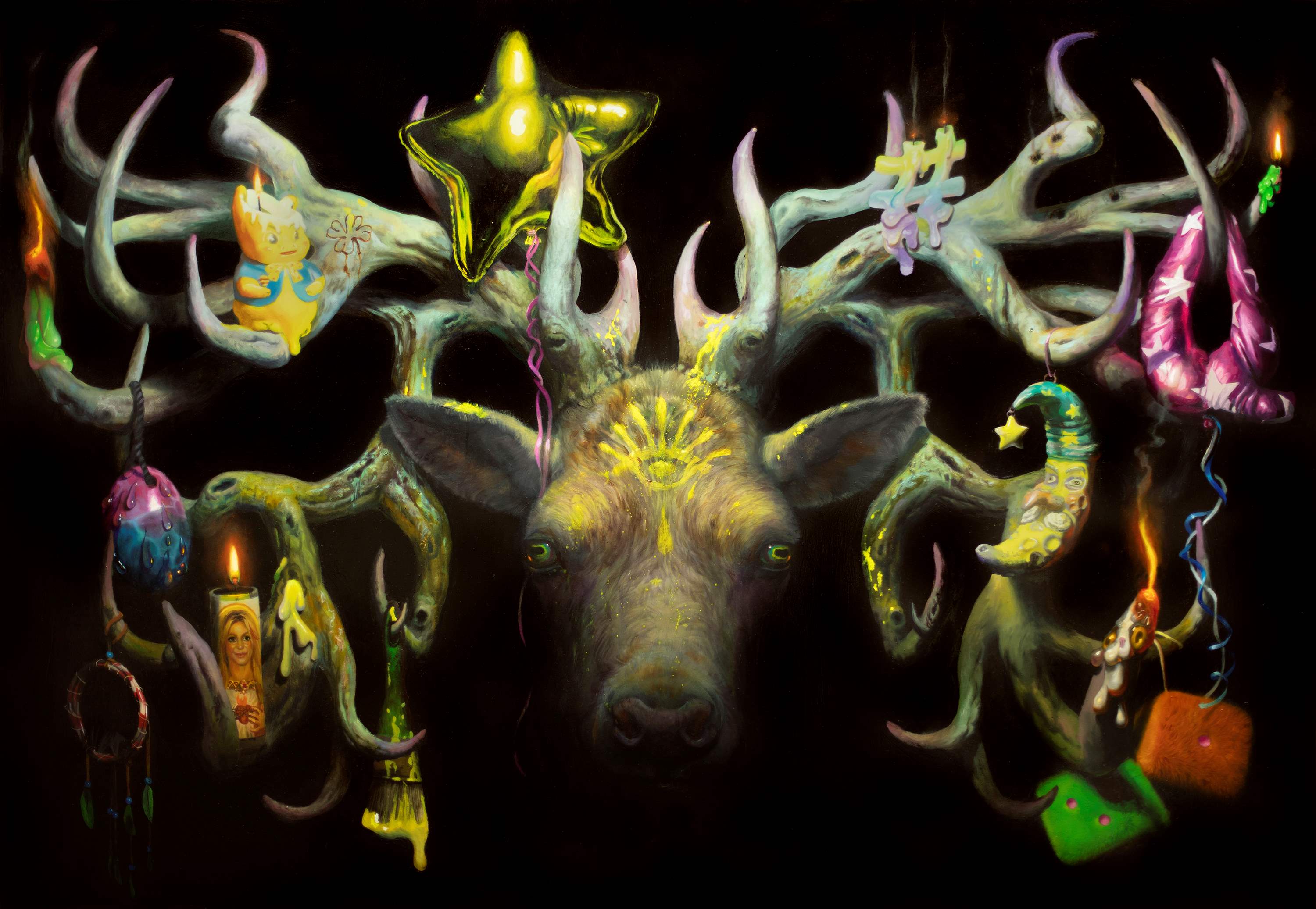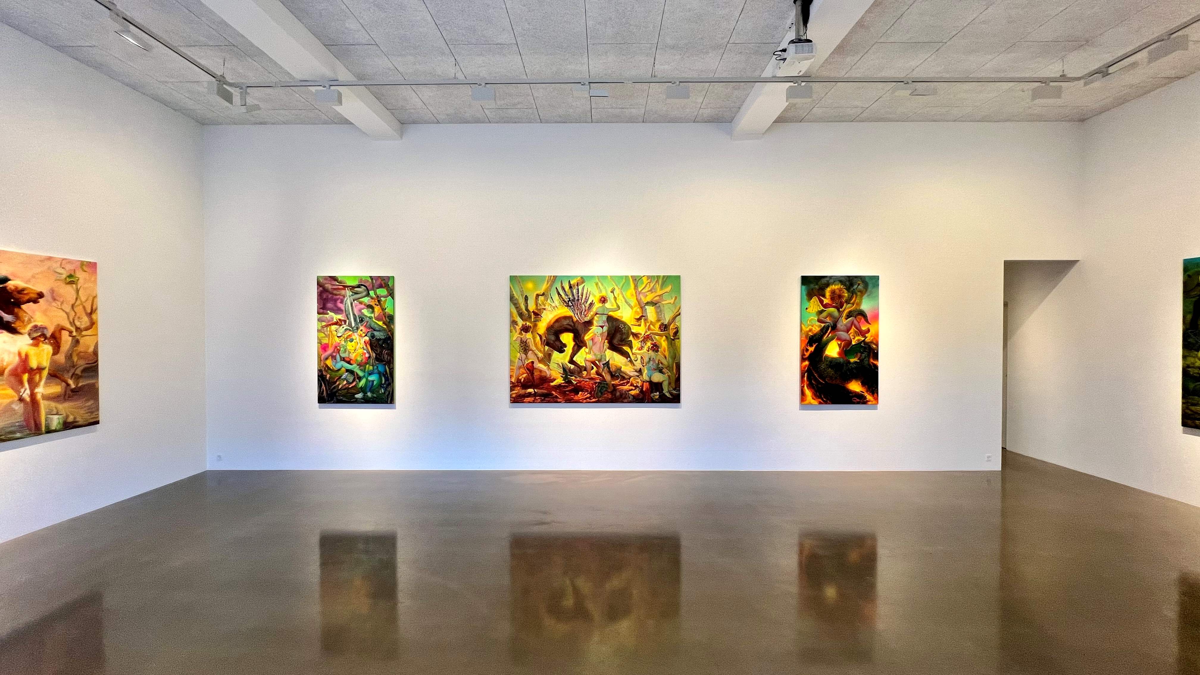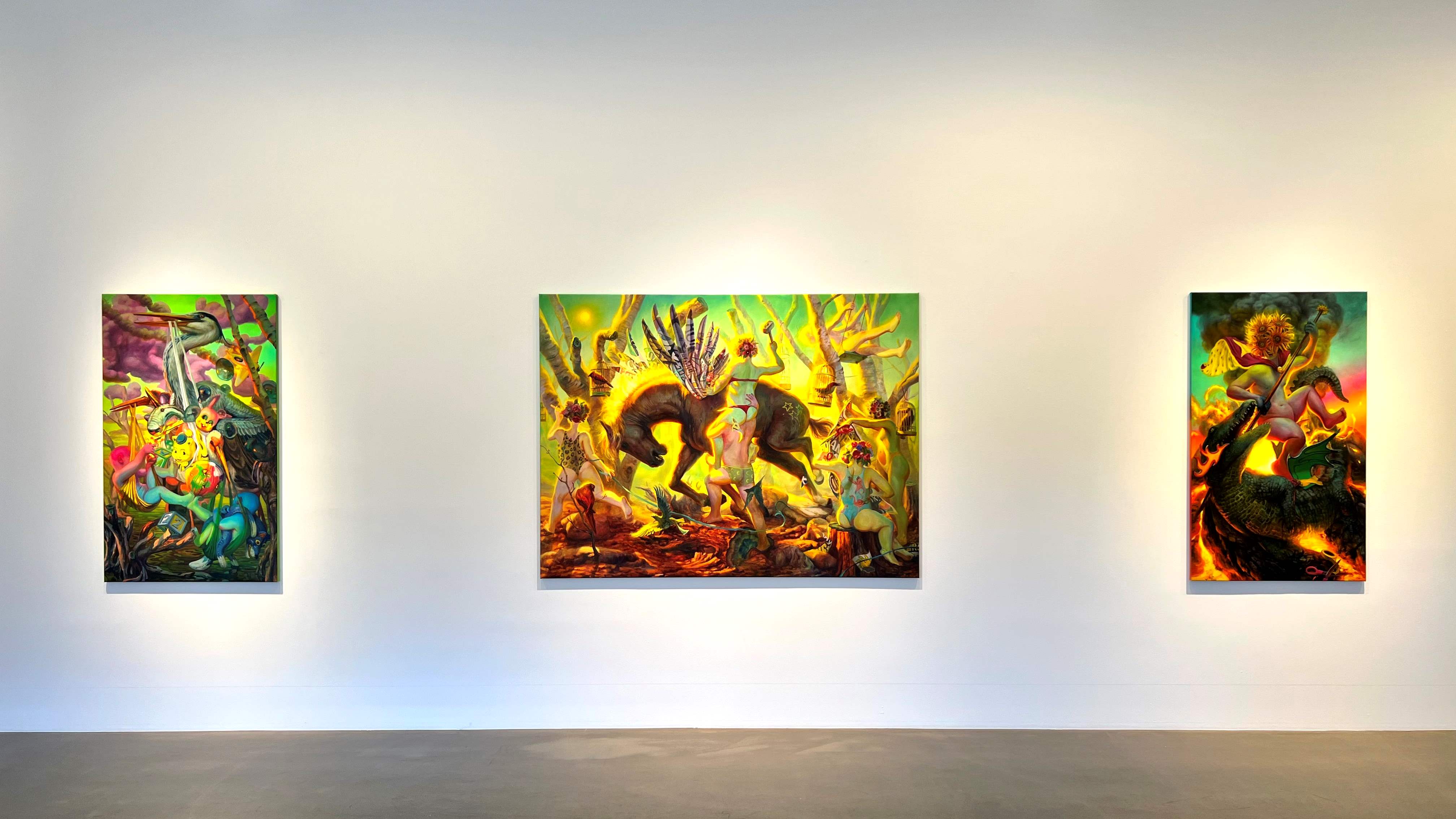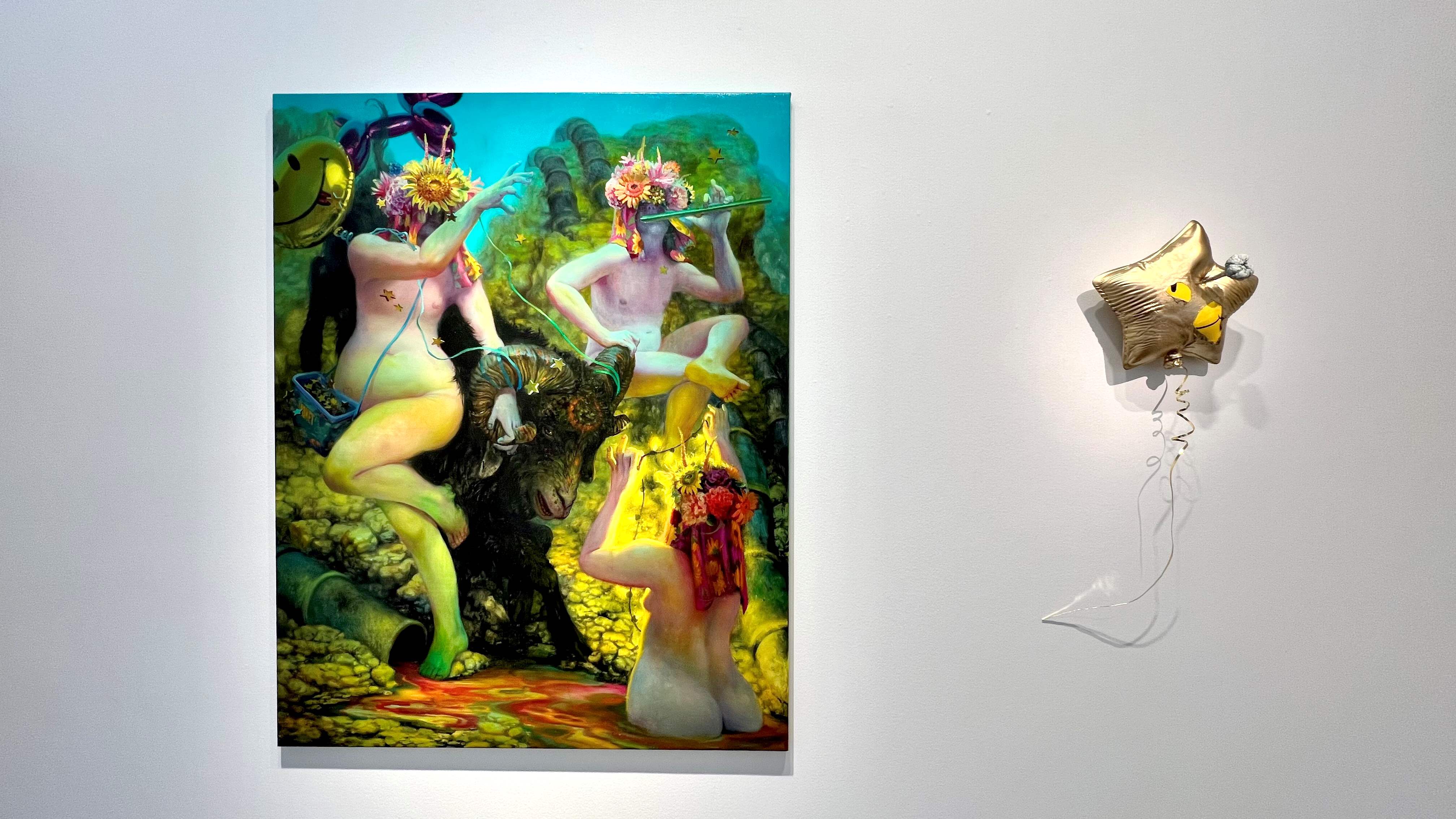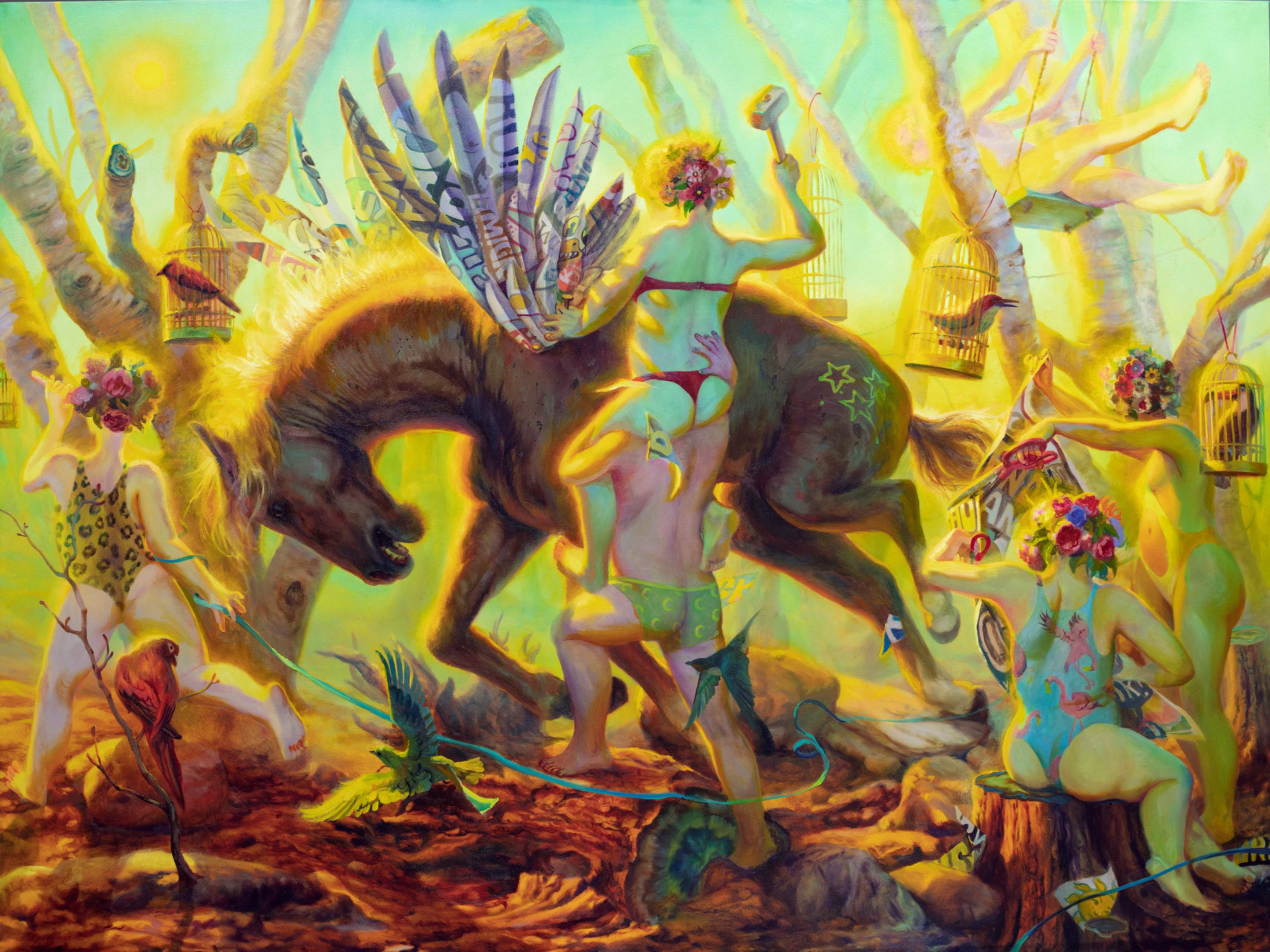 Artifice, pretense, and objectification are all frontal themes explored thoroughly in Martin Wittfooth’s new solo exhibition. Within each new work, the viewer is witness to an act of artificial transformation through adornments of paint, ornamentation, and alteration. Figures frolic across the scenes and leave their influence on their surroundings and its inhabitants, partaking in a forced, theatrical transformation, caught up in voyeuristic performance and the revelry of abandonment and make-believe. The transformation present in the paintings is not un-like the staging of the self that takes place on social media, where objects and places are carefully curated to fit into a specific narrative.