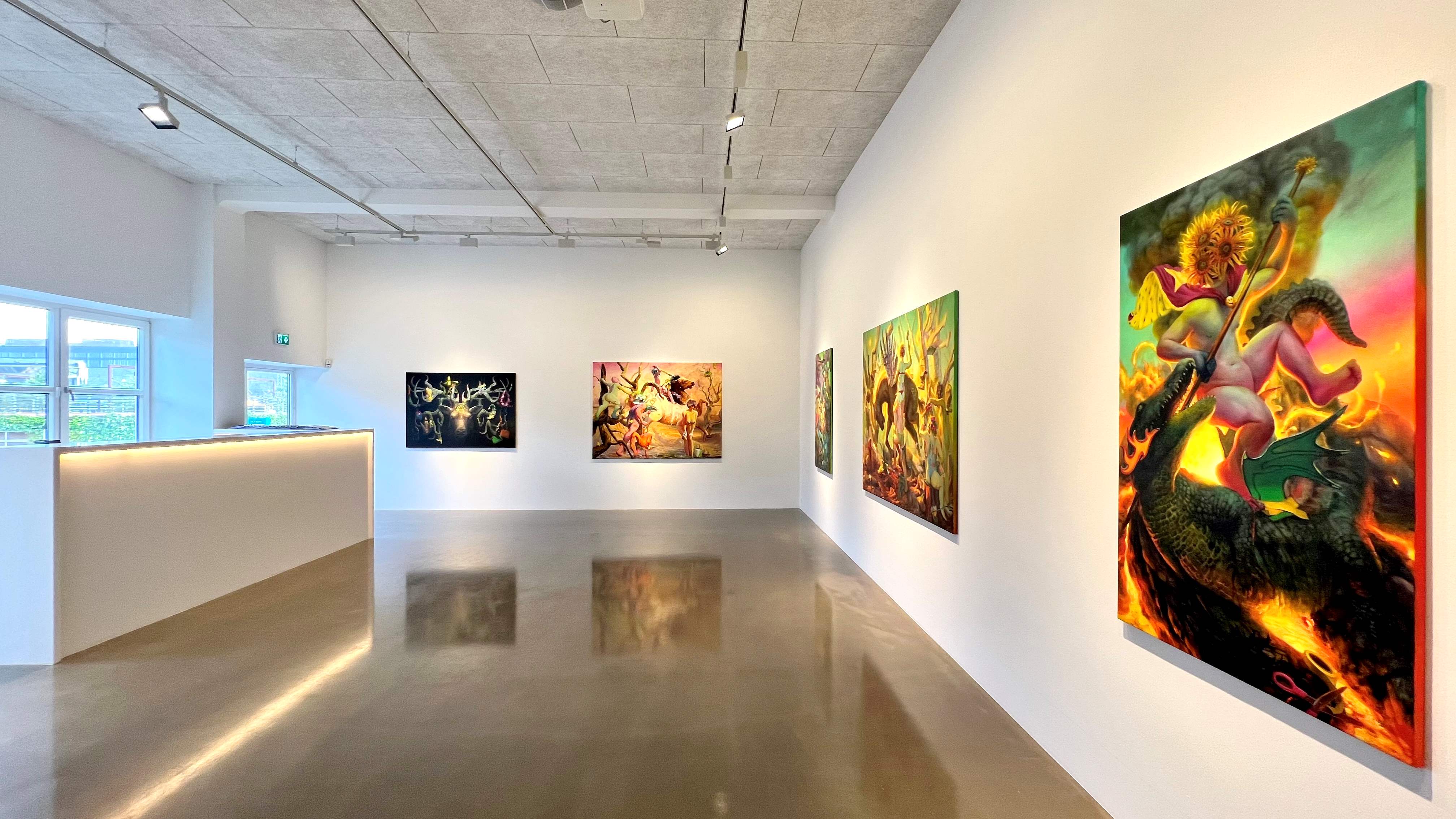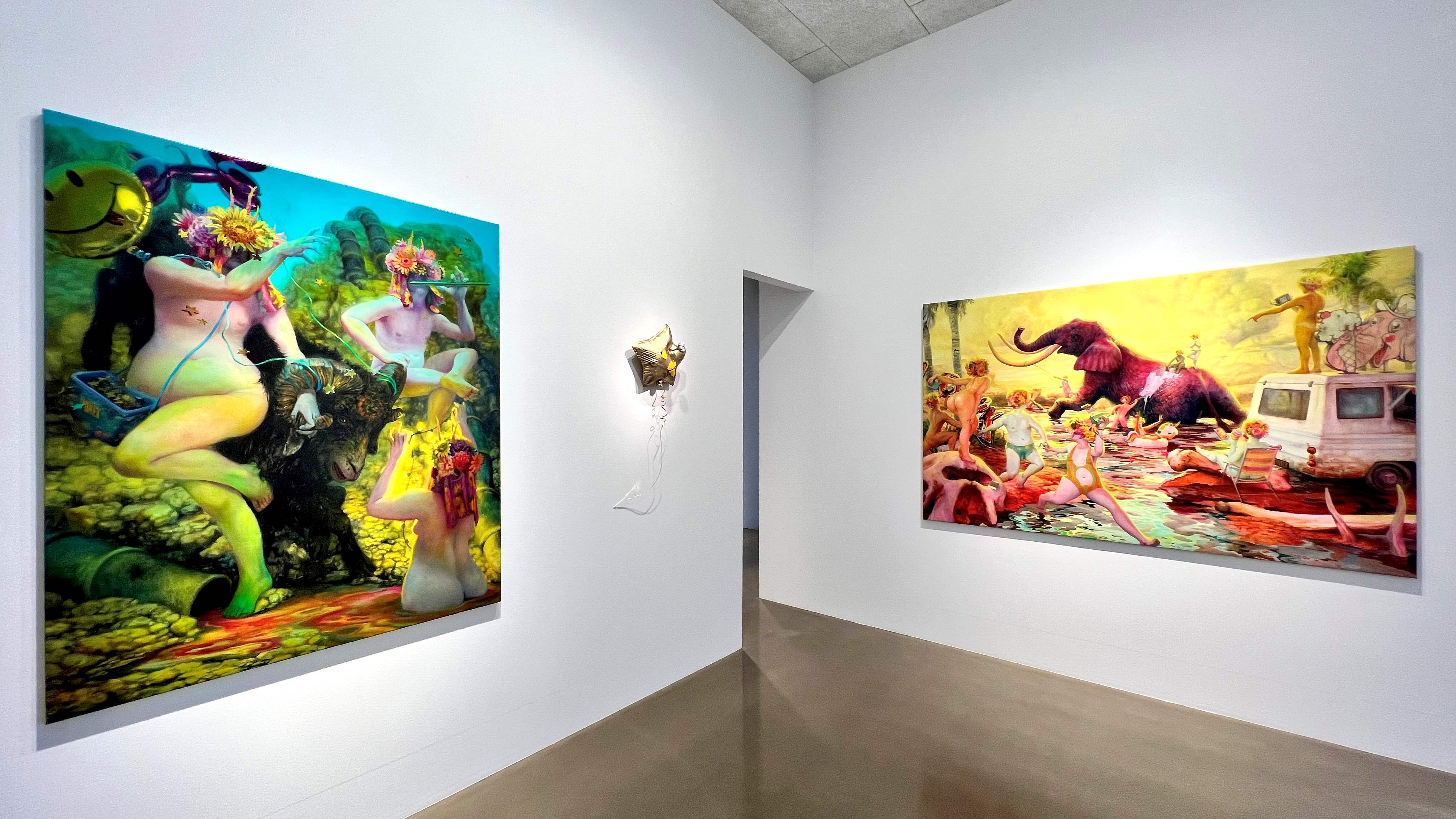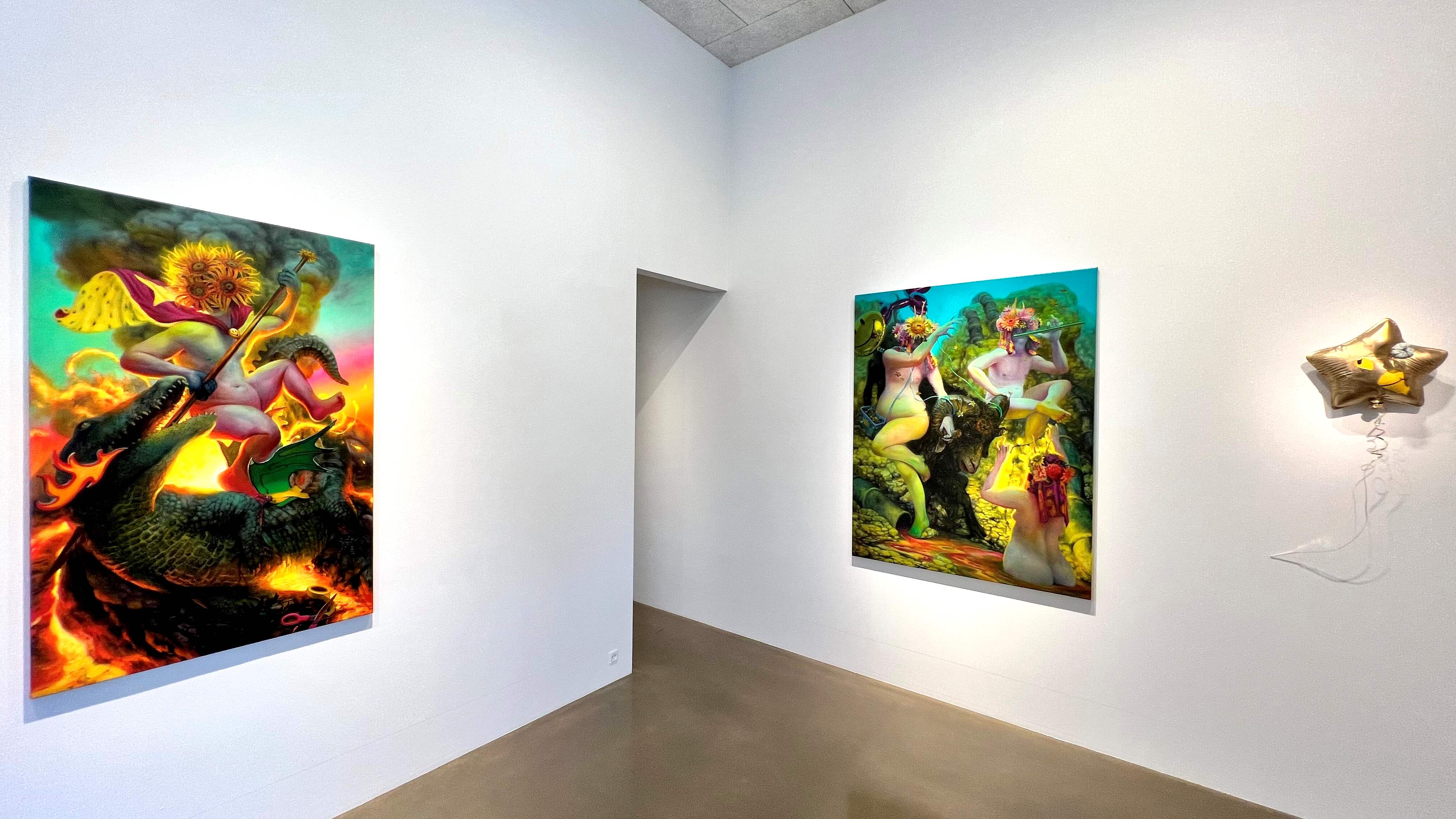 The exhibition presents seven large oil paintings and one sculpture