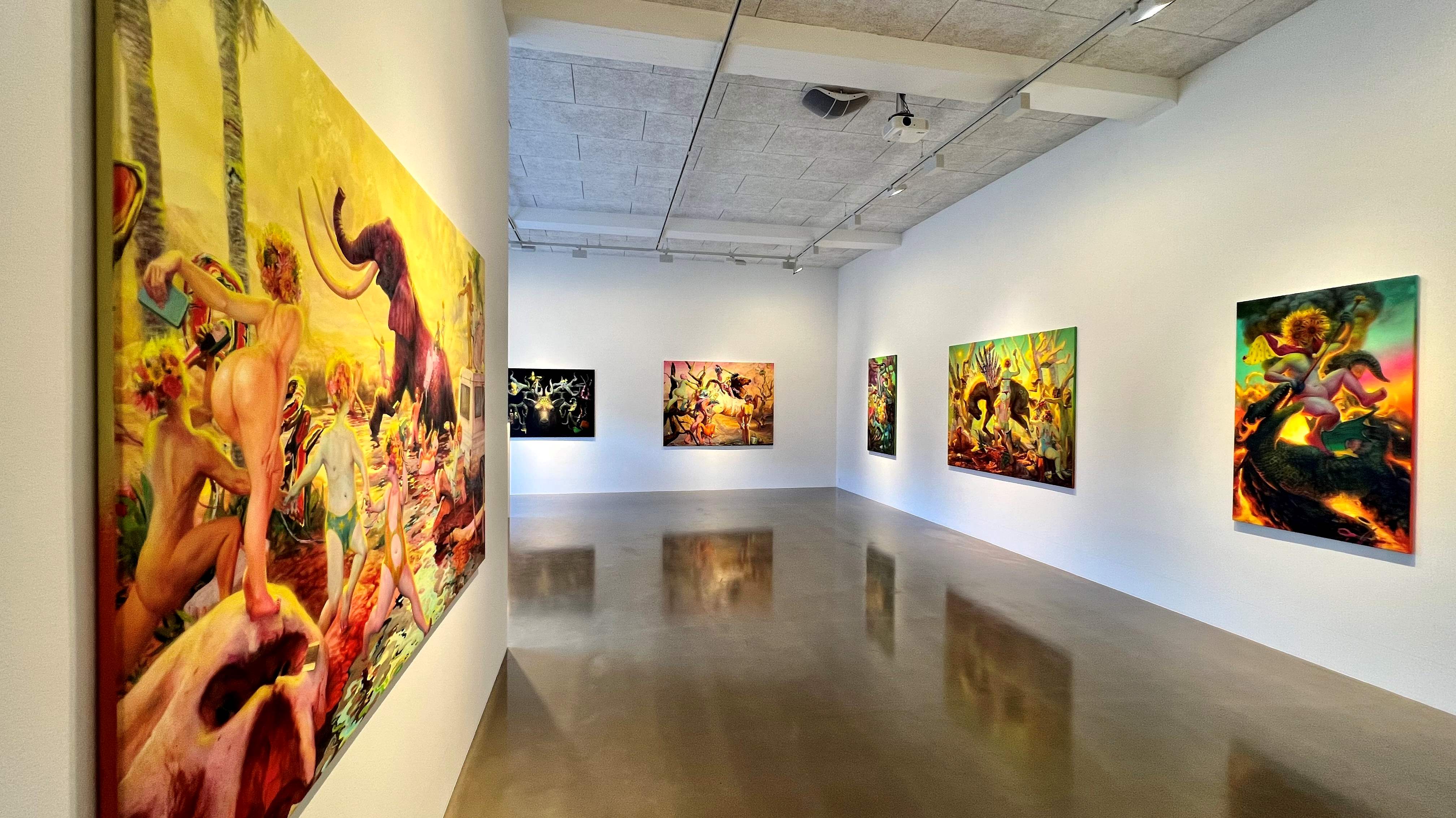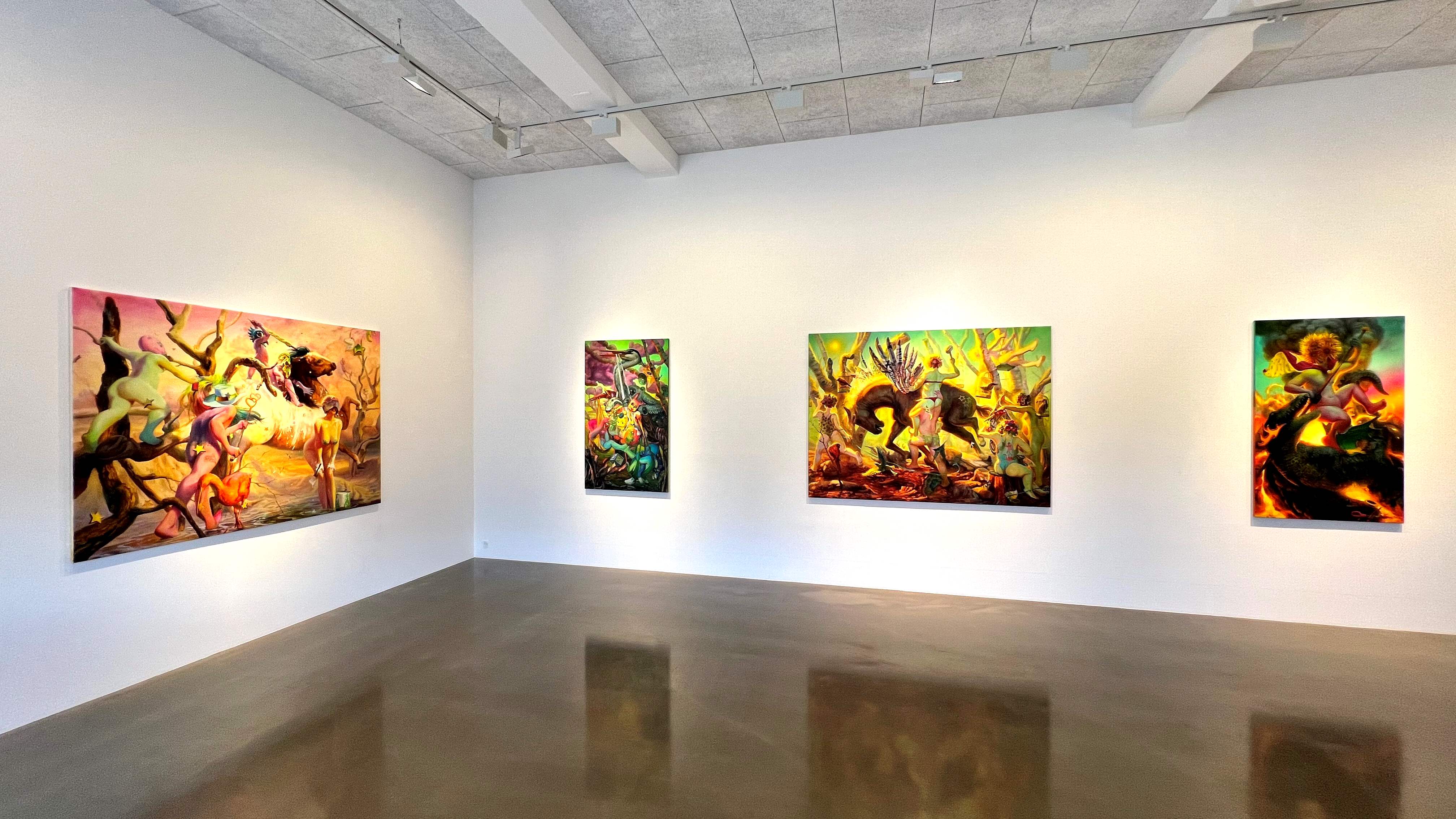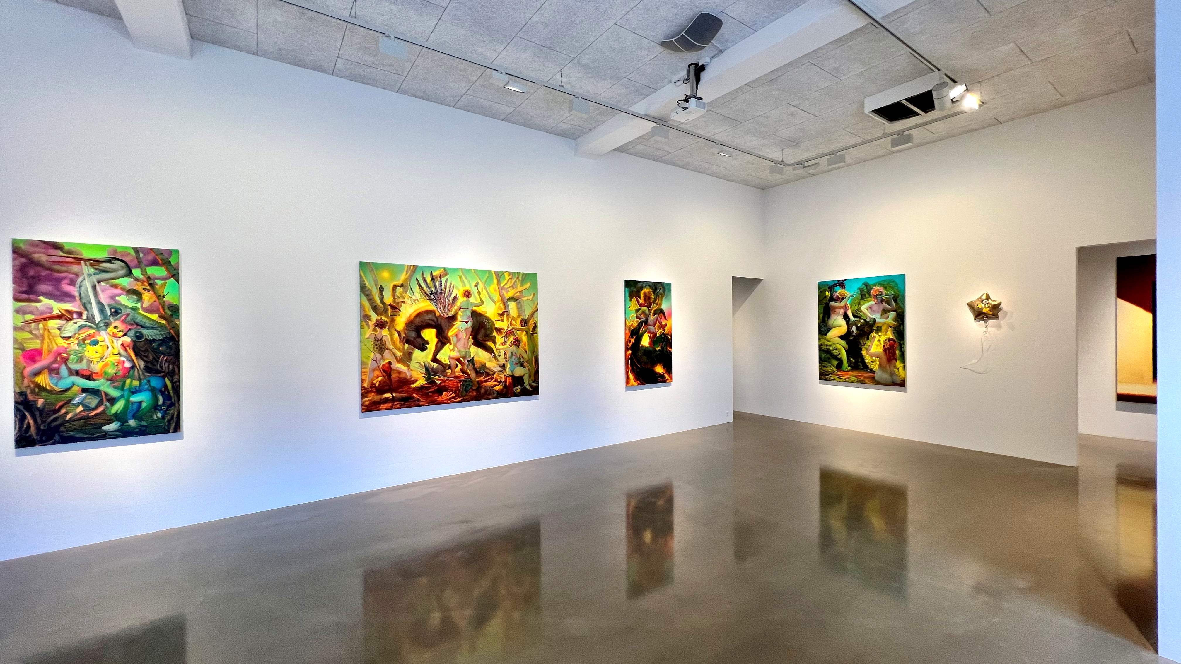 The exhibition presents seven large oil paintings and one sculpture
