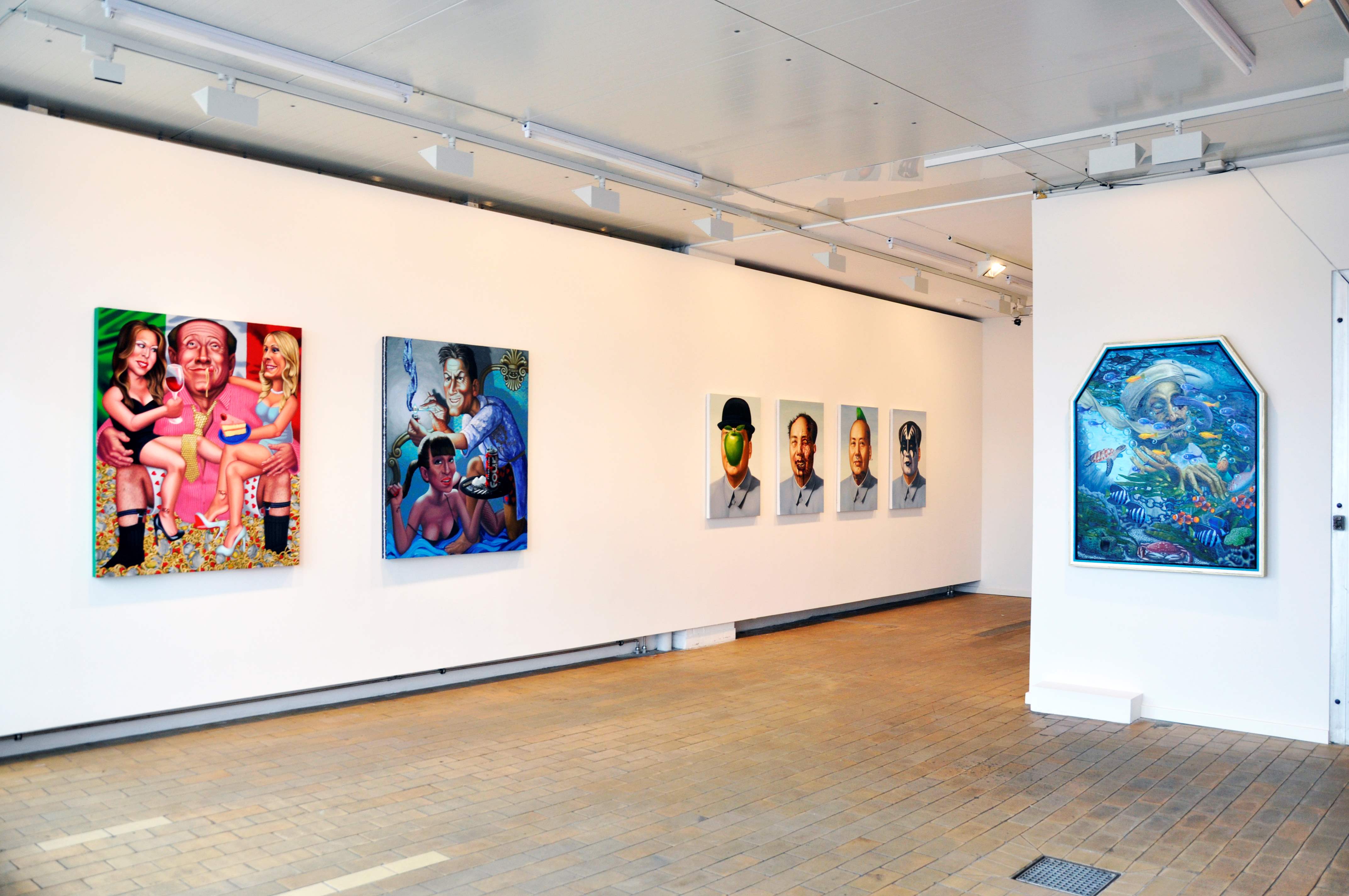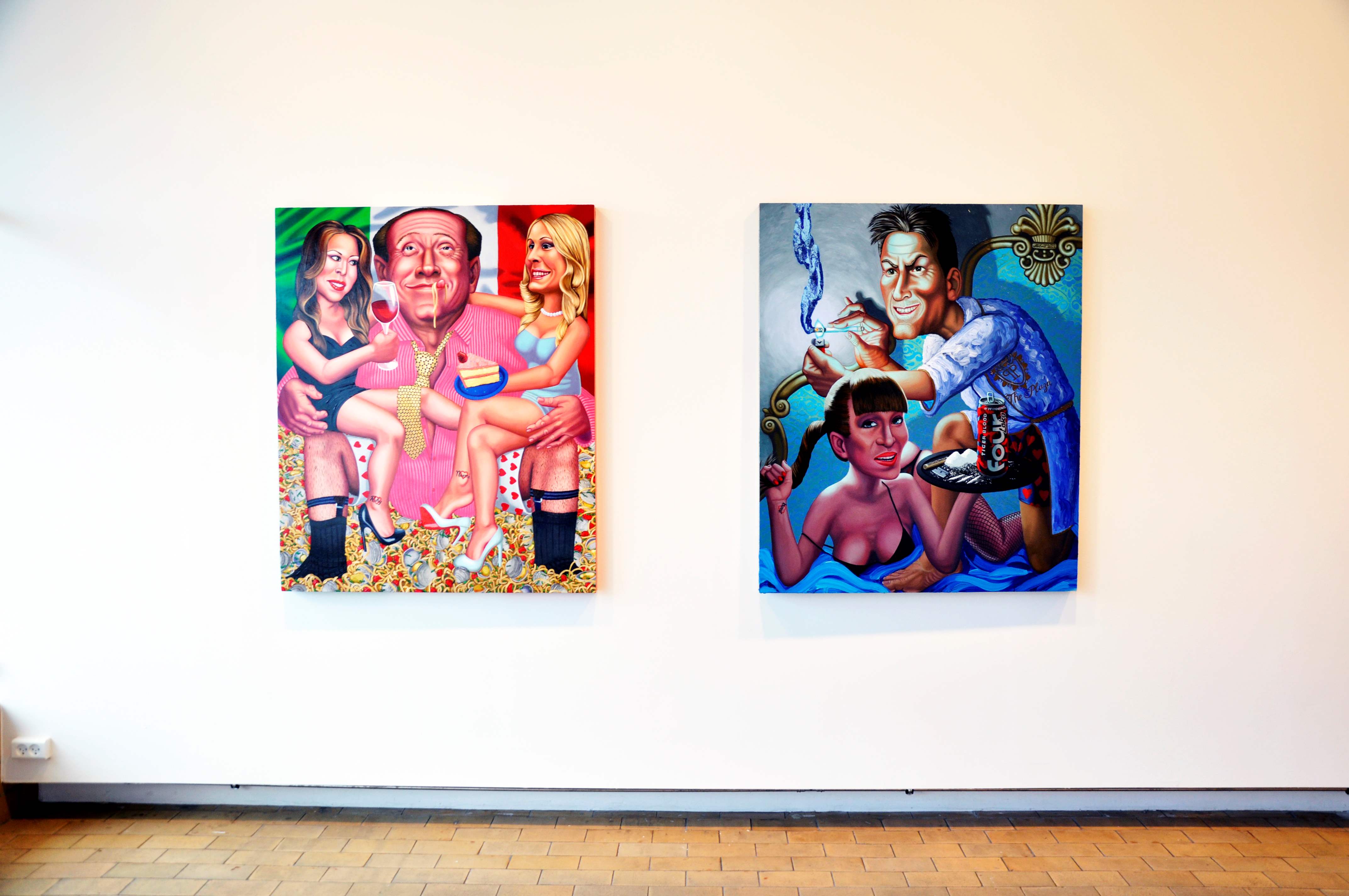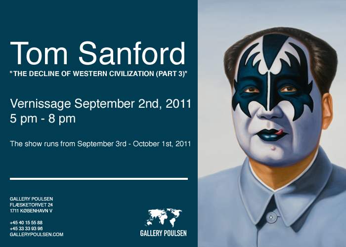 For his first solo exhibition at Gallery Poulsen, Tom Sanford's work continues to reflect the artist's ambivalent fascination with a culture that is driven by the 24-hour news cycle, hungry for scandal and obsessed with celebrity. Sanford's paintings use a variety of genres to present the villains and victims, the tragedies and triumphs of the moment. The story of the hijacked Mersk Alabama and the rescue of Captain Richard Phillips by the USS Bainbridge are presented as a history painting akin to Géricault's Raft of the Medusa. The recently deceased British rock bad girl, Amy Winehouse, is painted as an icon to be venerated by her fans. The seamy exploits of anti-heros Charlie Sheen and Silvio Berlusconi are painted in a garish, yet beautiful tableaux; these paintings are part renaissance painting, part low brow political cartoon. Sanford's work is hybridized and bastardized like the culture it emerges from.