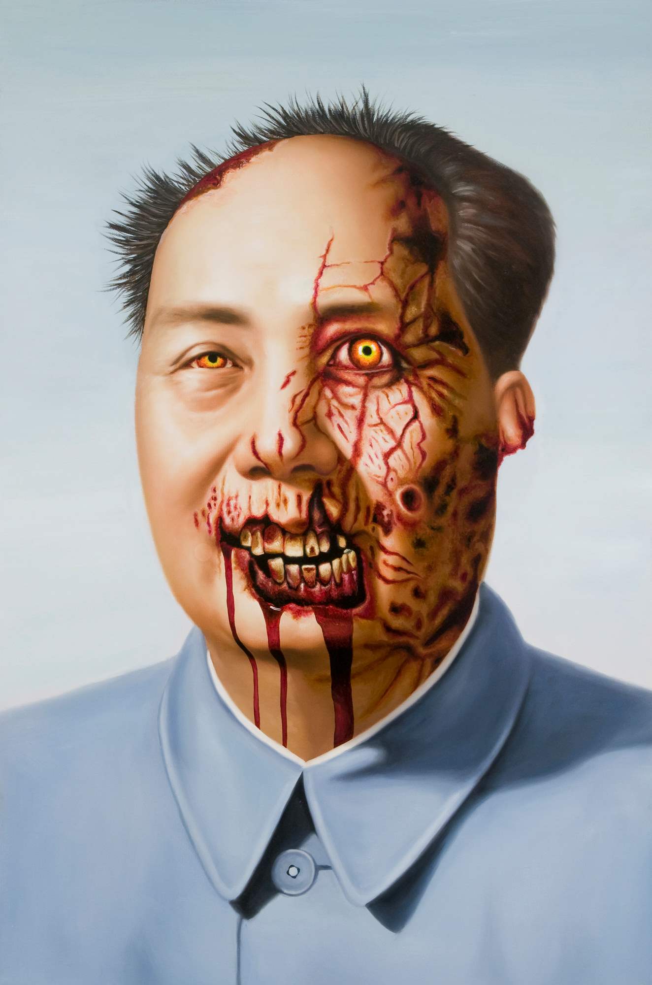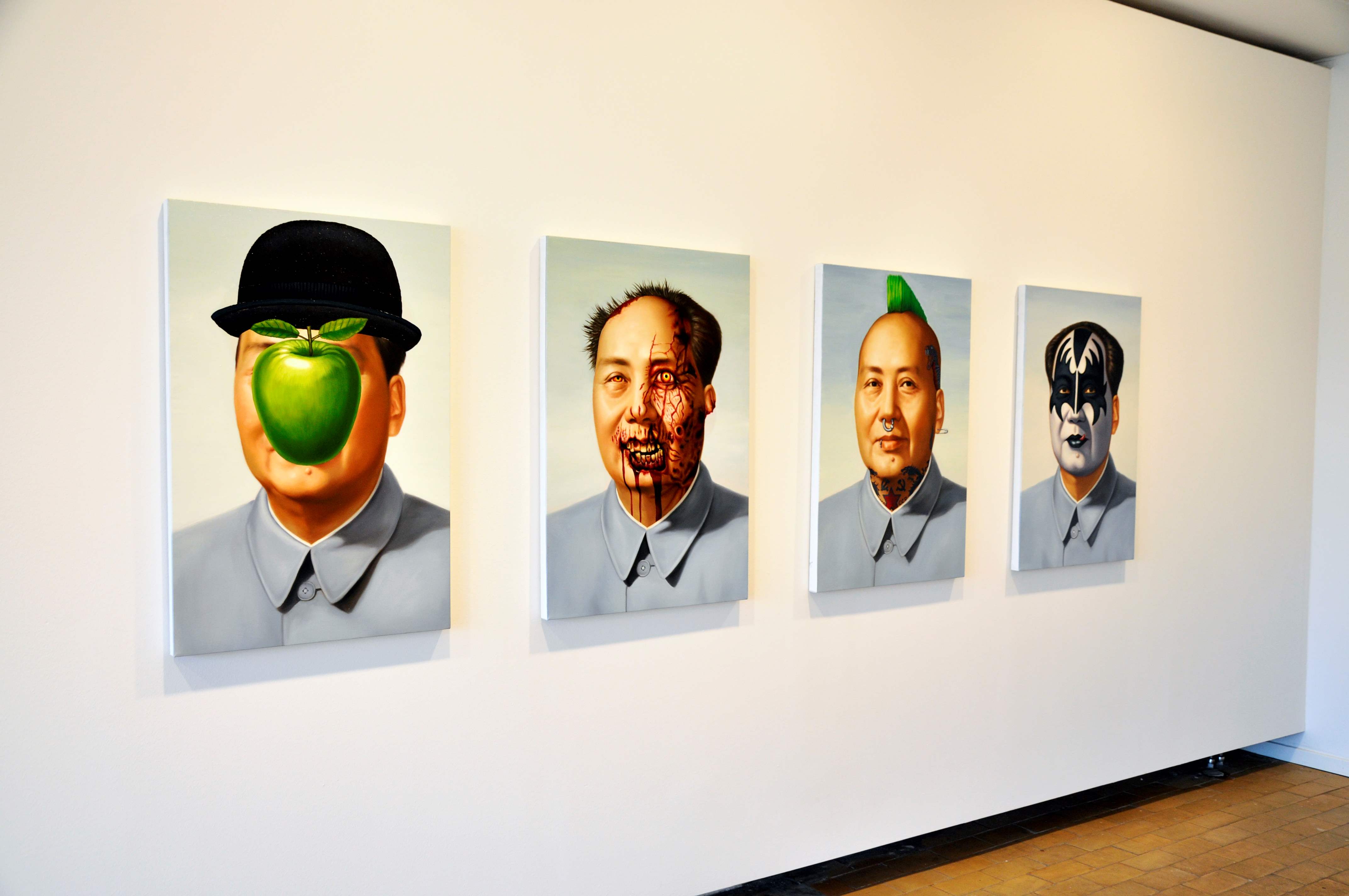 In the four Custom Mao paintings, Sanford shifts genres to the conceptual. Sanford takes advantage of globalization in his production by outsourcing a large part of the labor to China, and then adding the intellectual property himself in America. The artist has commissioned Chinese painters to paint copies of the famous state portrait of Mao Zedong, on which Warhol based his 1973 silk screen paintings of Mao. The paintings are then shipped to Sanford's New York studio, where he "customizes" them by altering the paintings to become cultural archetypes from his western cultural milieu. Through this conceptually driven means of art production, as well as the juxtaposition of eastern and western cultural iconography, the artist comments on the shifting dynamics of global cultural and economic power at the end of the American century.