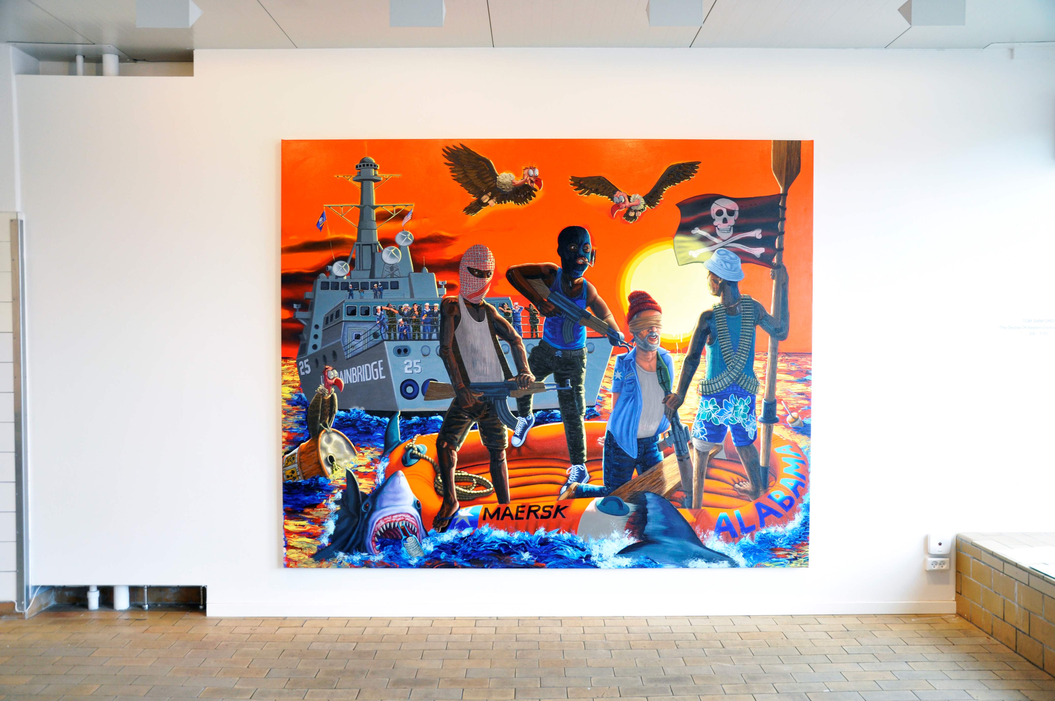I hans første solo-udstilling hos Gallery Poulsen fortsætter Tom Sanford sit arbejde med at afspejle kunstnerens ambivalente fascination af en kultur drevet af en 24-timers nyheds cyklus. Sultne efter skandaler og besatte af berømmelse. Sanfords malerier benytter en række forskellige genrer til at præsentere skurke og ofre, samt øjeblikkets tragedier og triumfer. Historien om det kaprede Mærsk Alabama og USS Bainbridge’s redning af Kaptajn Richard Phillips, præsenteres som et historisk maleri med reference til Géricaults maleri ’Raft of the Medusa’.