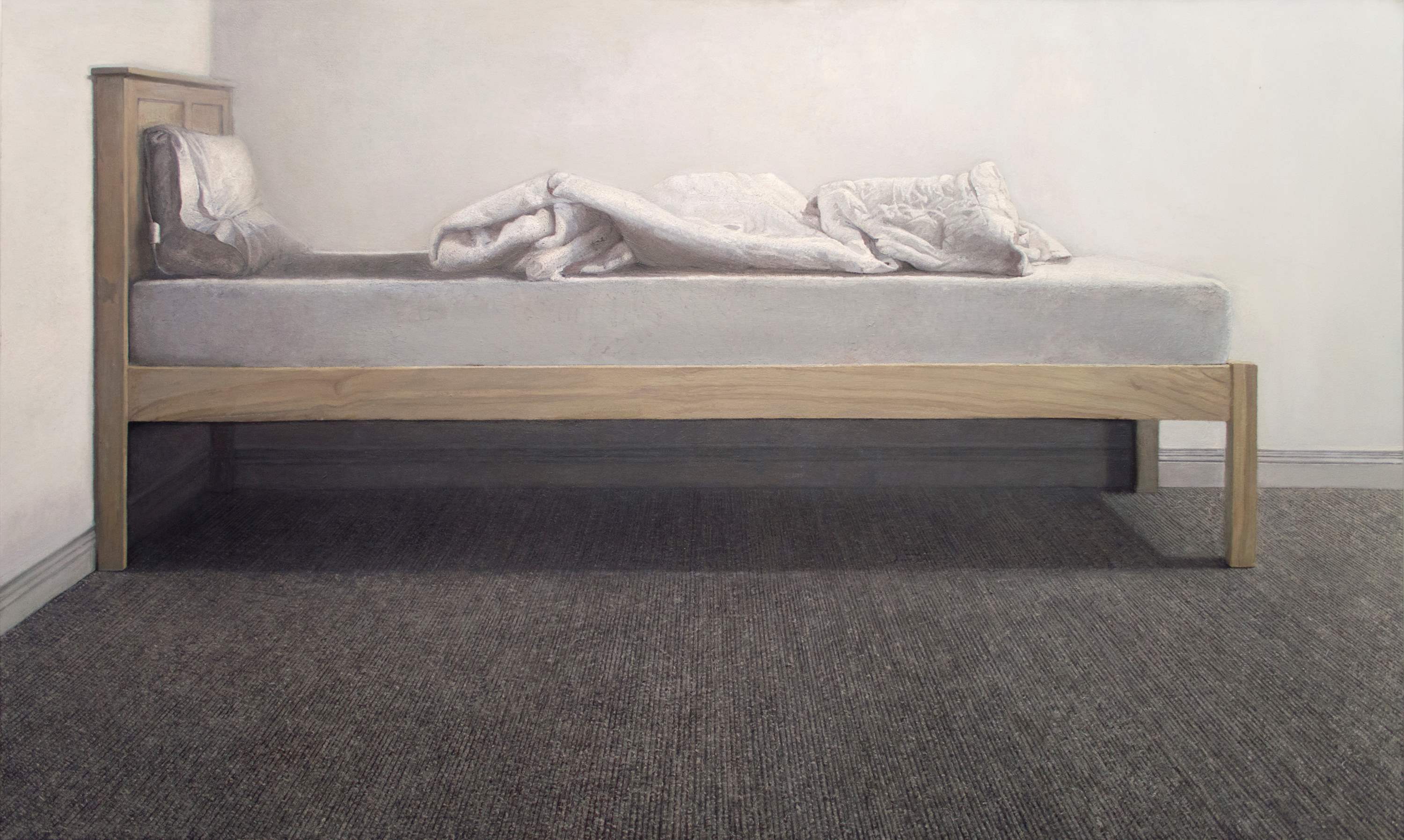 With yet a different approach than the two artists above Stephen Vollo represents the expected, familiar and domestic in his quiet and worked through paintings. As a kind of living Vilhelm Hammershøi he manages to show us new aspects of contemporary everyday life. Vollo paints an empty bed and the back of a grandma figure meticulously with heavy layers of paint, which turns them into delicate, calm and not least beautiful reliefs.