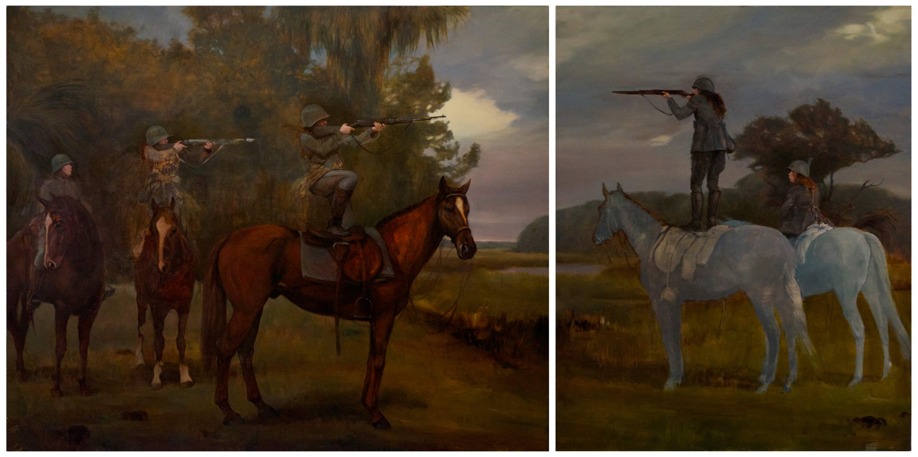 Abigail Schmidt opererer ved første øjekast inden for genren historisk maleri, men hvis du kigger nærmere efter, finder du en masse dragende tvist som udmagrede heste og anti-heroiske soldater, der utvivlsomt gør hendes værker nyskabende og nutidige. På en bizar men dog overbevisende måde blander Schmidt usammenhængende elementer som amerikansk landskab med tyske soldater, hvilket resulterer i absurde allegorier om forfald og uro.