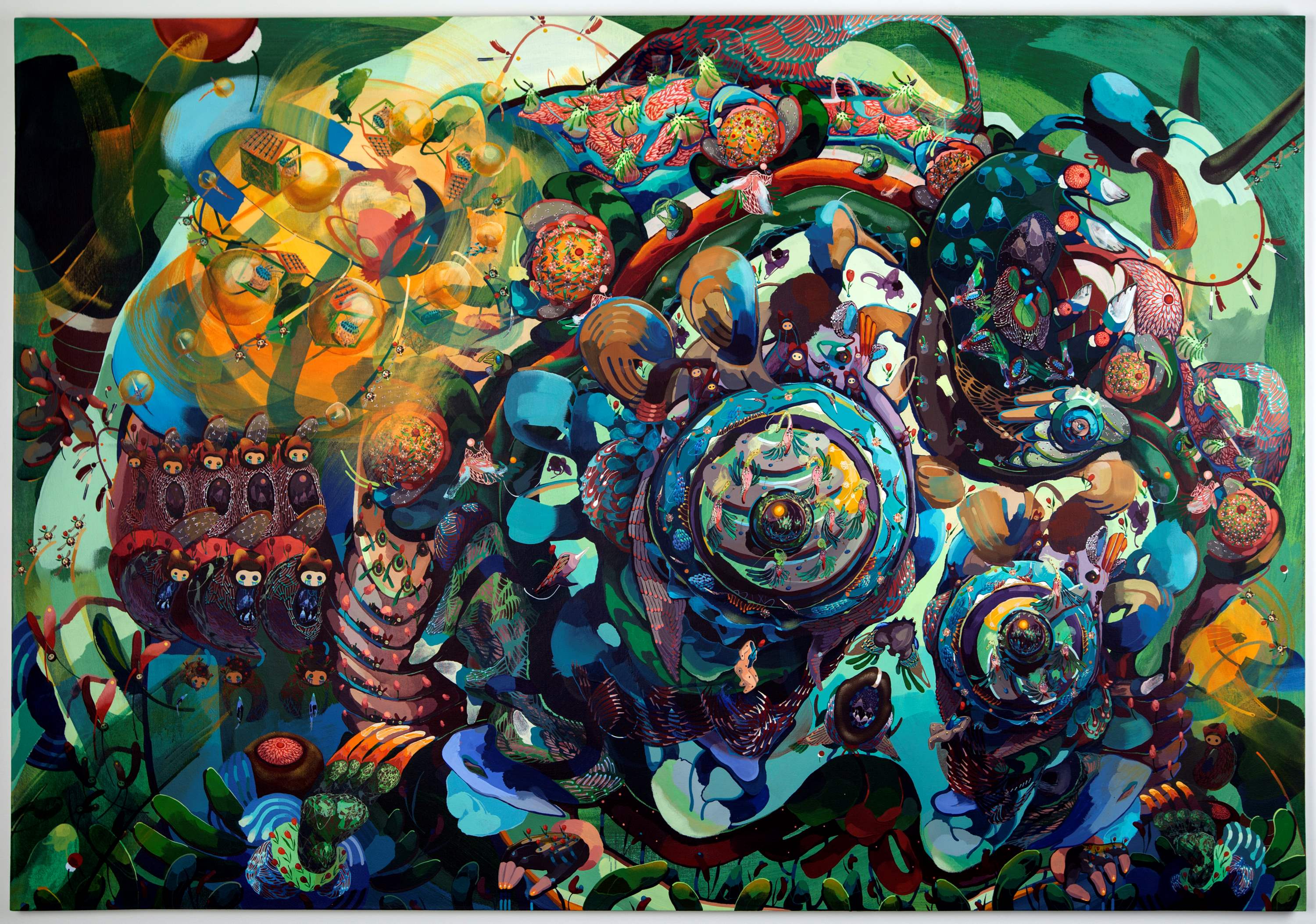 The paintings are detailed and imaginative pictures of an imaginary micro cosmos. The artworks are like a close-up of organisms and what we are unable to see with the naked eye. Mi Ju has titled the exhibition "Seed Bomb" and adds: ”the theme comes from the idea of the microcosmic world that contained in plant seeds. This small grain that is found anywhere contains a hidden complexity.