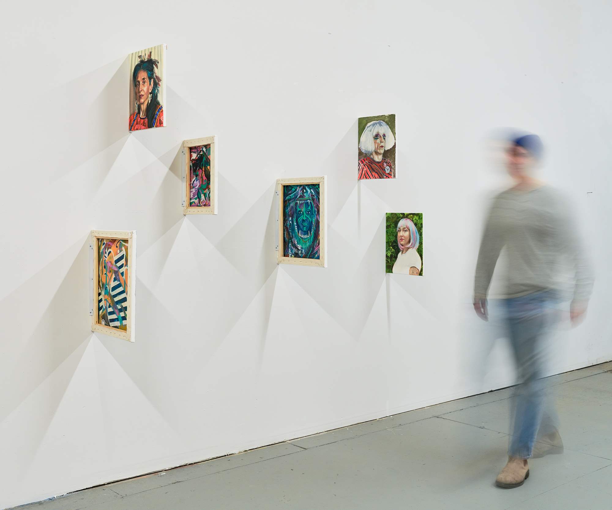 In Andy Cross’s works, we are exposed to a kinetic universe of bold, kaleidoscopic and engaging paintings depicting portraits of friends in personal prismatic universes. Painted on double-sided canvases that are placed perpendicular to the wall, Cross’ works allow for a dynamic viewing experience, activating the space around them.