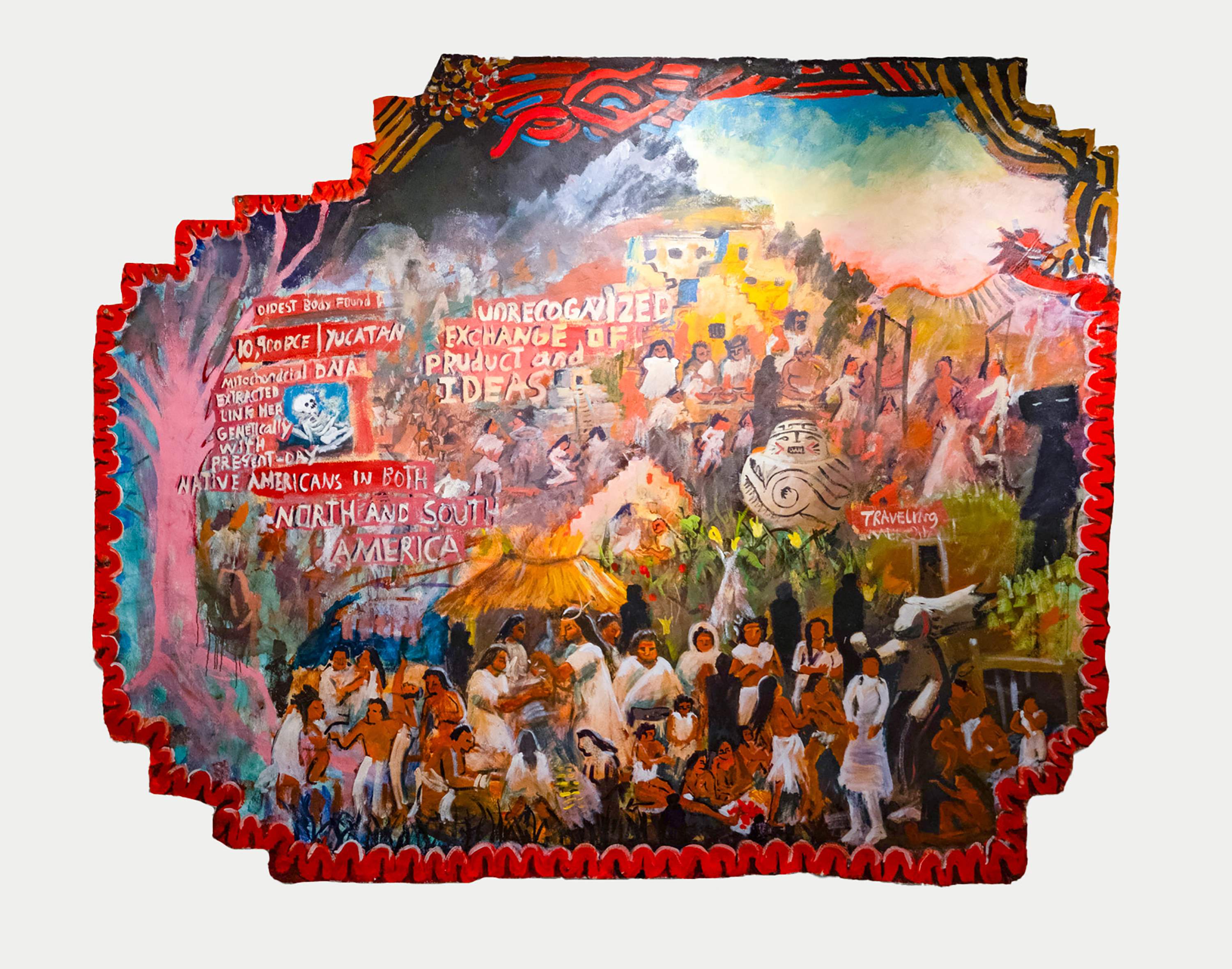 It is with immense pride that we can announce that The Gochman Collection which works to support and promote Indigenous leadership in the arts and beyond has acquired Hernandez’s work “Unrecognized Exchange”. This work depicts the thriving cultural meeting hubs and trade routes that have existed between North and South America, in which Indigenous people from North and South America met with one another and shared goods, services, ideas and knowledge.